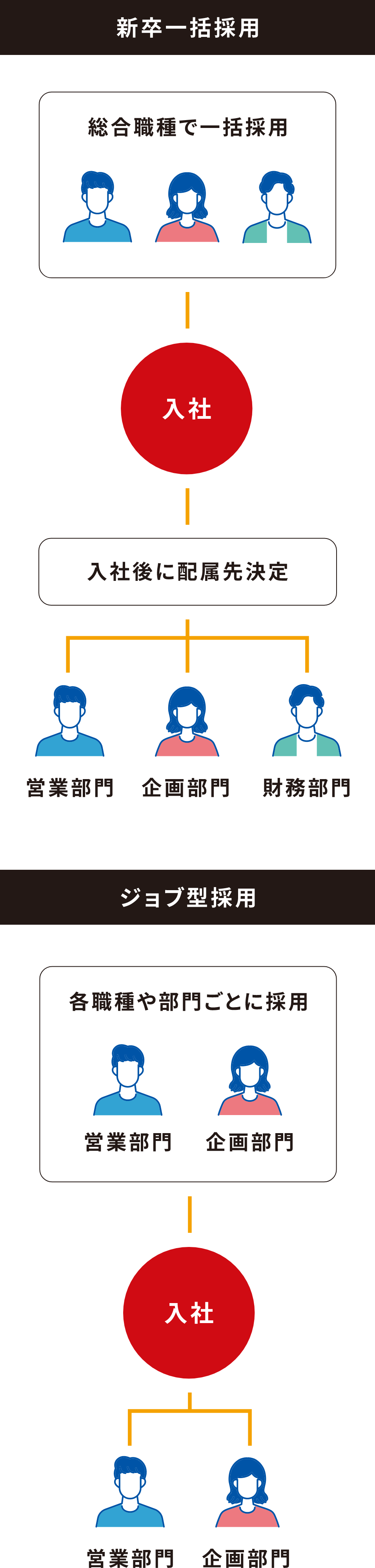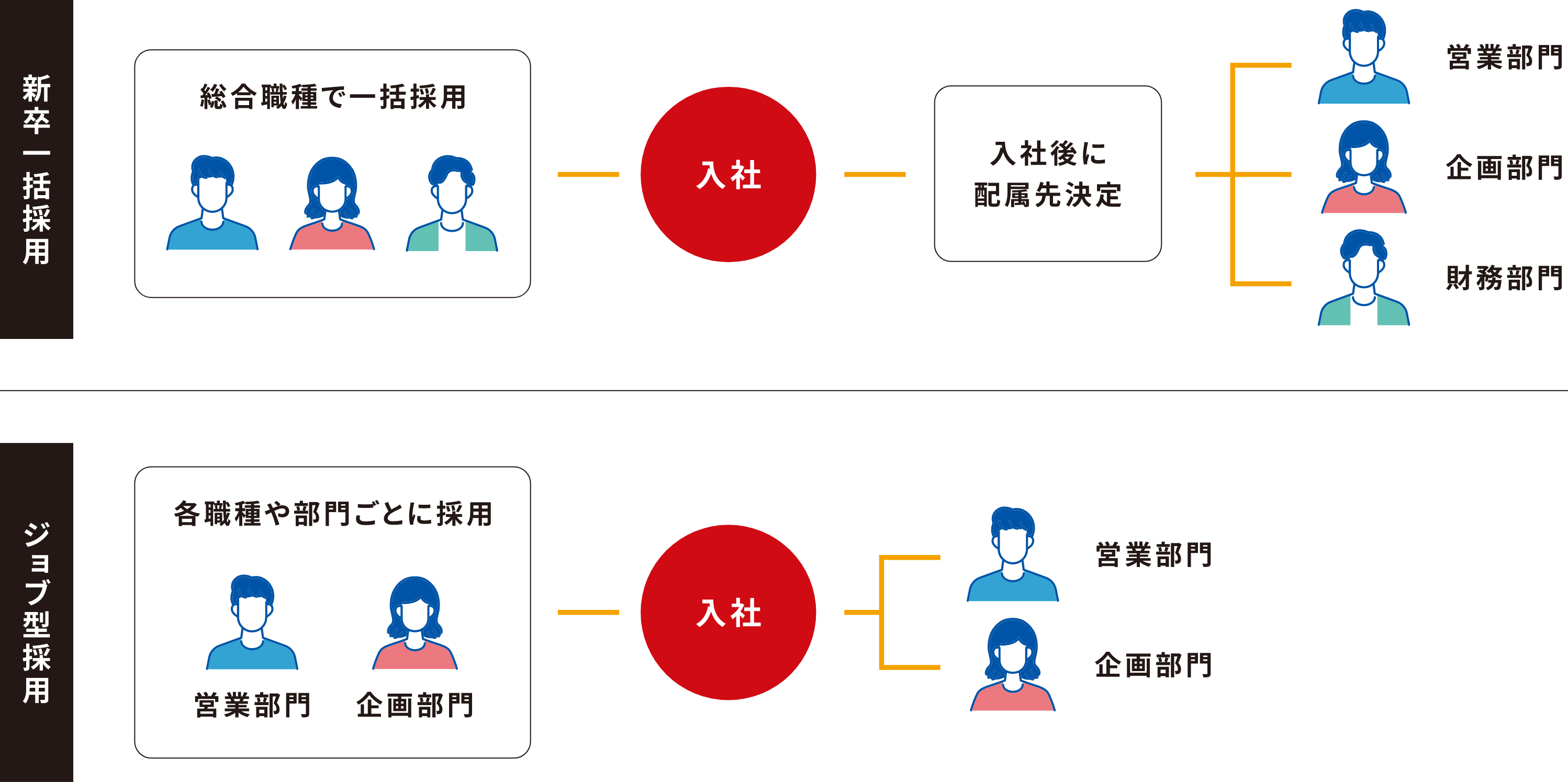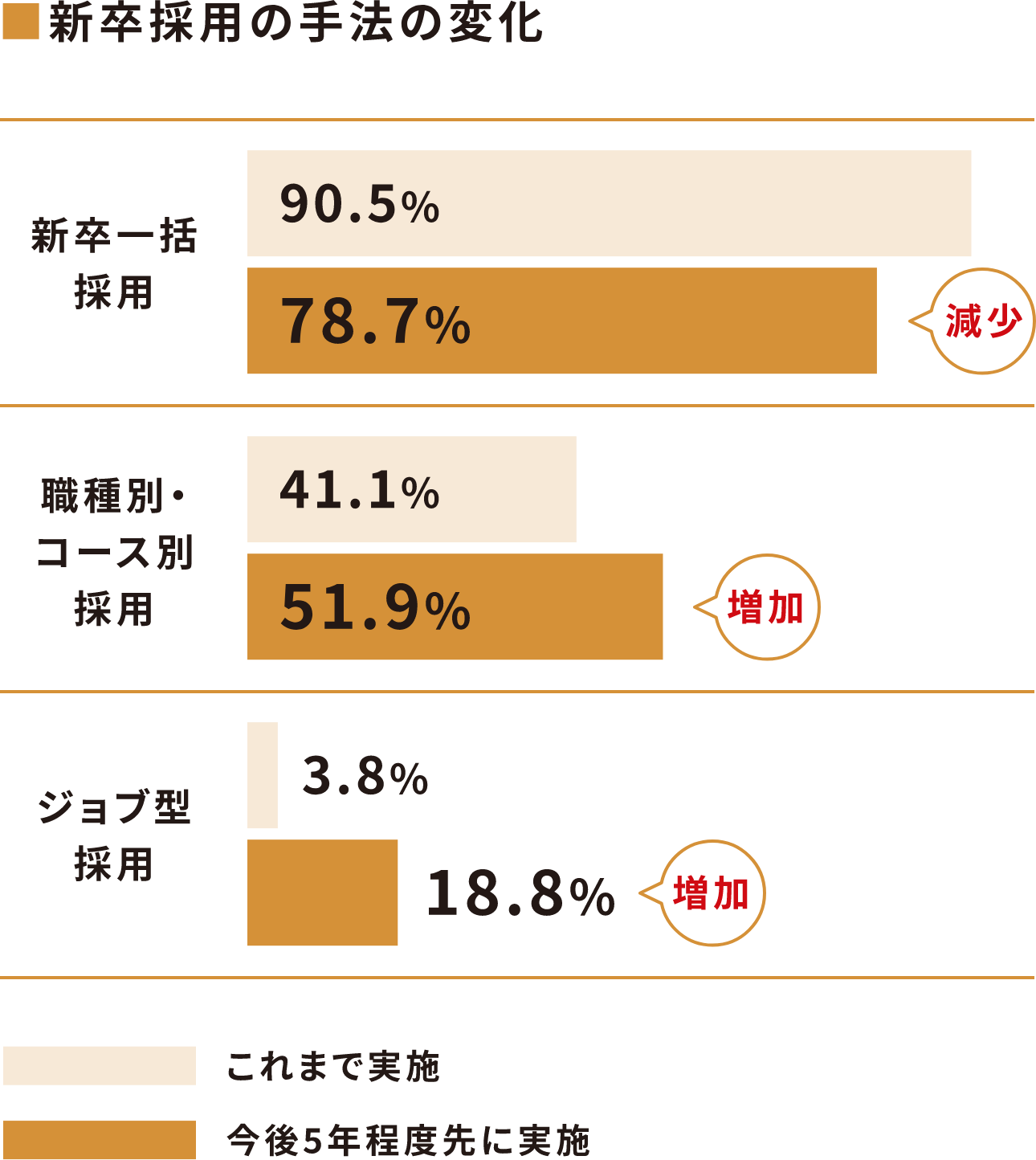 これまでの新卒採用は「総合職」と称される総合採用が主流で、学生が希望する職種と企業が配属する職種のアンマッチが起きることもしばしばあり、最近では「配属ガチャ」と呼ばれることも。アンマッチによる早期離職やモチベーション低下などが課題化する中、増加し始めているのが「ジョブ型採用」と呼ばれる、職種・コース別の採用形式です。入社時点での職種を選べるため、入社後のアンマッチを防げるのがメリットですが、「やってみたら向いていなかった」ということも。学生は大学生活を通して、自身の強みや得意なことを見つけ、どんな仕事をしたいのかを考える必要があります。