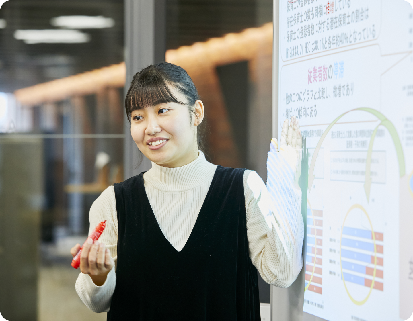 インターンシップ参加が重要な役割を果たす現代の就職活動で、インターンシップ支援をする大学は珍しくないですが、多くの大学では学生の任意参加です。それに比べ名古屋学院大学は、3年次の学生を対象とした「就職ガイダンス」を必須参加として開催しており、インターンシップ参加への重要性やこれから対面する就職活動のポイントを指導しています。そして参加の有無を保護者へ共有するなど、すべての学生が就職活動をスムーズにスタートできるように支援しています。「具体的にどうしたらよいのかわからない学生」を無くせるように、積極的に手厚くサポートする体制があるのも魅力です。