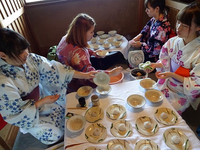 次に、留学生のみなさんに茶道体験として、個別にお茶をたててもらいました。おもてなし部の学生がお手本を見せ、それをまねて留学生がお茶を点てます。実際に体験すると、茶筅を動かすことの難しさに驚いたり、上手に立てる友達を見て歓声をあげたり、「やっぱり自分で立てた抹茶はおいしい!」と喜んだり、終始、和やかな雰囲気でした。