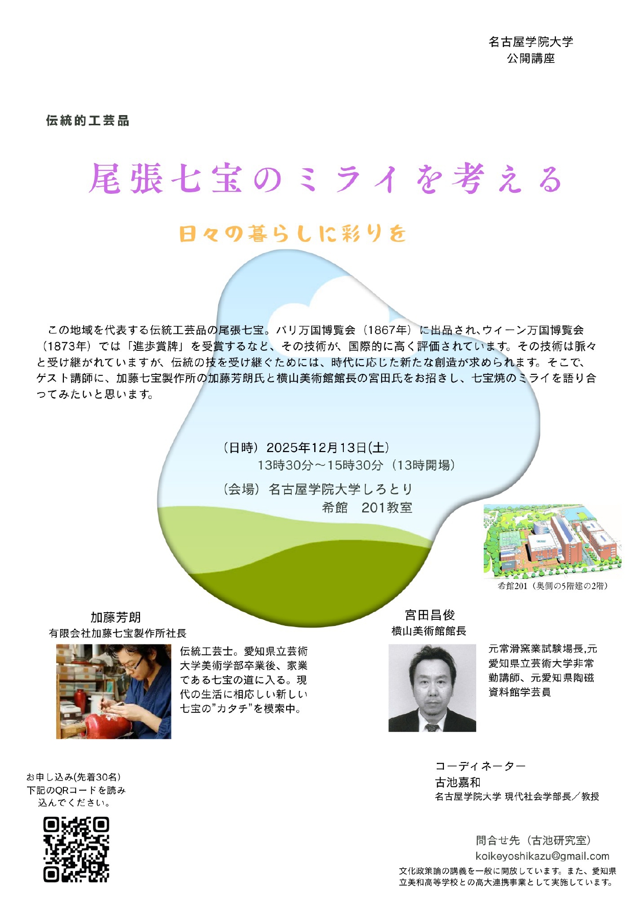 この地域を代表する伝統工芸品の尾張七宝。パリ万国博覧会(1867年)に出品され、ウィーン万国博覧会(1837年)では「進歩賞牌」を受賞するなど、その技術が、国際的に高く評価されています。その技術は脈々と受け継がれていますが、伝統の技を受け継ぐためには、時代に応じた新たな創造が求められます。そこで、ゲスト講師に、加藤七宝製作所の加藤芳朗氏と横山美術館館長の宮田氏をお招きし、七宝焼のミライを語り合ってみたいと思います。【定員30名/参加無料】