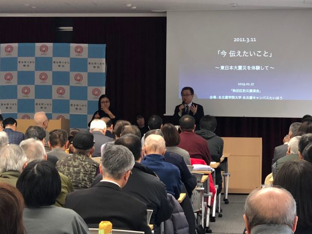 1月27日(日)に、熱田区防災公開講座を本学名古屋キャンパスたいほうメアリーホールにて開催いたしました。この講座は、災害に関する啓発を目的として、例年、防災とボランティア週間(毎年1月15日~21日)に合わせて実施されております。今年度は、本学名古屋キャンパス近隣の船方学区を中心に、180名ほどの地域住民が来場しました。講師の陸前高田市教育長金氏からは、被災者の視点で発災から今日に至るまでの心境の変化が語られ、日頃の備えやコミュニティ連携の大切さを実感しました。