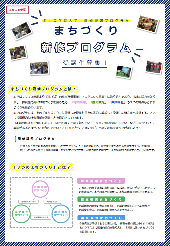 本プログラムは、その「まちづくり」に関連した授業科目を体系的に編成して受講生の皆さまへ提供することで、より積極的な社会貢献を図ることを目的としています。