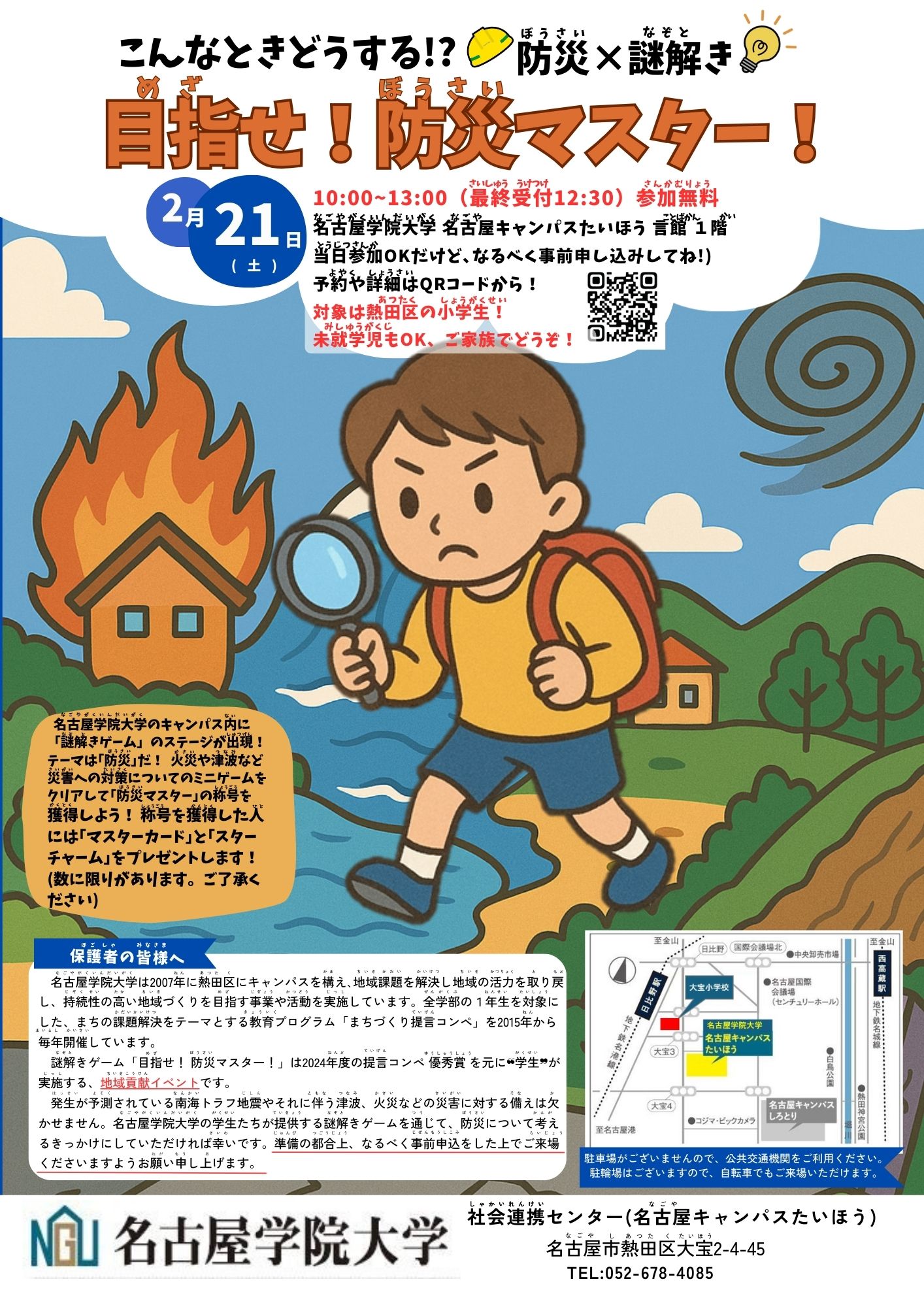 | 名古屋学院大学は2007年に熱田区にキャンパスを構え、地域課題を解決し地域の活力を取り戻し、持続性の高い地域づくりを目指す事業や活動を実施しています。全学部の1年生を対象にした、まちの課題解決をテーマとする教育プログラム「まちづくり提言コンペ」を2015年から毎年開催しています。 謎解きゲーム「目指せ!防災マスター!」は2024年度の提言コンペ優秀賞を元に“学生”が実施する地域貢献イベントです。 発生が予測されている南海トラフ地震やそれに伴う津波、火災などの災害に対する備えは欠かせません。名古屋学院大学の学生たちが提供する謎解きゲームを通じて、防災について考えるきっかけにしていただければ幸いです。 |