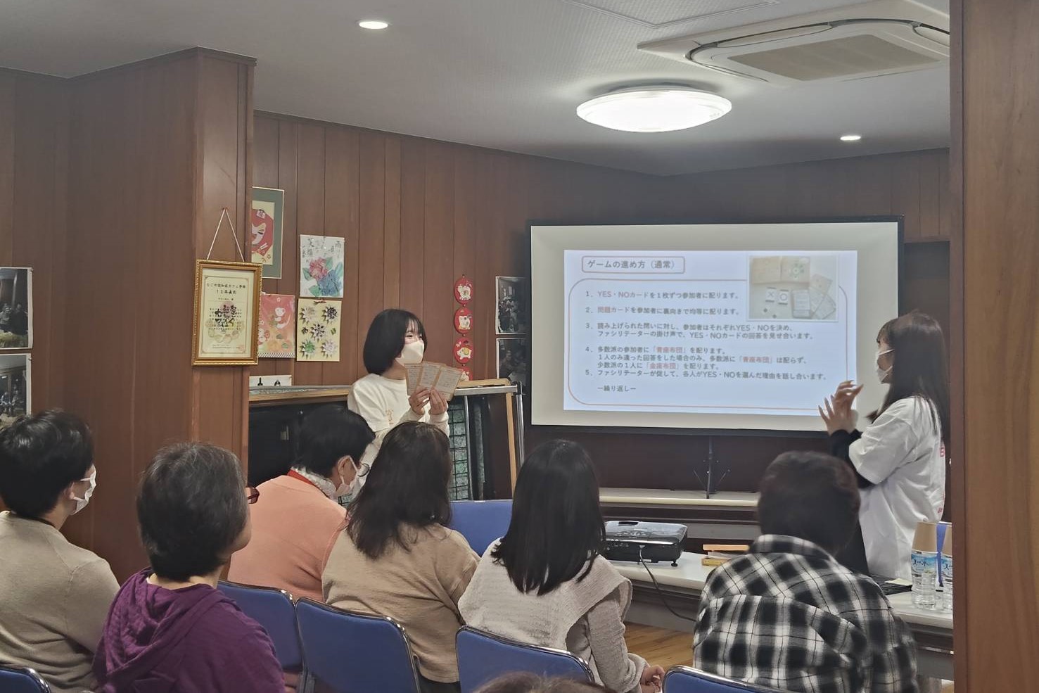 10月17日、大垣市「お勝山ふれあいセンター」において開催された公開講座に、メンバーの学生らが参加し、チームの活動紹介と「ヤングケアラー版クロスロードゲーム」の体験のワークショップを実施しました。当日は、行政職や福祉専門職、民生・児童委員など、地域で支援活動に携わる多様な立場の方々が参加し、定員を上回る参加者となりました。ワークショップでは、ヤングケアラーをめぐる様々な場面を題材にした問いに対して参加者同士が意見を交わし、それぞれ立場から当事者の状況を想起しながら考える時間となりました。役職や立場の異なる参加やが、自分の仕事や地域活動と重ね合わせながら意見を交わす姿がみられ、ヤングケアラーへの理解を深める貴重な機会となりました。