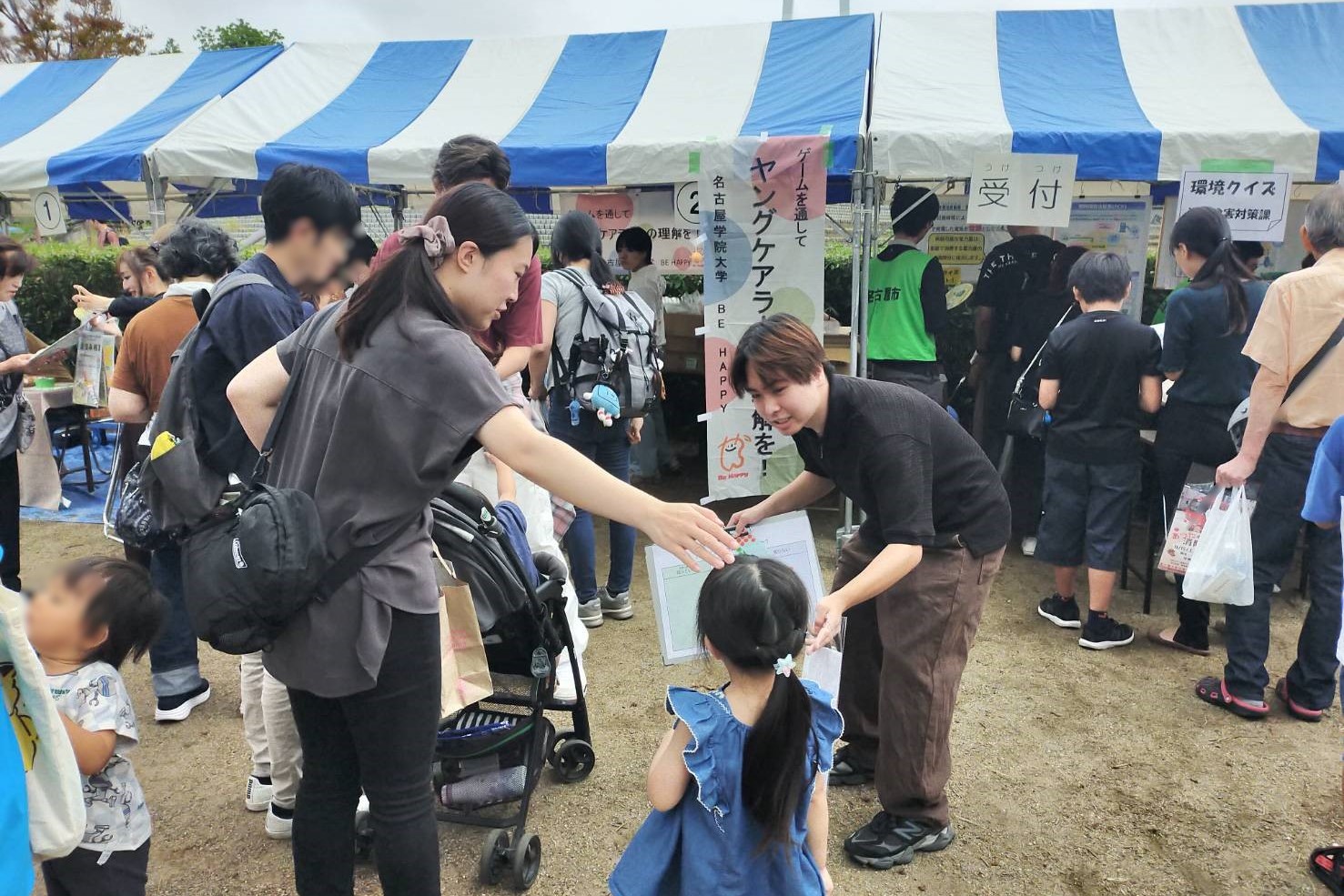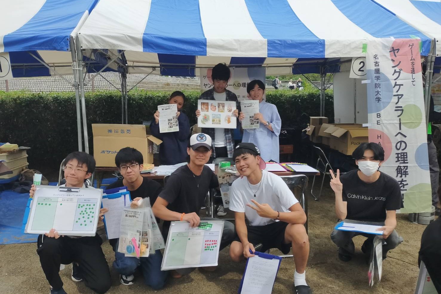 10月12日、白鳥公園で開催された「熱田区区民まつり」に「ダブルケア・ヤングケアラー啓発ブース」を出展しました。本イベントへの参加は2022年から継続しており、今年で4回目となります。BE HAPPYメンバーにとっても毎年恒例の地域活動として定着しています。特に今年は「上級まちづくり演習」受講学生も加わり、ブース運営を行いました。当日は「ダブルケア・ヤングケアラー認知度調査」のアンケート実施に加え、「ヤングケアラー版クロスロードゲーム体験会」や啓発グッズの配布を行いました。