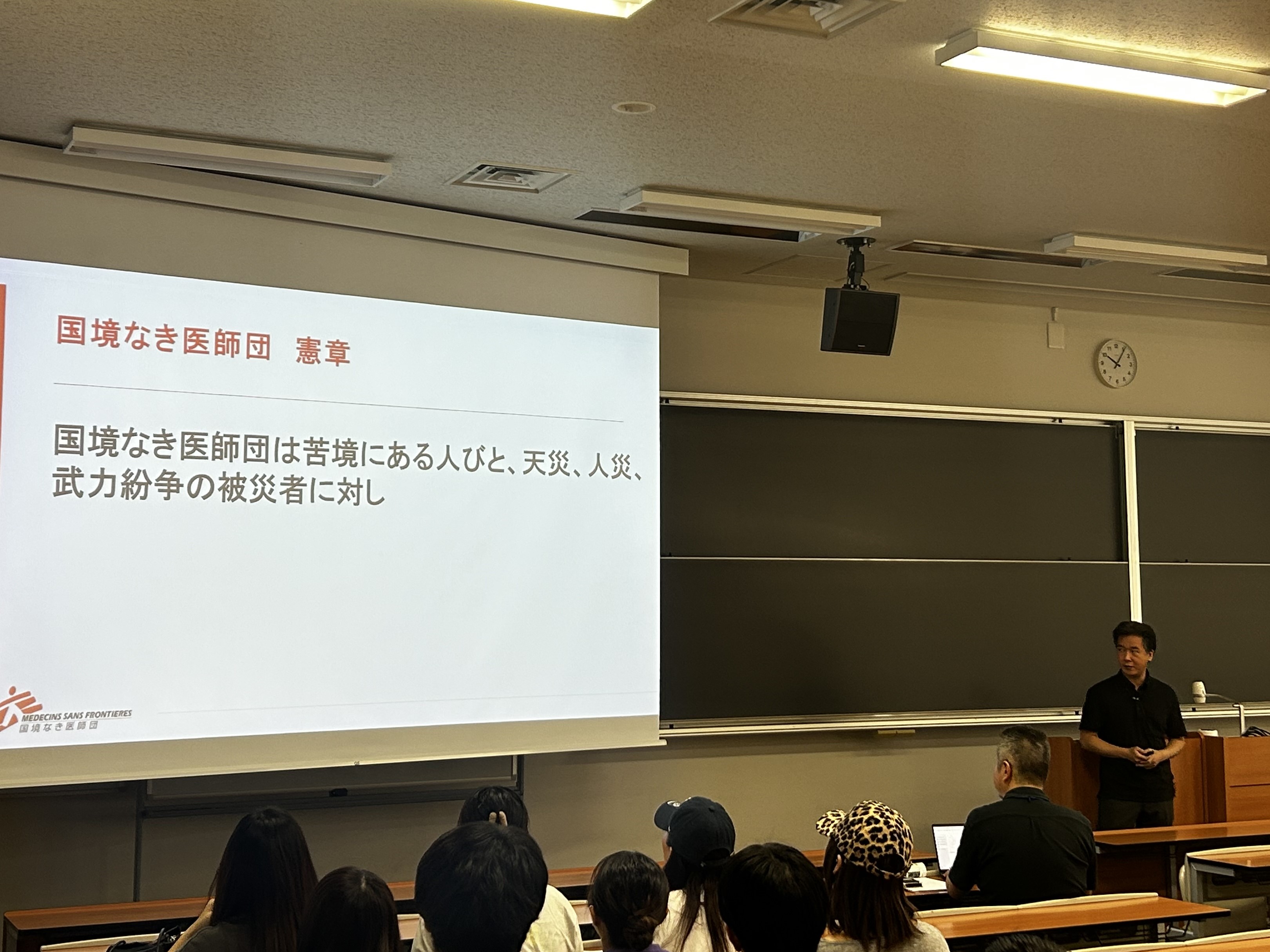 講演では、ガザ、シリア、スーダンなど世界各地で今も続く紛争の現状と、それに対する国境なき医師団の人道援助活動について紹介がありました。あわせて村田氏から「私たちはどう生きるか?」というメッセージが投げかけられ、戦後80年となる今年、世界で続く人道危機の実態を知るとともに、国境を越えて世界のために私たちができることを考える貴重な機会となりました。