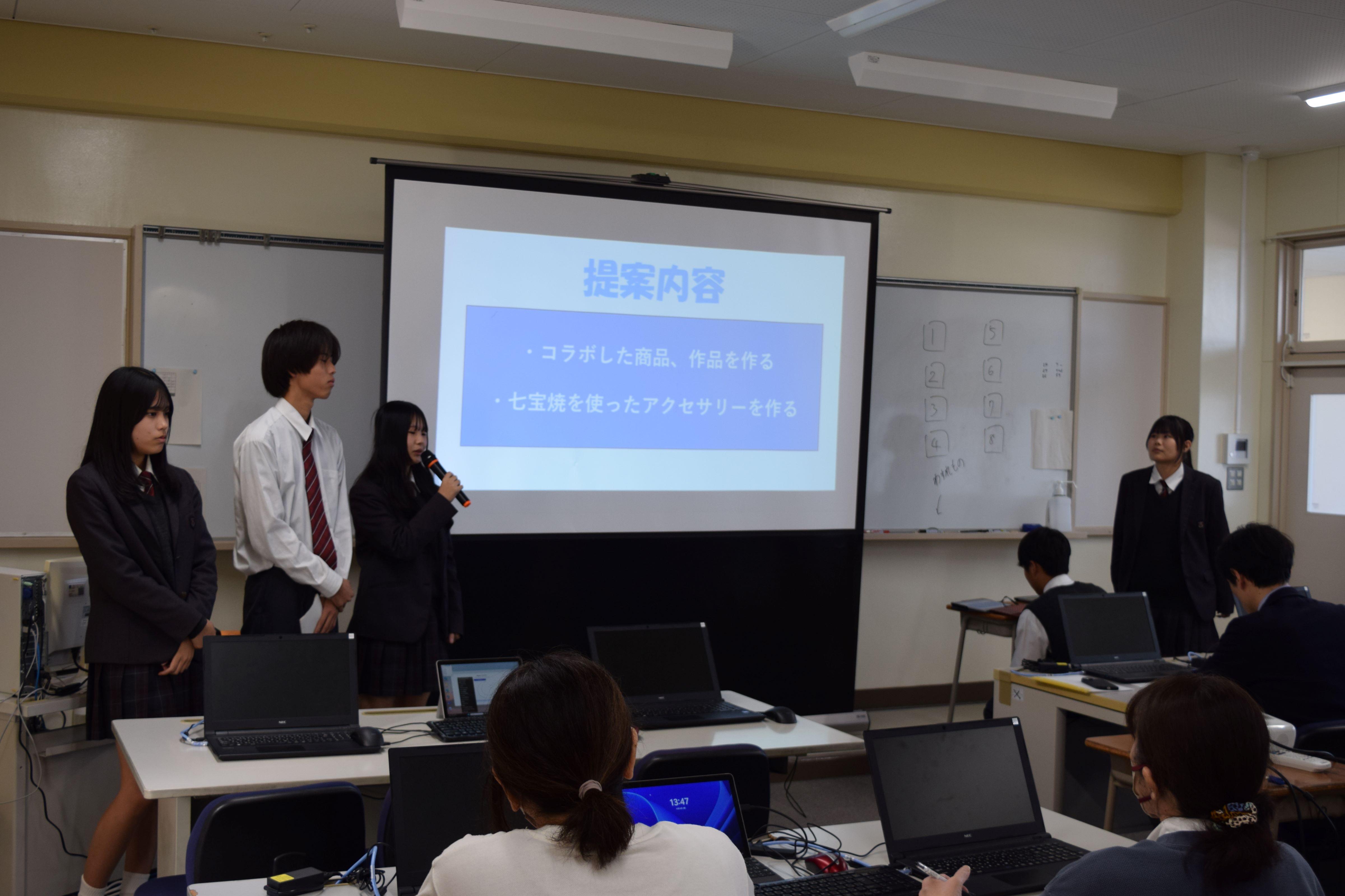 10月17日でのグループ討議を踏まえ、高校側が地元の「あま市七宝焼アートヴィレッジ」での体験学習やグループ討議を重ね、その結果報告会を開催しました。テーマは、若者世代に向けた七宝焼の商品開発の提案やアートヴィレッジの活用方法など、高校生の視点からのアイディアが披露されました。