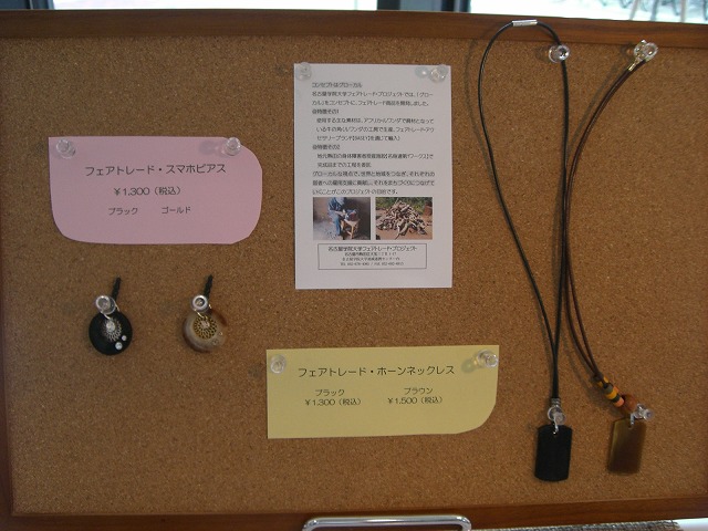 名古屋学院大学フェアトレードプロジェクトは、アフリカ・ルワンダの廃材であった牛の角をアクセサリー素材とし、地元熱田の身体障害者授産施設に加工を委託した、おしゃれなスマホピアスと男性用ネックレスの販売とパネル展示を行いました。多くの方々に、フェアトレードのことを知っていただき、興味をもっていただくきっかけとなりました。