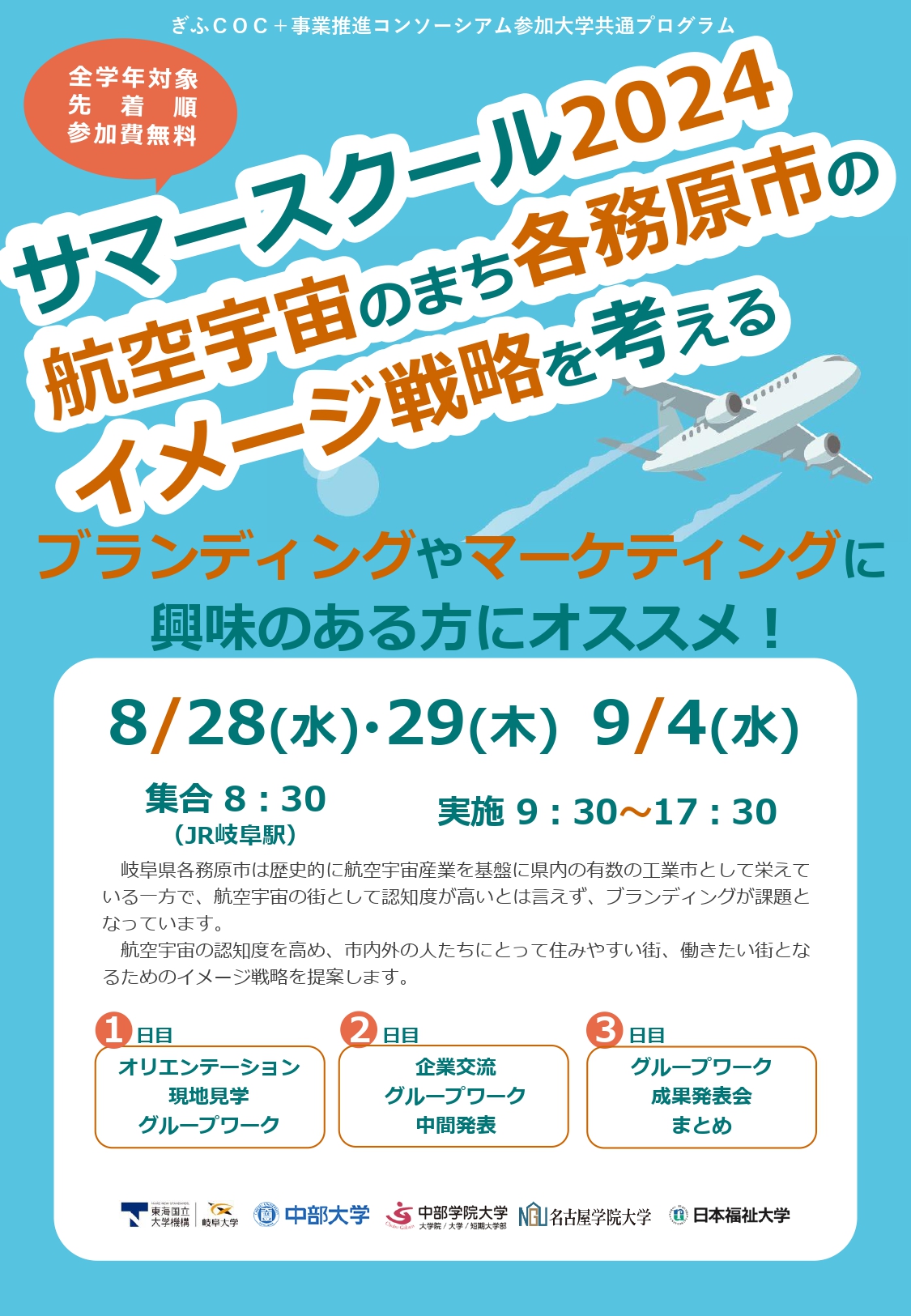COC+参加校5校共通のプログラムである「サマースクールin各務原」が8月28日、29日、9月4日の3日間の日程で実施され、コンソーシアム参加大学の学生20名が参加しました。各務原市商工振興課と連携して、「航空宇宙のまち、各務原市のイメージ戦略を考える」というテーマ課題に取り組みました。2024年度プログラムは、本学からの参加はありませんでした。