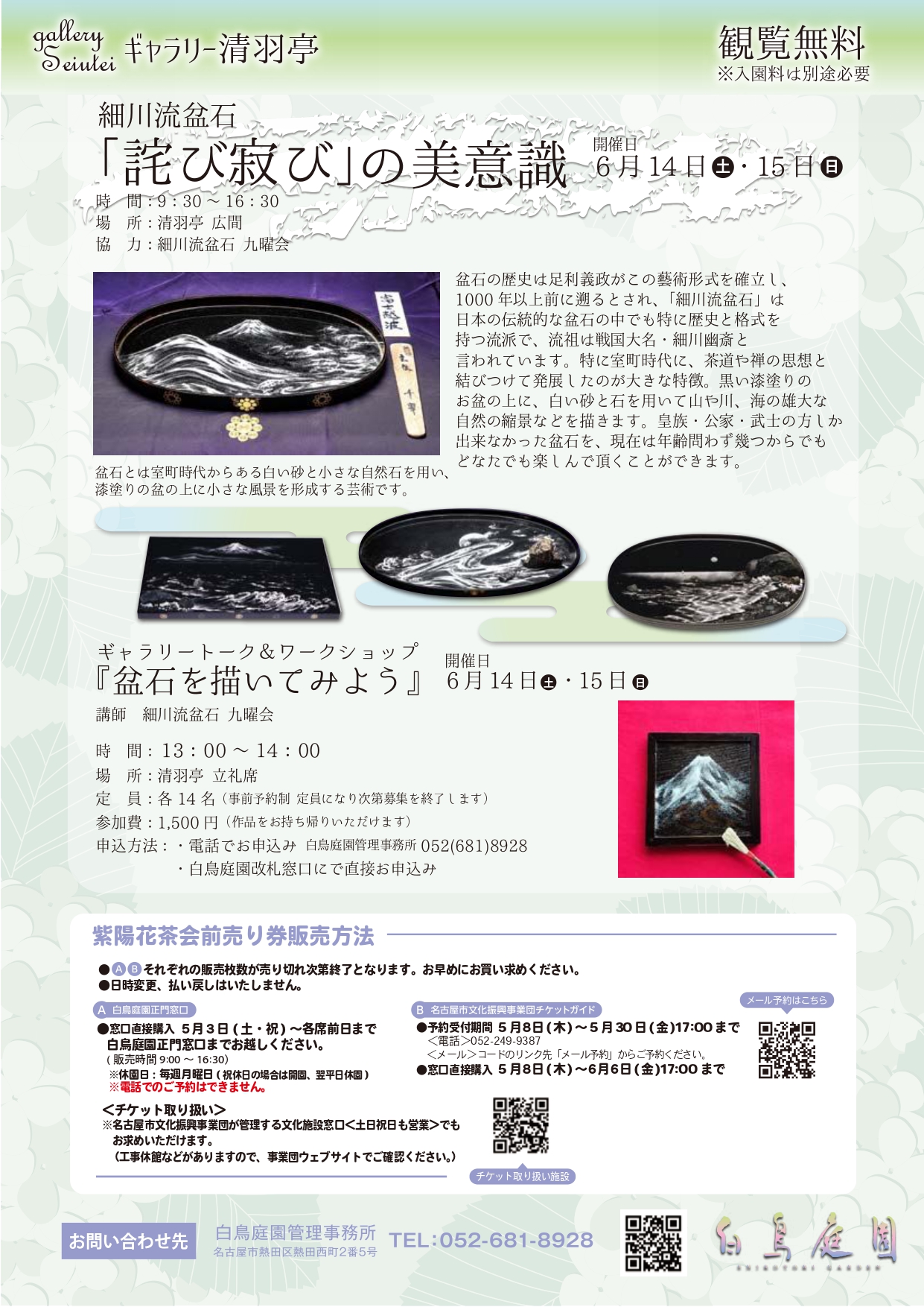 「茶会(前売り実施)」のほか、先着・無料で「ゆかたのフォトサービス」や「盆石」の展示など楽しい催しがありますよ!