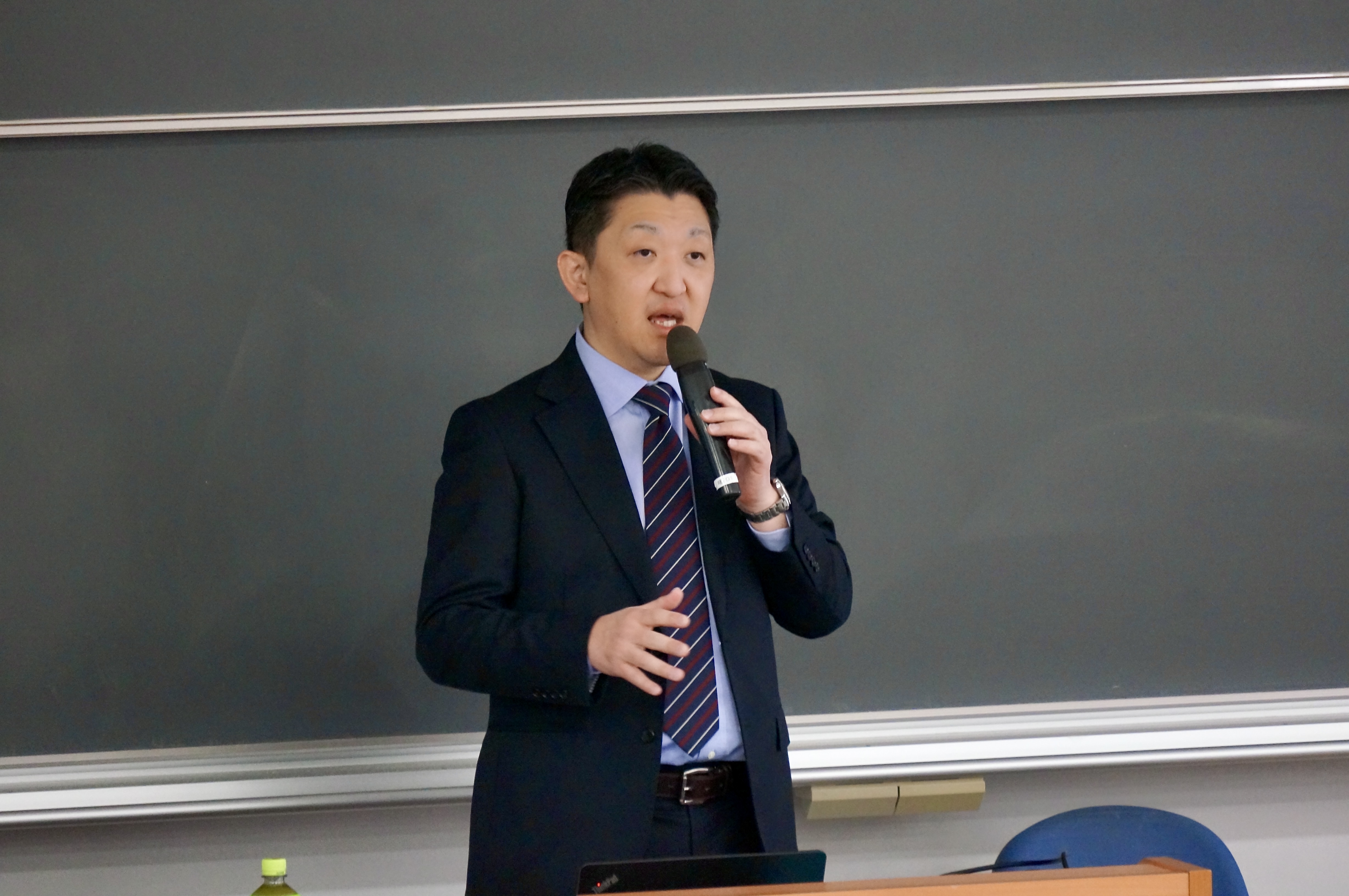 また、同社所属の渡邉大介氏(商学部2018年3月卒業:岡本ゼミ所属)は、学生時代に大学でどのような意識を持ちながら過ごしてきたのかなど、経営学部1年生に向けて今後の学生生活を送るための意識づけについて話されました。