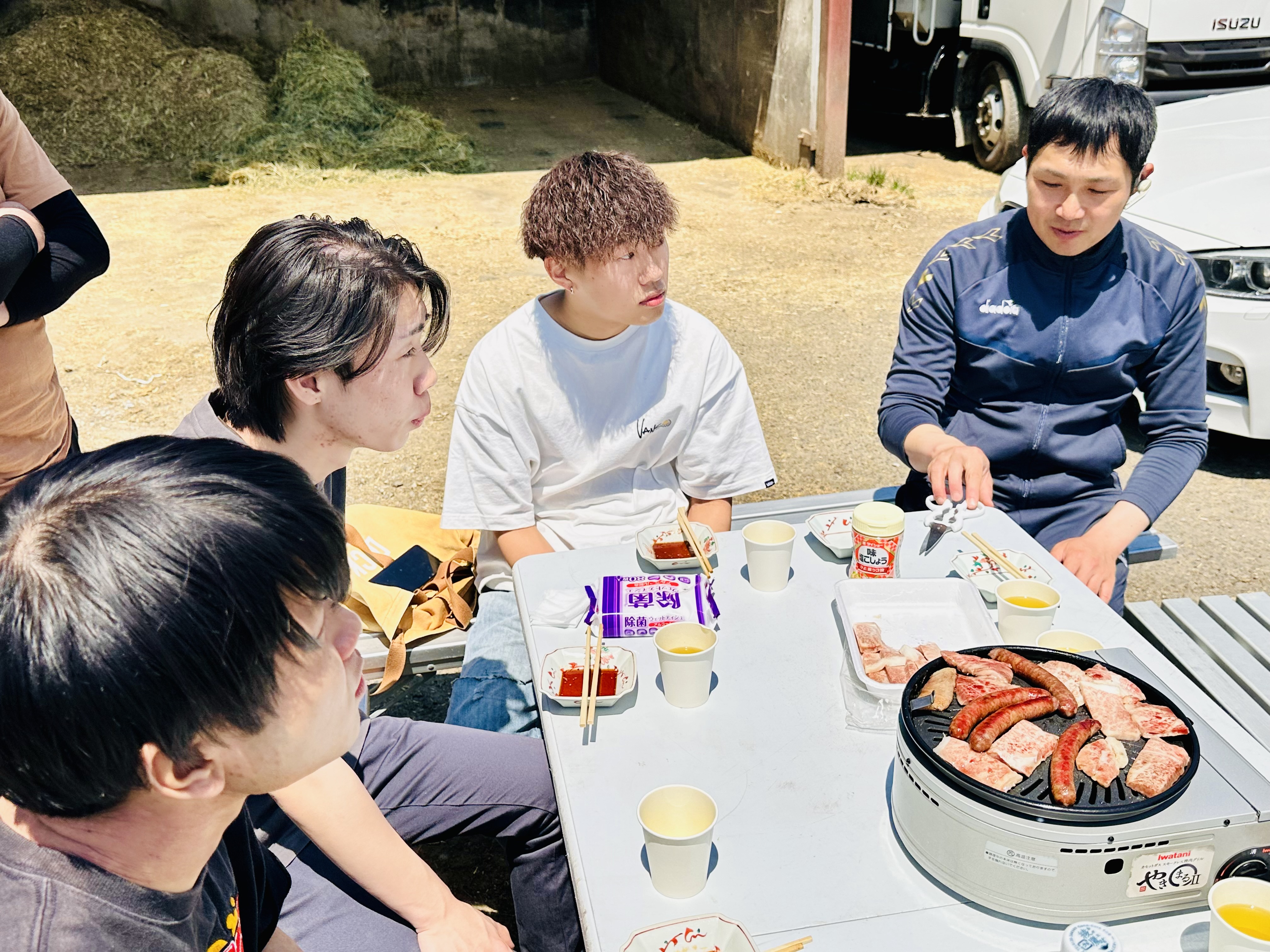 オグリ牧場の牛肉を試食しながら、小栗氏から牧場運営に対する思いを聞くプロジェクトメンバー