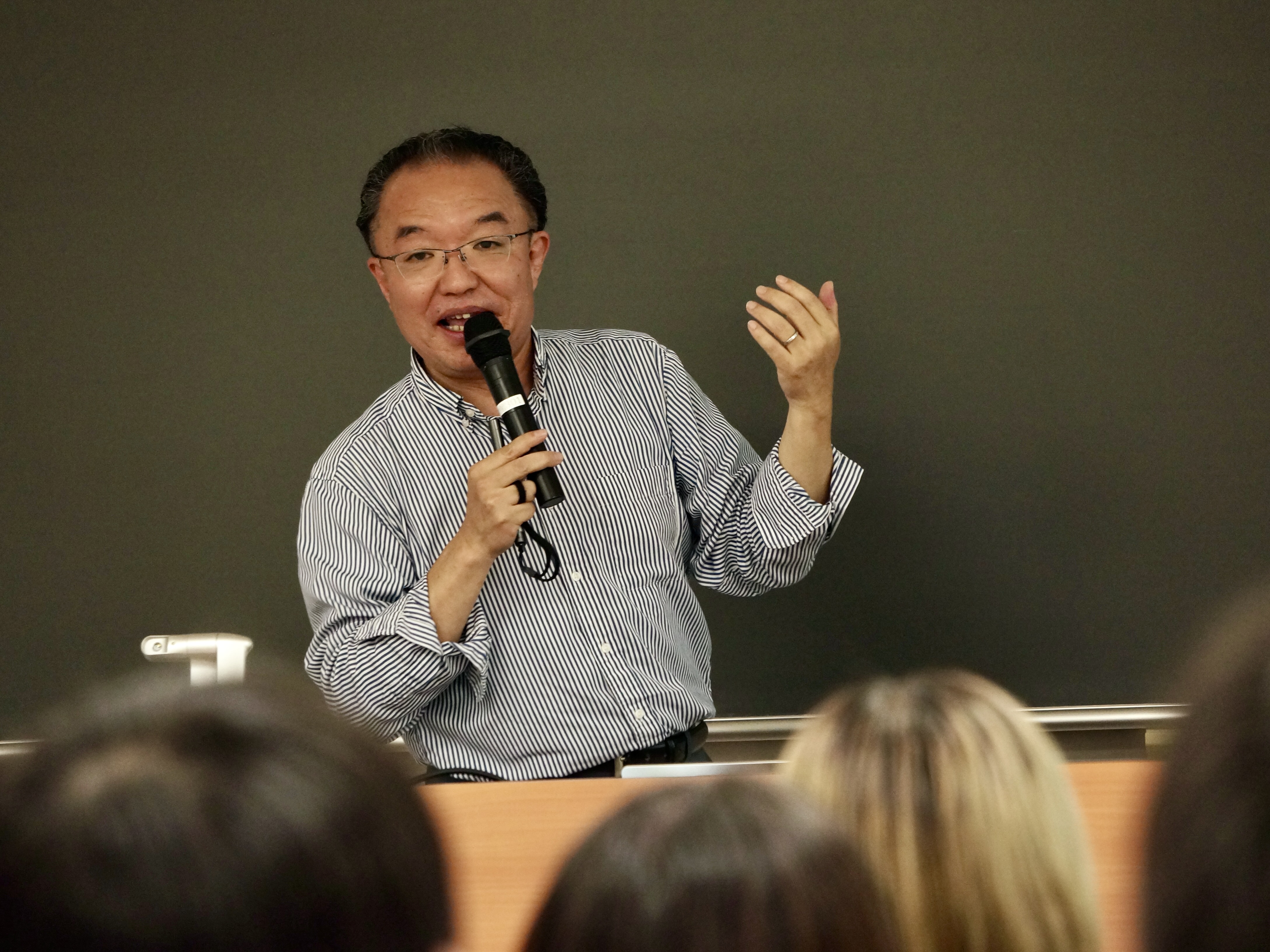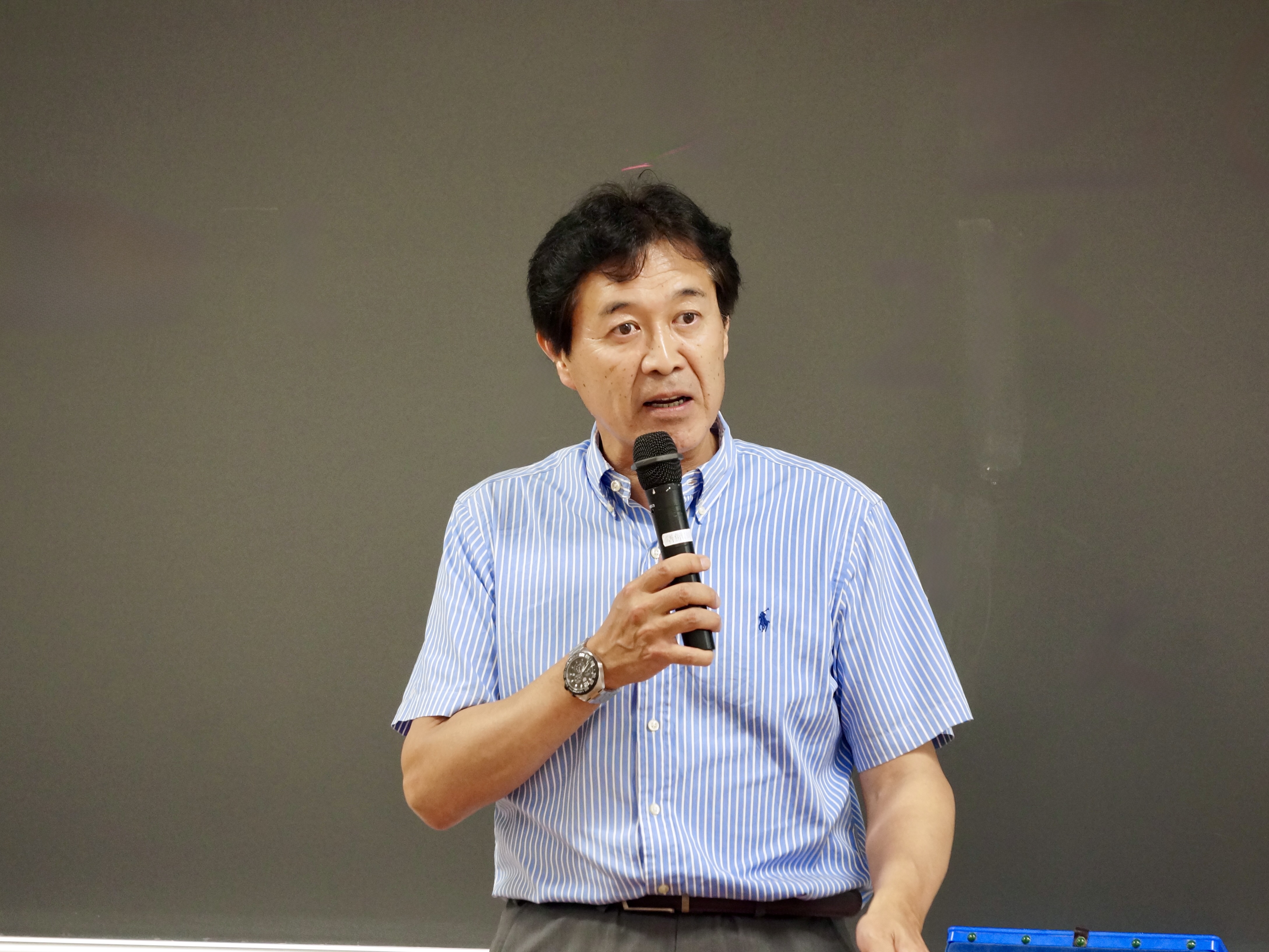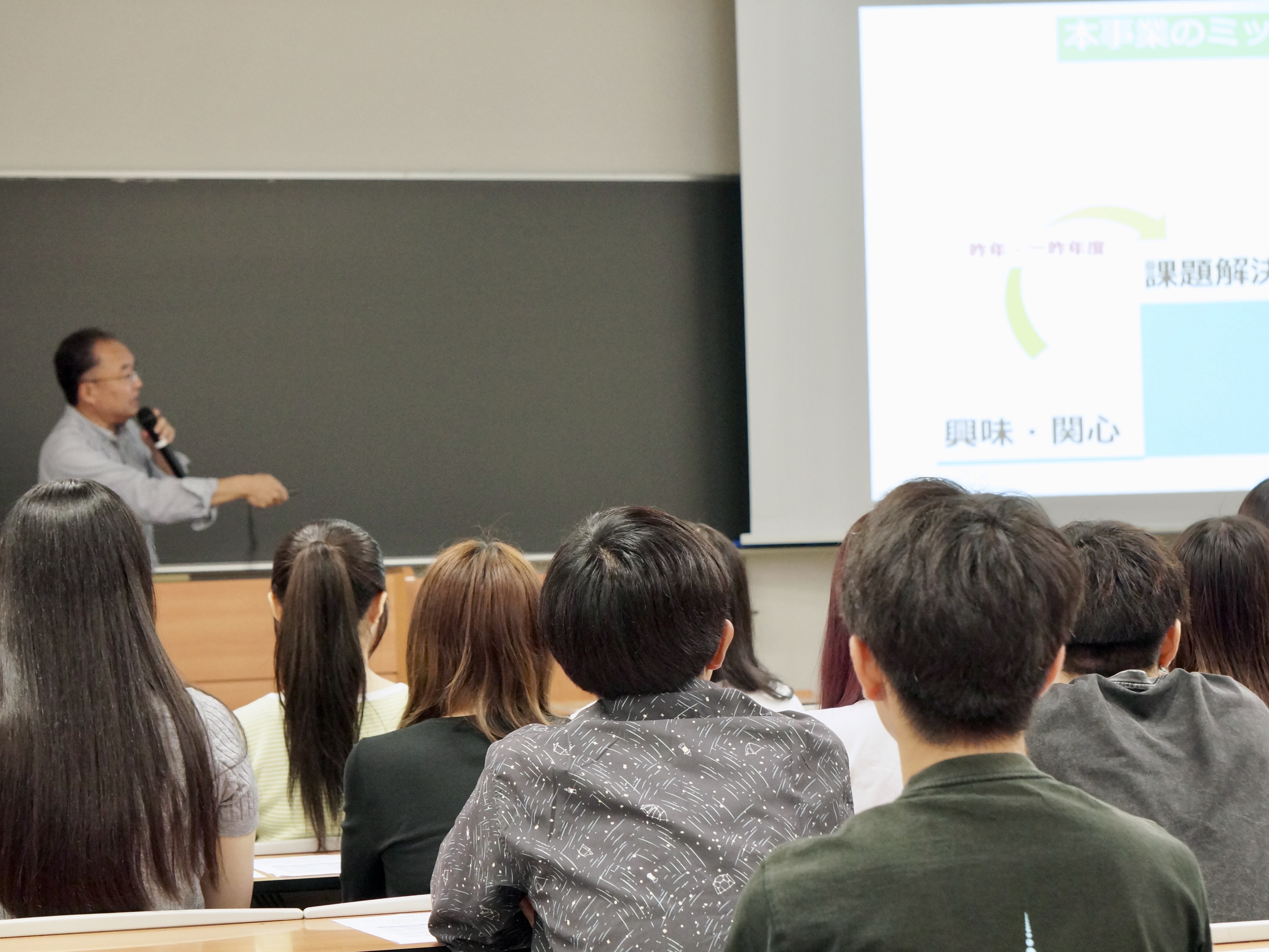 最後に学生に向けてプロジェクトに取り組む姿勢と意識について説明する経営学部の岡本純教授