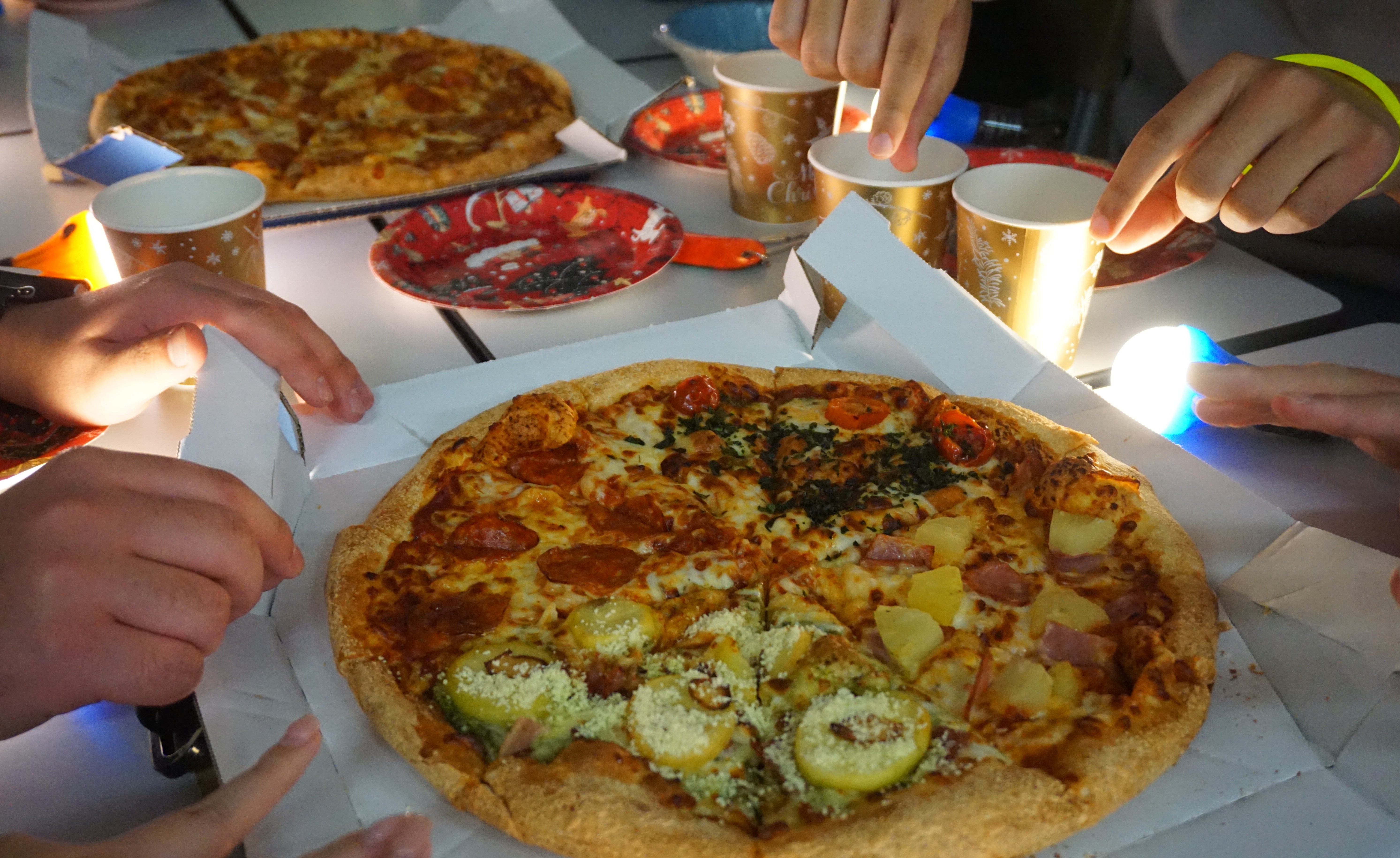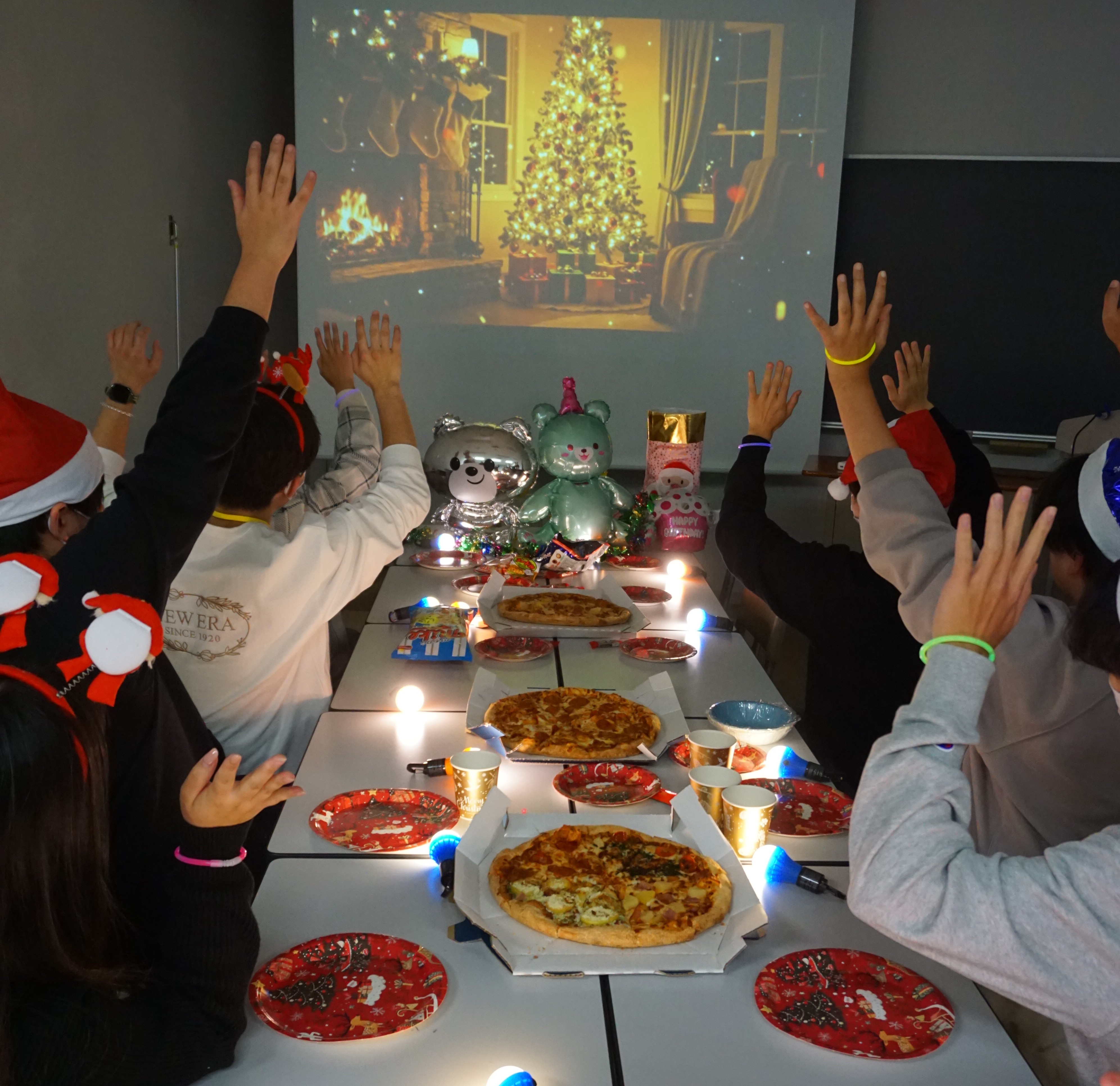 終了後、毎年恒例のピザパーティとなりました。豊岡ゼミ学生らも参加し、実り多きゼミ交流イベントとなりました。学内チャペル前のツリーも色鮮やかに点灯されて、キャンパス内は一気にクリスマスムードが高まってきました。