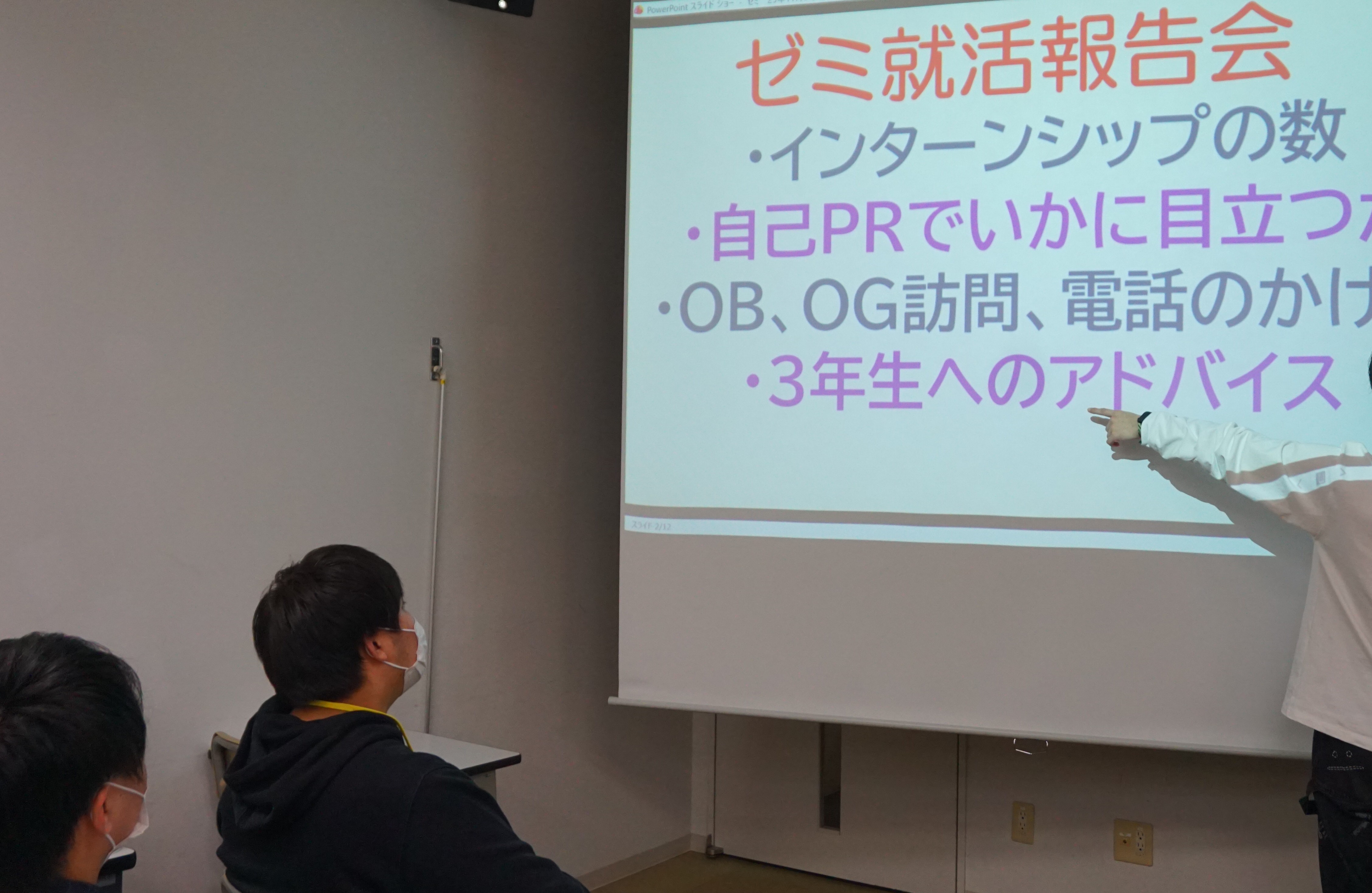 林ゼミでは、就活を終えた4年生による成果発表会を実施しました。就活がスタートしたばかりの後輩たちからはたくさんの質問がとびかいました。