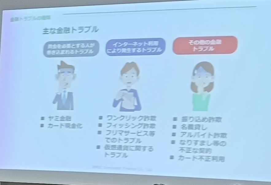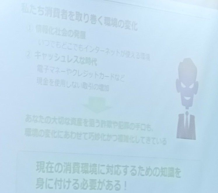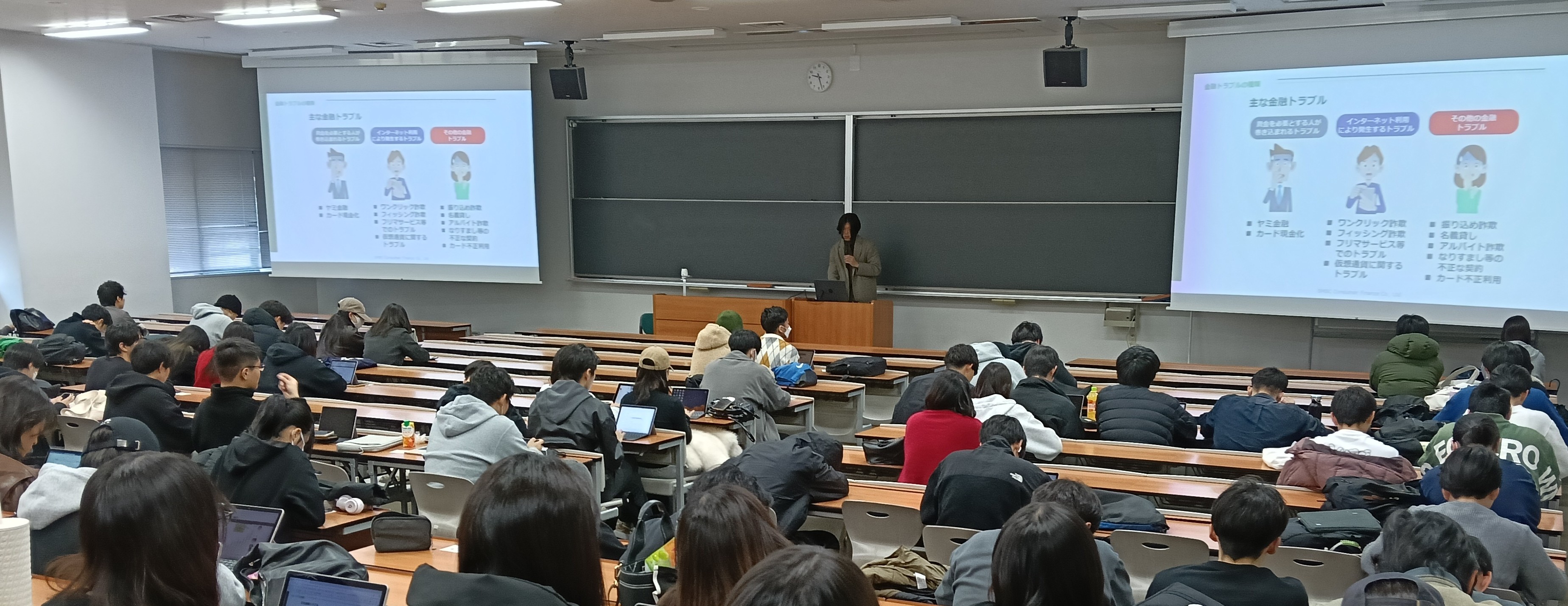 11月19日(水)の講義では、福井大学客員准教授の寺尾隆氏をお招きし、金融トラブルというテーマでご講演を頂きました。学生が引っ掛かりやすい詐欺事例取り上げ、注意喚起を兼ねた内容を豊富な資料を利用して分かりやすく話をしてくださいました。