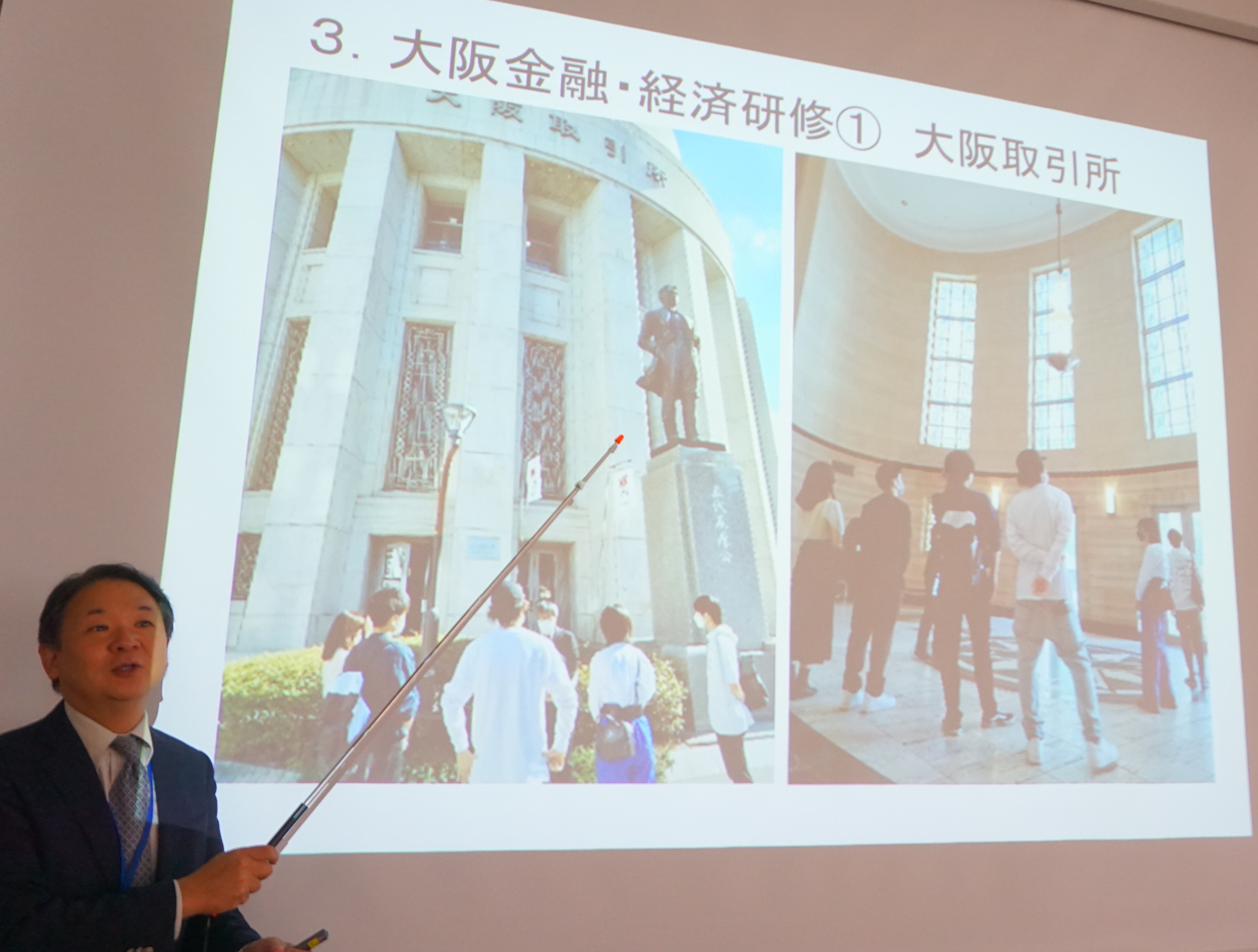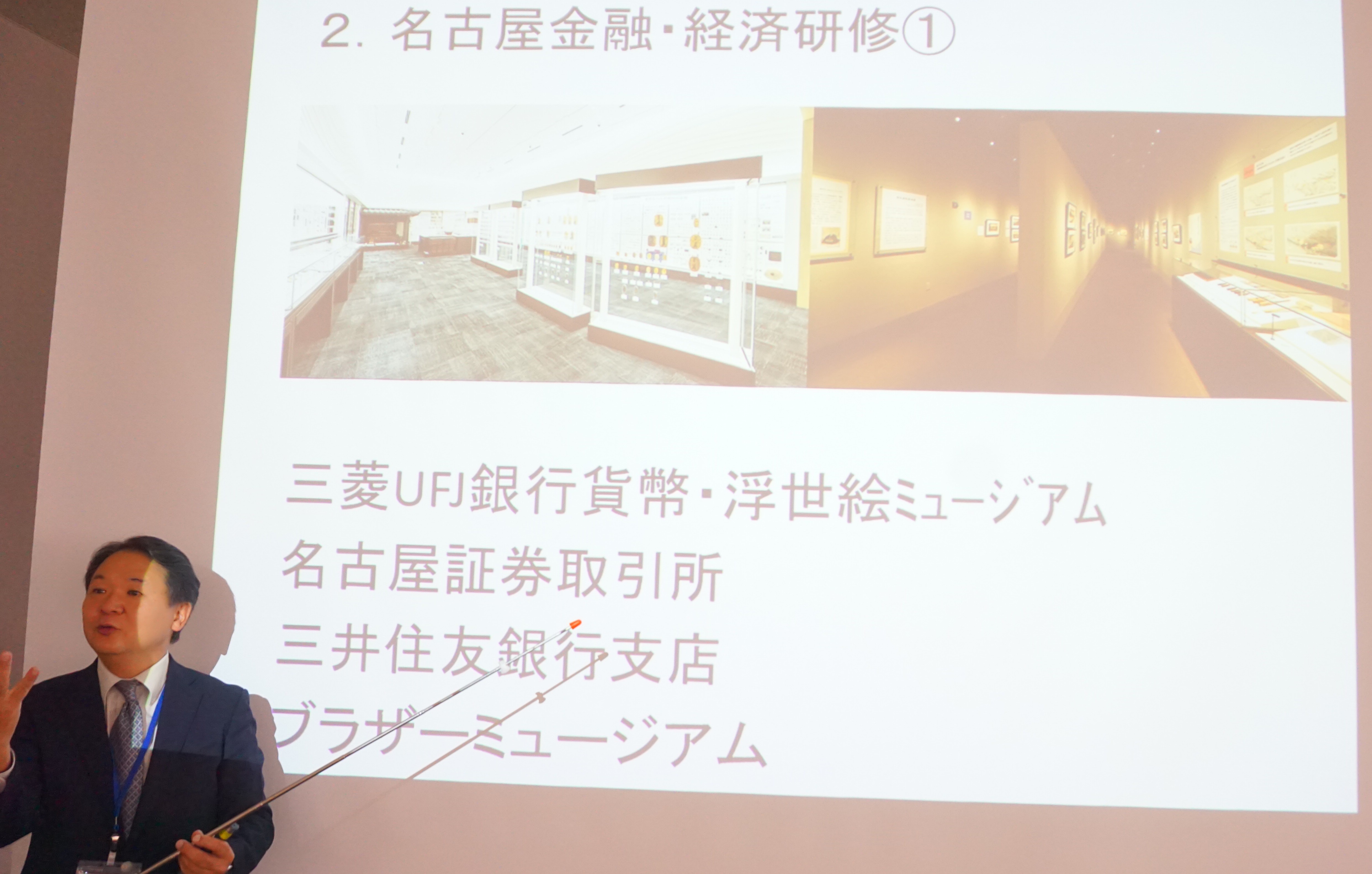 外島教授から主なゼミ活動(日経STOCKリーグ、名古屋金融・経済研修、大阪金融・経済研修、東京金融・経済研修)の紹介がありました。大阪企業家ミュージアム、日本銀行大阪支店、USJ、大阪取引所、カップヌードル・ミュージアム、三菱UFJ銀行貨幣・浮世絵ミュージアム、ブラザー・ミュージアム見学会など、魅力的な訪問先の写真も合わせて紹介されました。