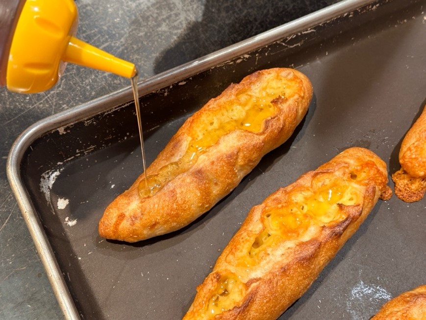 試作の中でパン生地やパンの形・チーズの種類など、自分たちが作りたいパンのイメージを皆が美味しいと思うパンに近づけるため、何度も試作を重ねて、チーズ、はちみつ、パン生地3つのバランスを見極めました。
