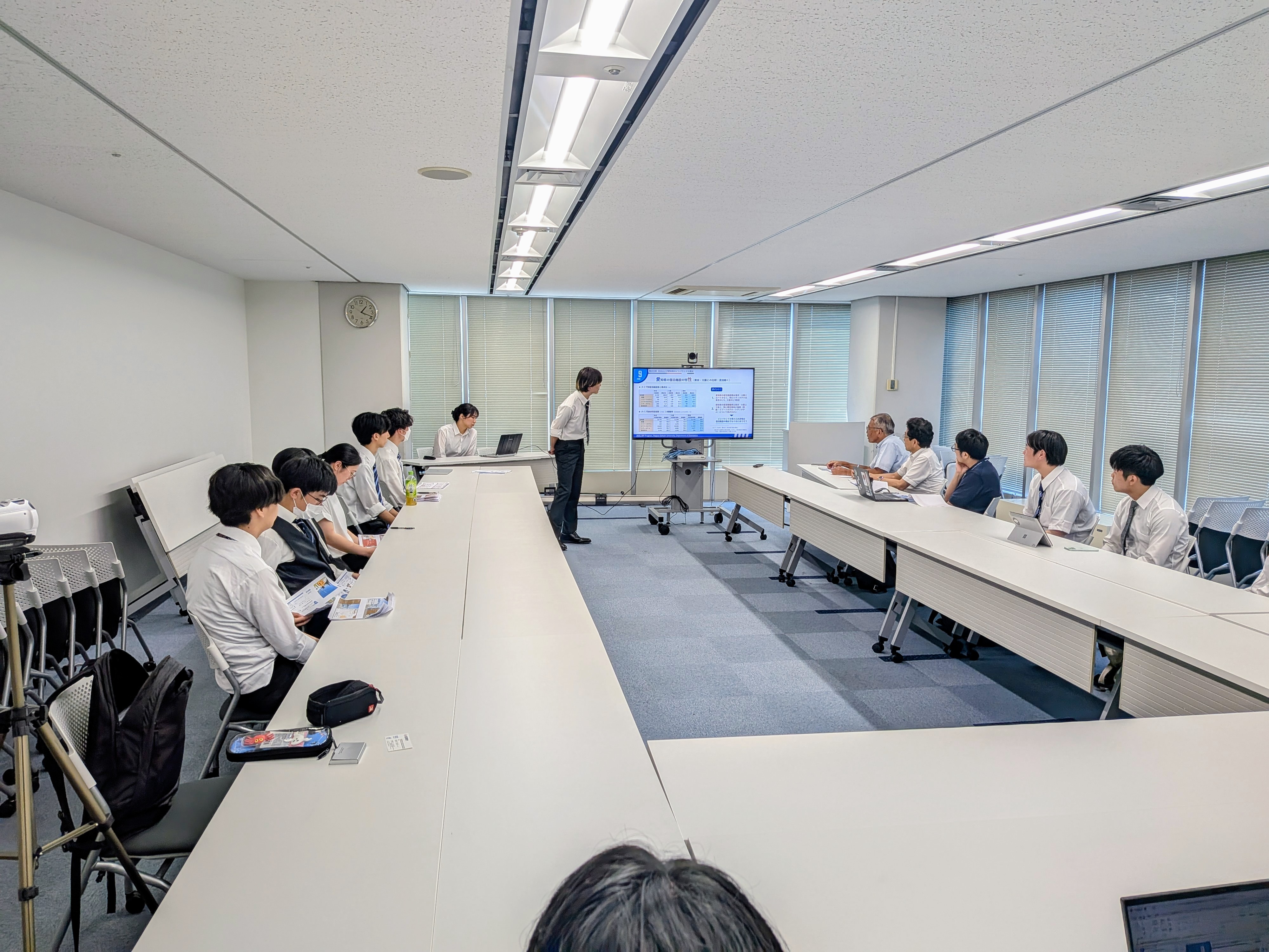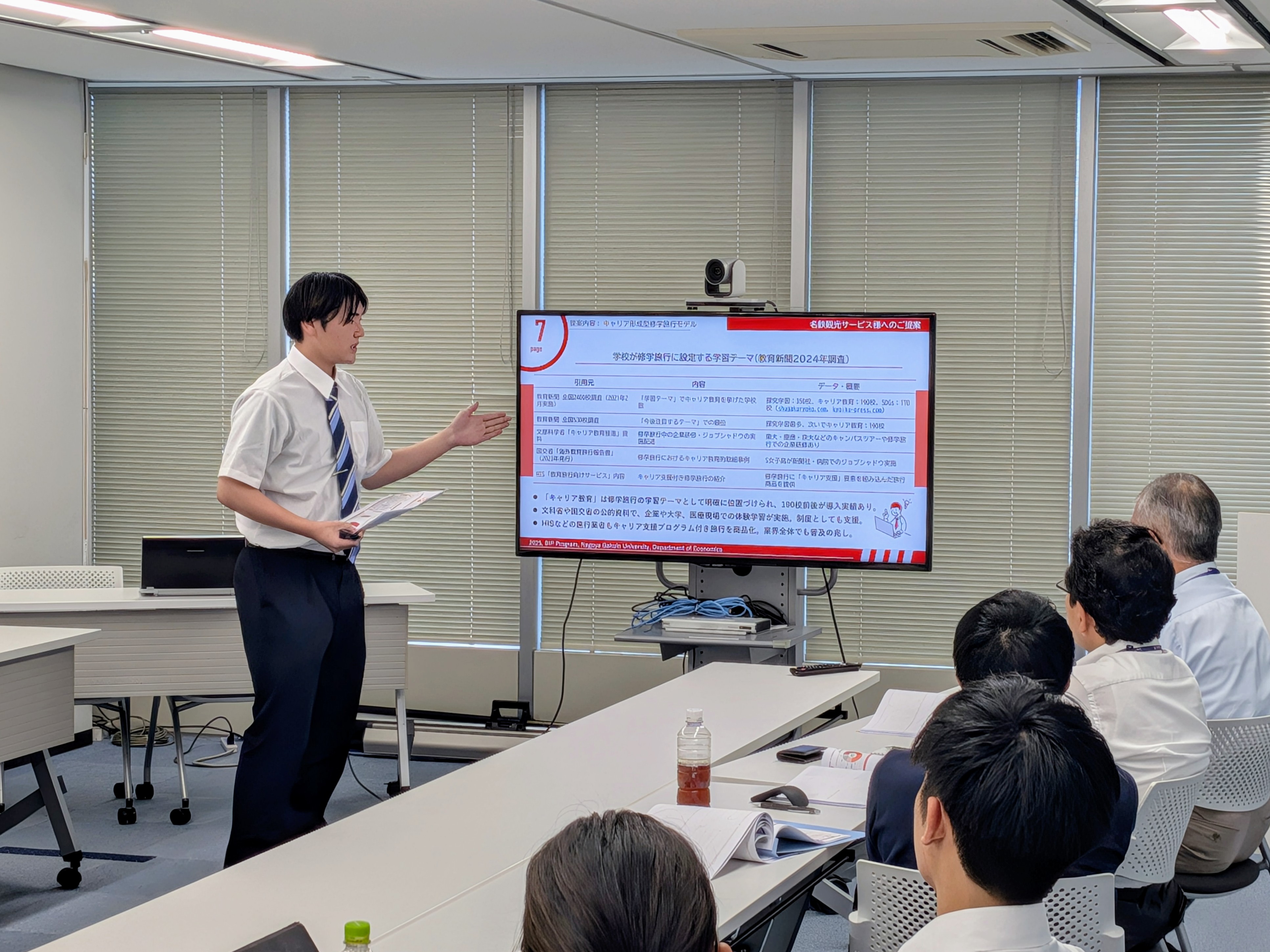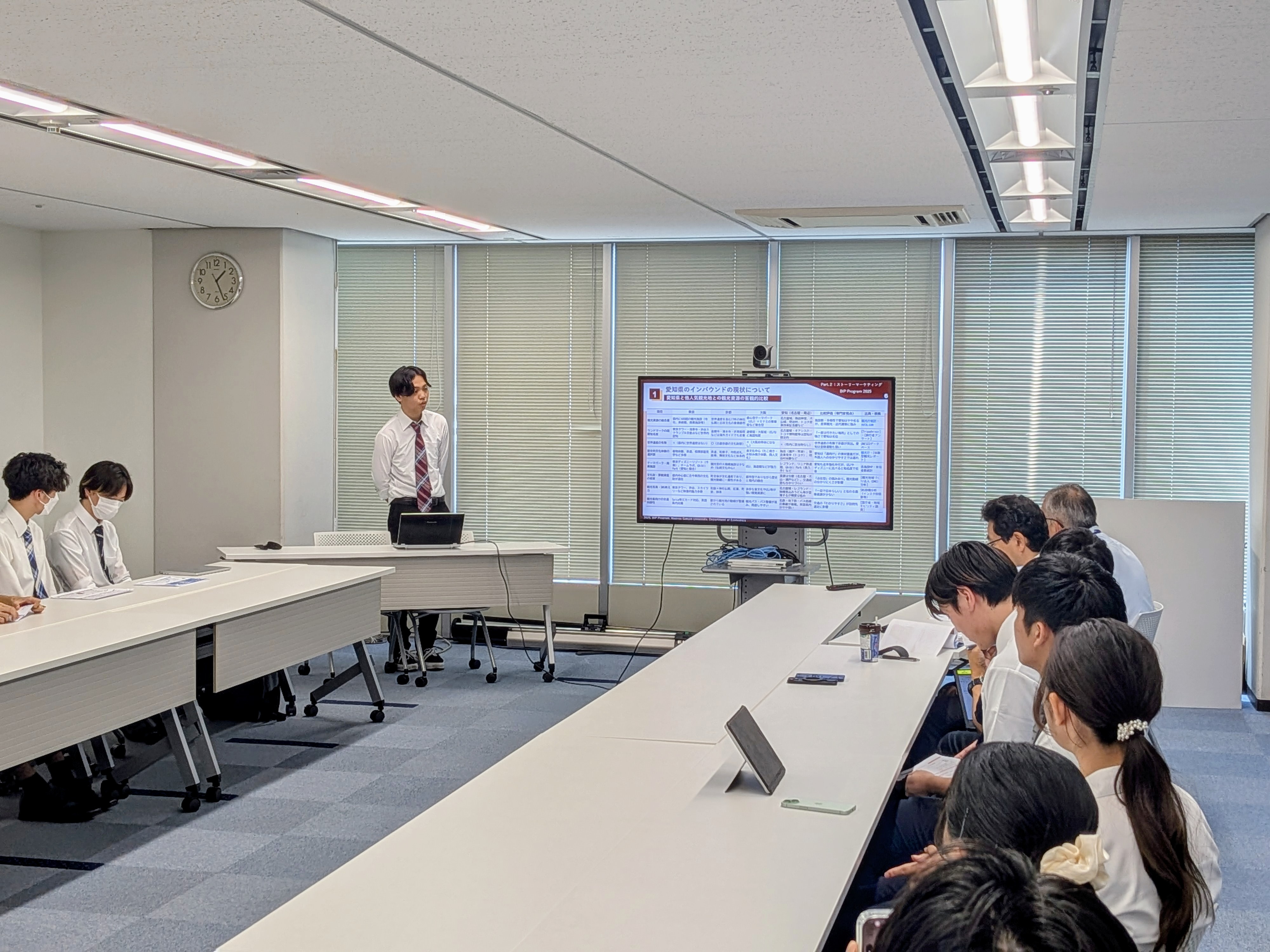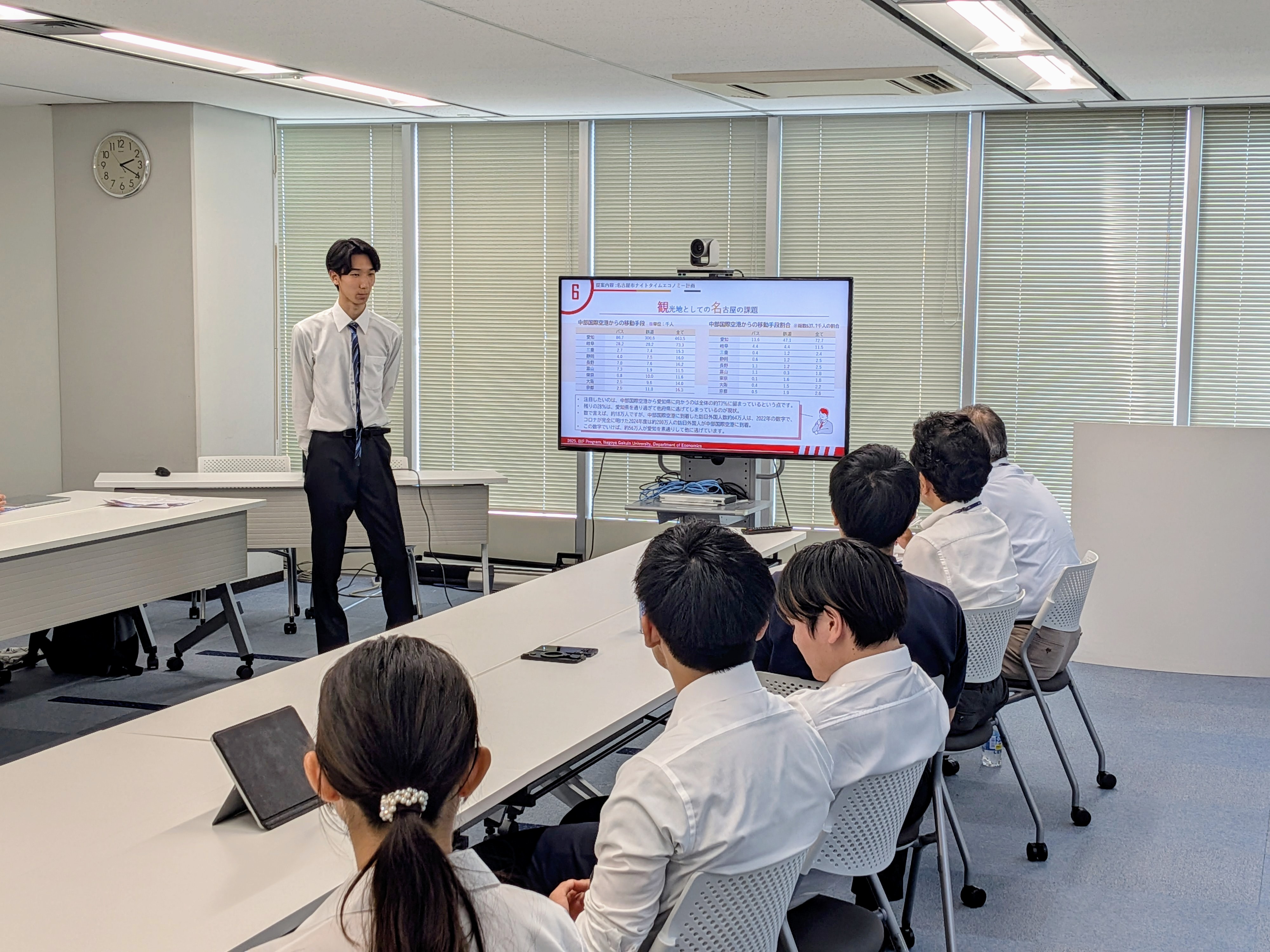 2025年7月5日(土)13時より、名鉄観光サービス本社(名古屋市中村区)にて、2年生クラスの最終成果報告会を実施しました。当日は、1つの愛知県の観光事情の現状報告と6つの提案を行いました。人気観光地と比較すると愛知県の観光資源の乏しさは致命的な課題ですが、その対応には県全体で長期的な視点に立って取り組む必要があります。もっと短期的な視点でできることはないか、との模索を通じて、ゼロから観光資源を生み出すストーリーマーケティングを旅行のビジネスモデルに組み込んだ諸提案や、ナイトタイム観光に集中し、周遊拠点としての強みを活かす提案、修学旅行の時期や行き先が前年踏襲的に決まるという現状に対して楔を打つ提案や優良製造業が集積しているという強みを活かした他府県からの修学旅行誘致案など、様々な視点からの提案を行いました。どの提案も、データを始めとする客観的事実を基にし、科学的論理性を重視して作成しました。
