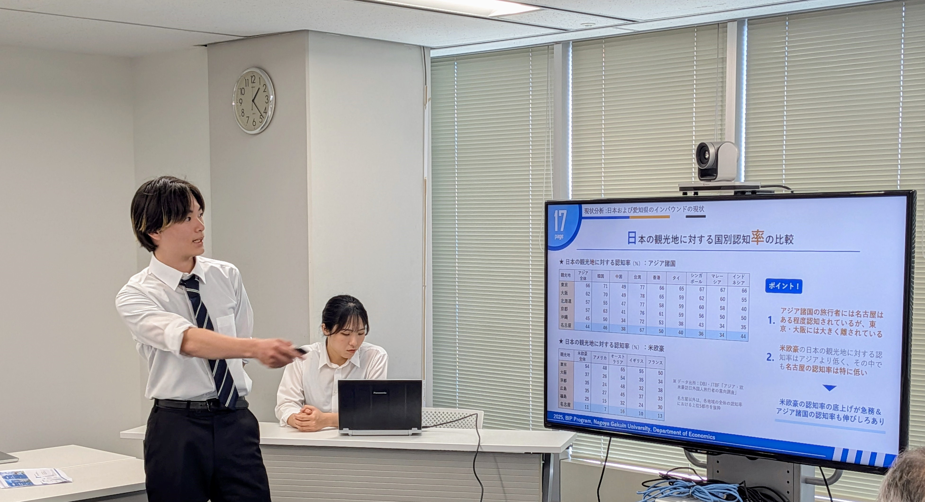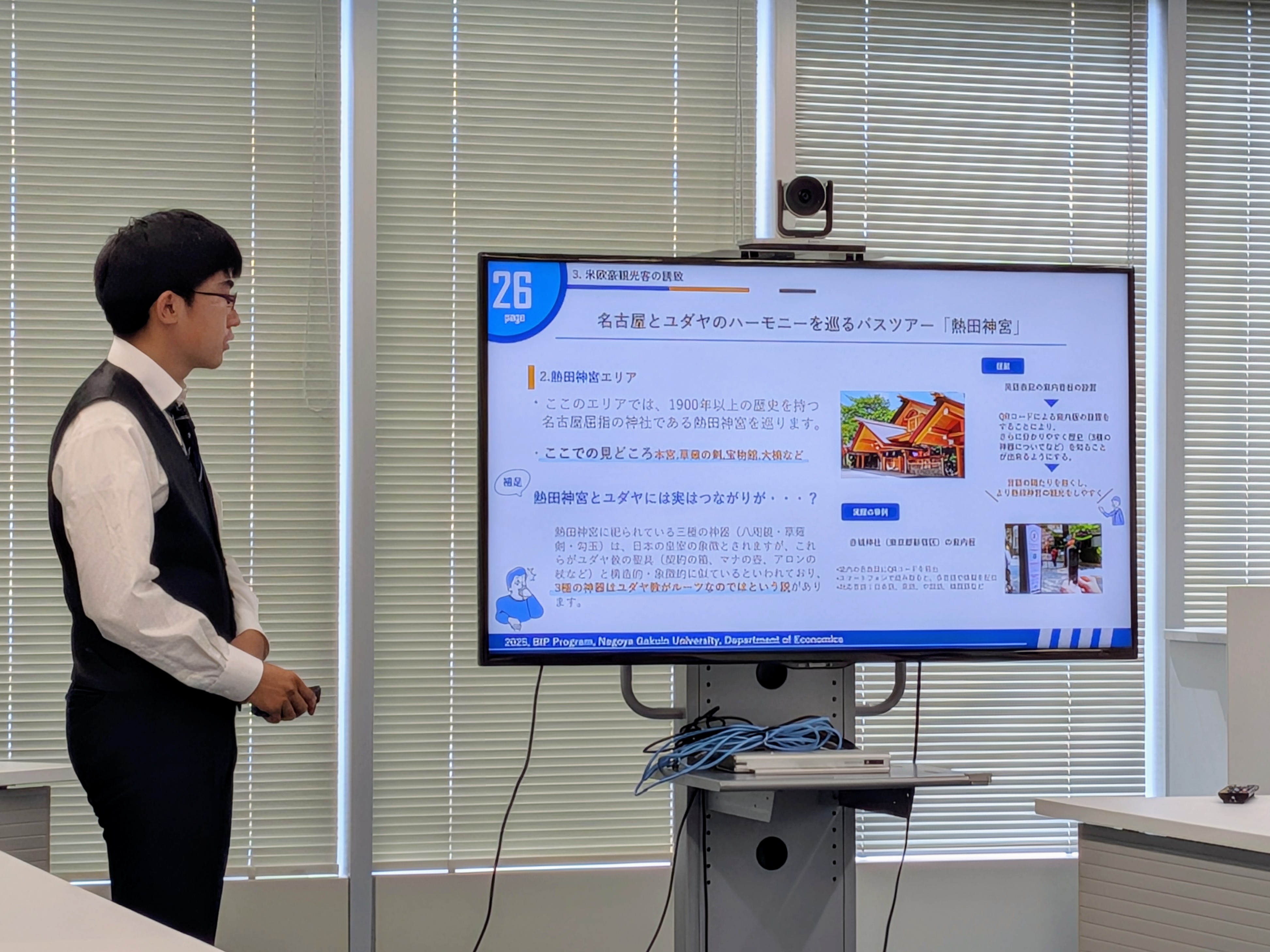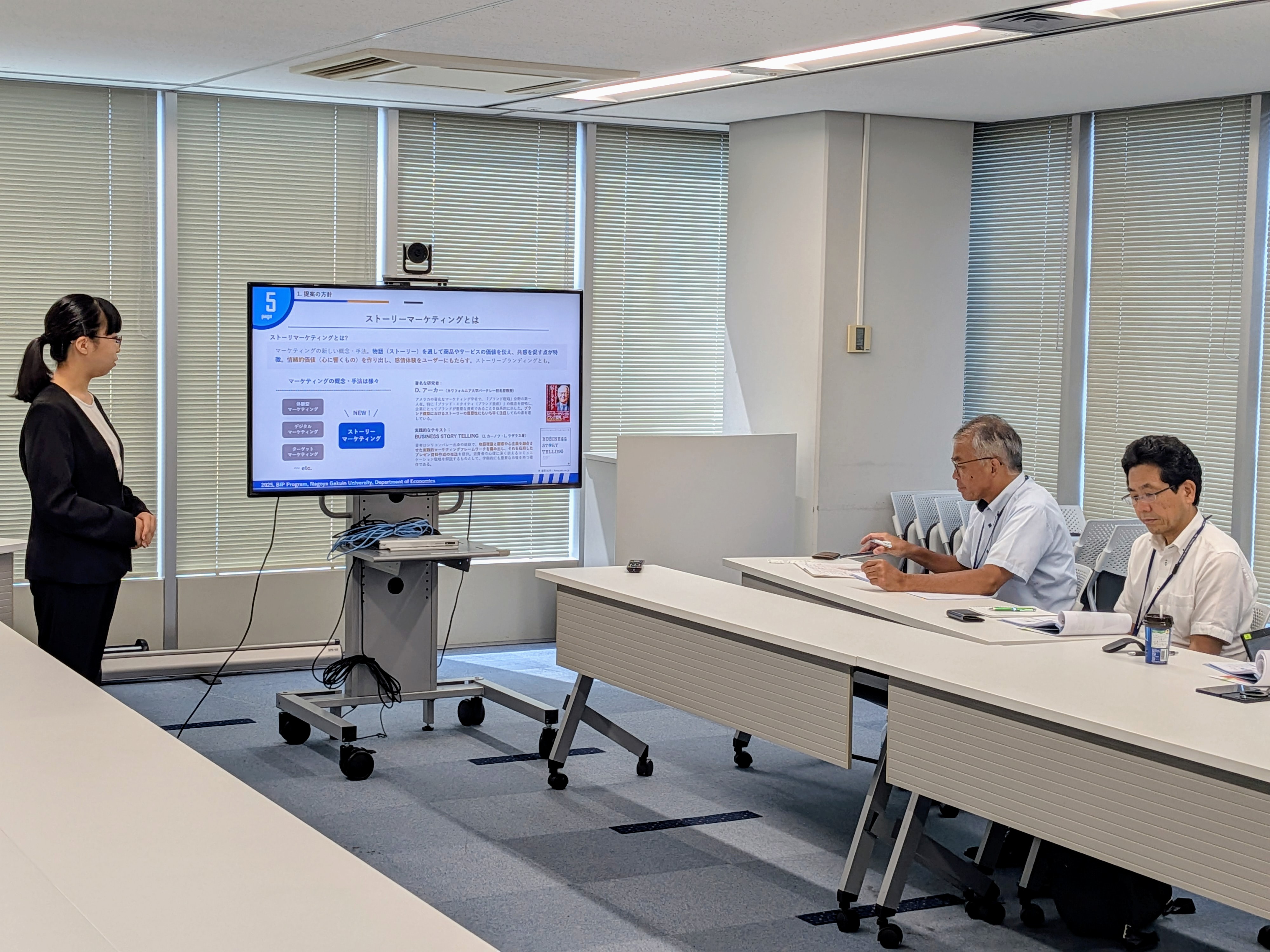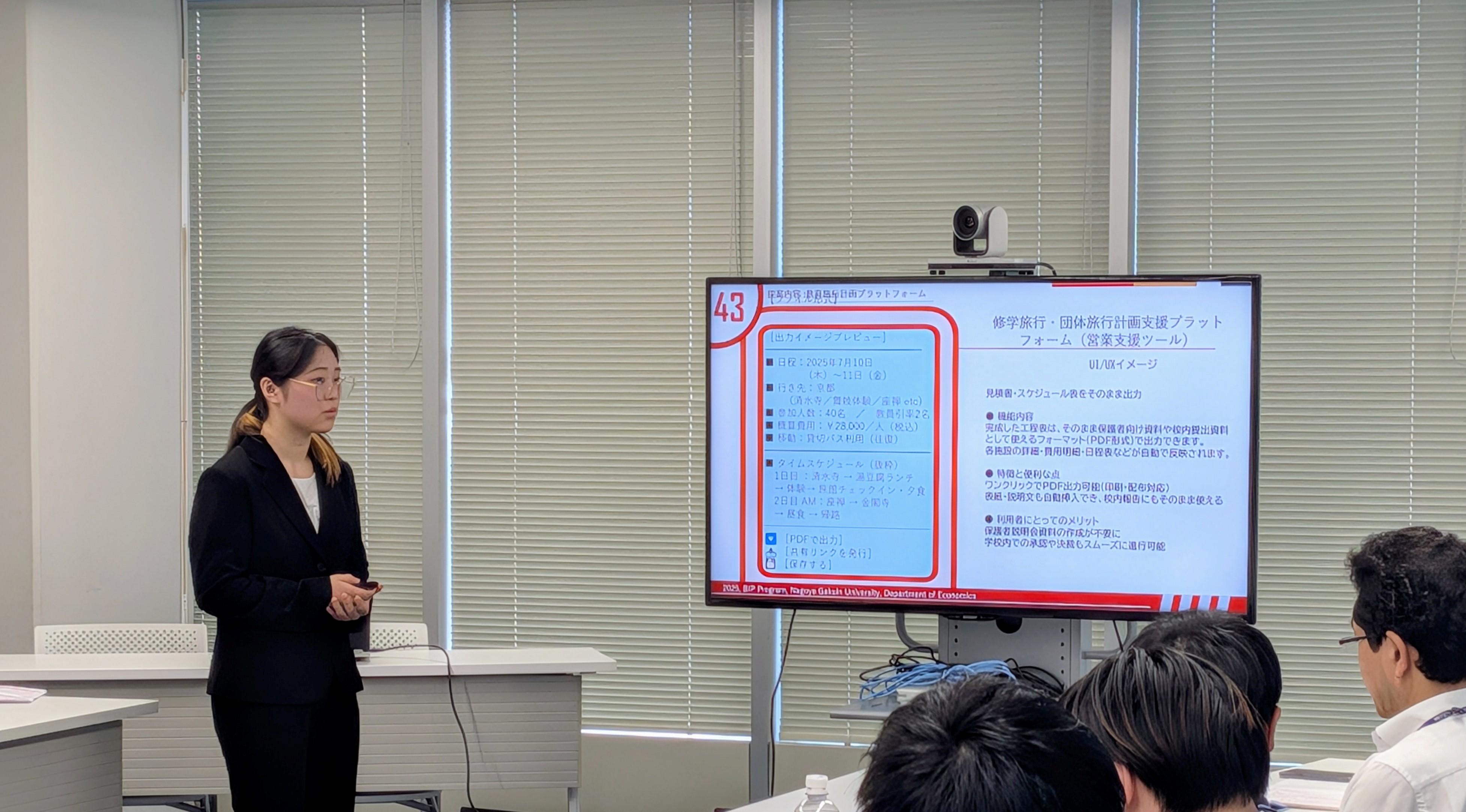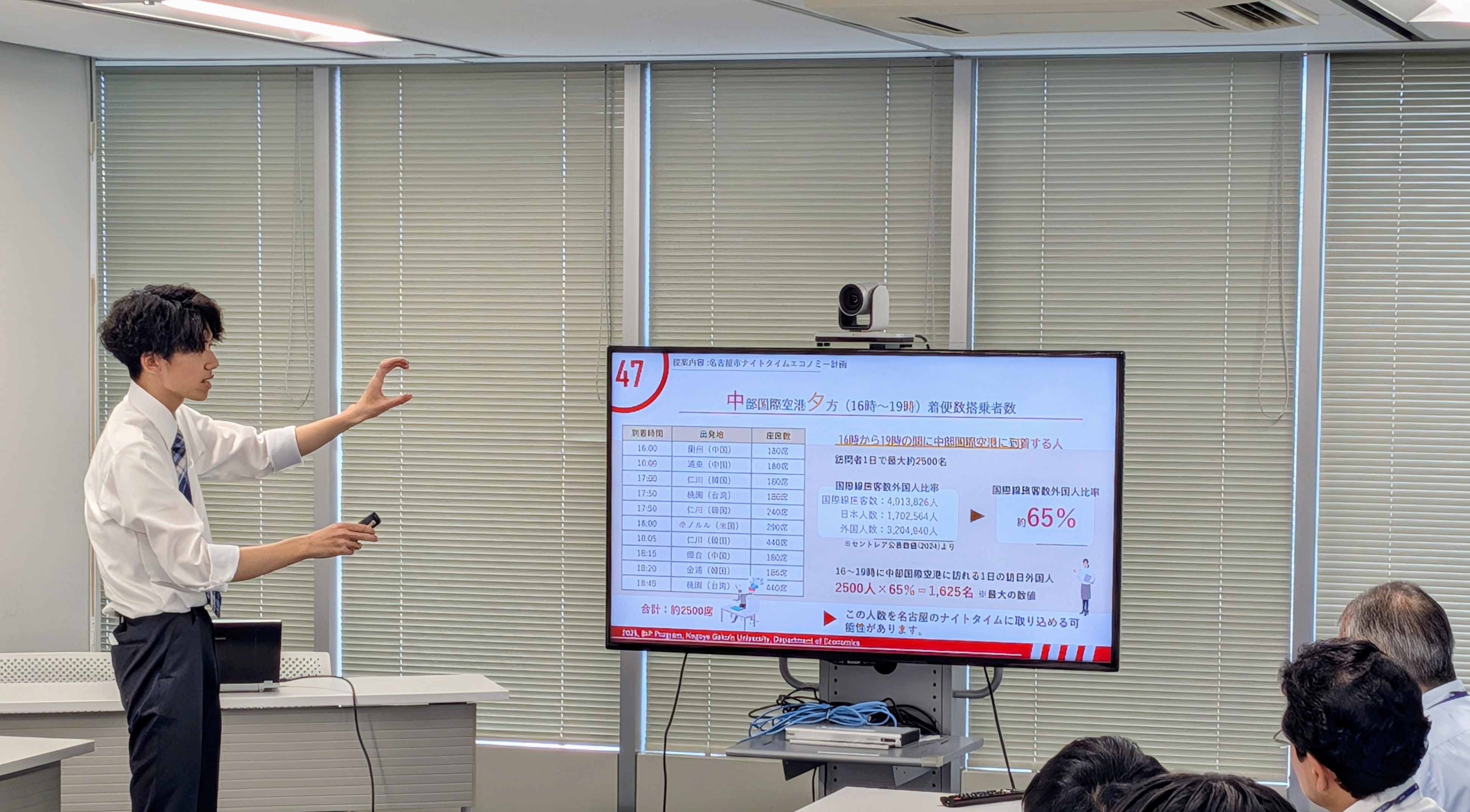 2025年7月5日(土)13時より、名鉄観光サービス本社(名古屋市中村区)にて、2年生クラスの最終成果報告会を実施しました。当日は、1つの愛知県の観光事情の現状報告と6つの提案を行いました。人気観光地と比較すると愛知県の観光資源の乏しさは致命的な課題ですが、その対応には県全体で長期的な視点に立って取り組む必要があります。もっと短期的な視点でできることはないか、との模索を通じて、ゼロから観光資源を生み出すストーリーマーケティングを旅行のビジネスモデルに組み込んだ諸提案や、ナイトタイム観光に集中し、周遊拠点としての強みを活かす提案、修学旅行の時期や行き先が前年踏襲的に決まるという現状に対して楔を打つ提案や優良製造業が集積しているという強みを活かした他府県からの修学旅行誘致案など、様々な視点からの提案を行いました。どの提案も、データを始めとする客観的事実を基にし、科学的論理性を重視して作成しました。