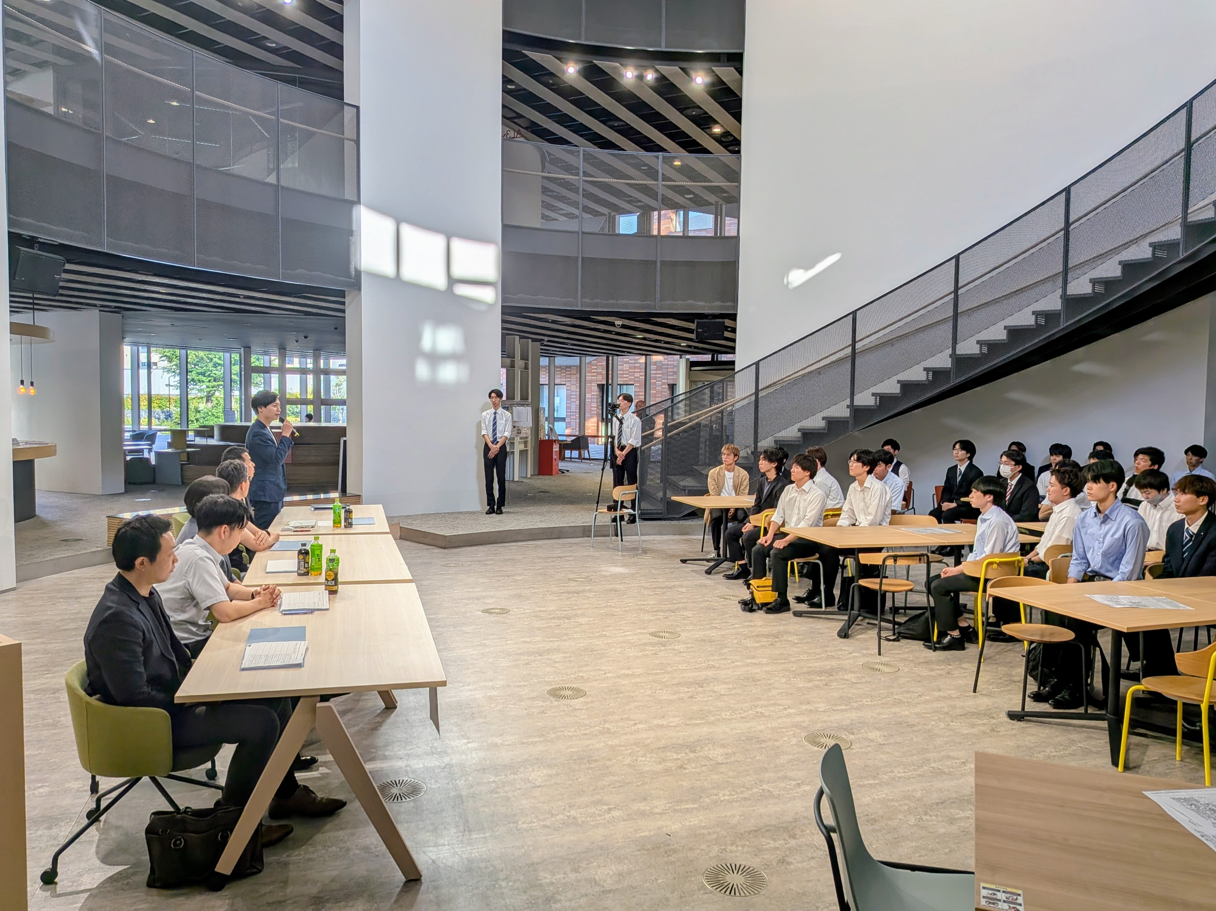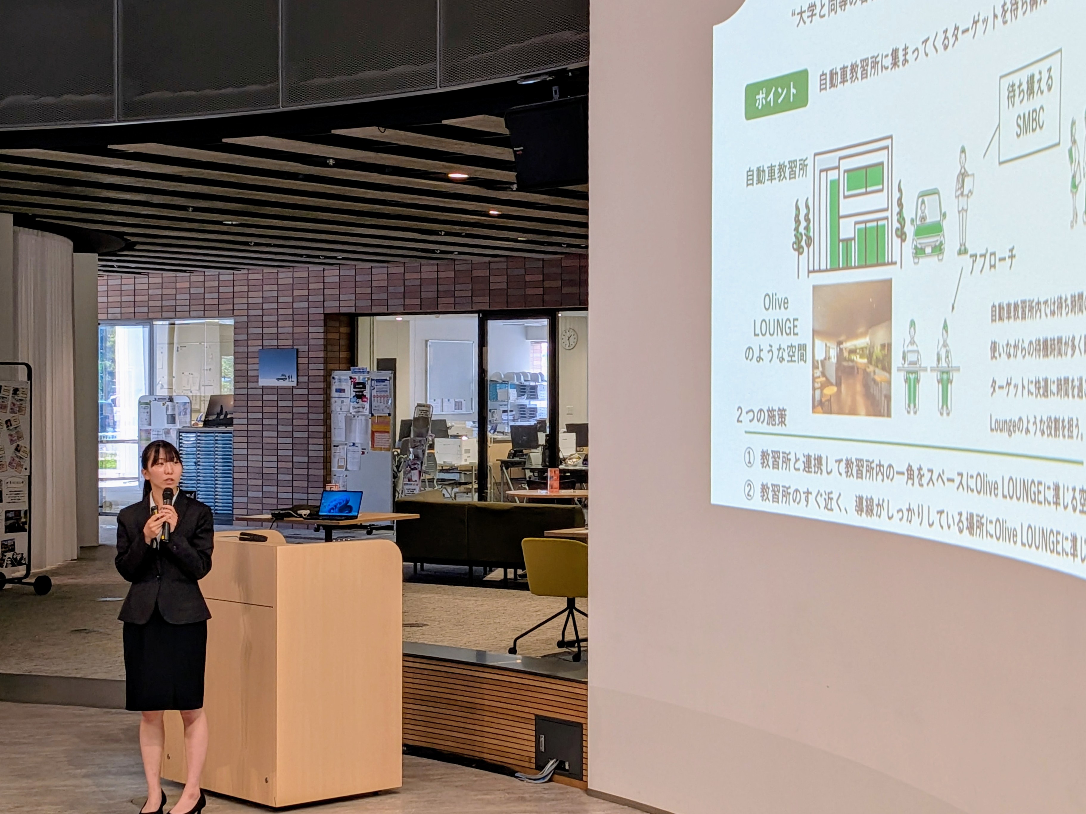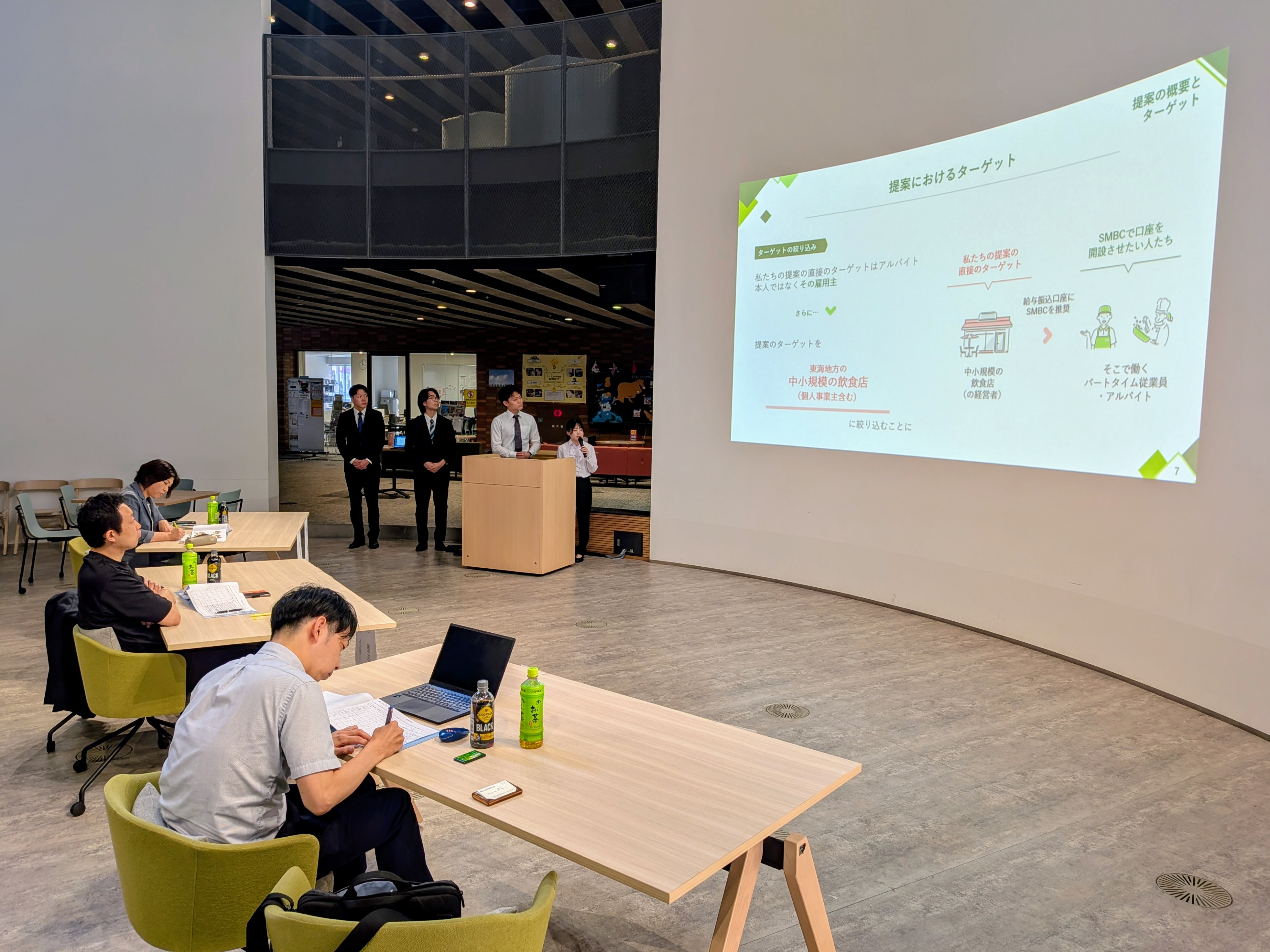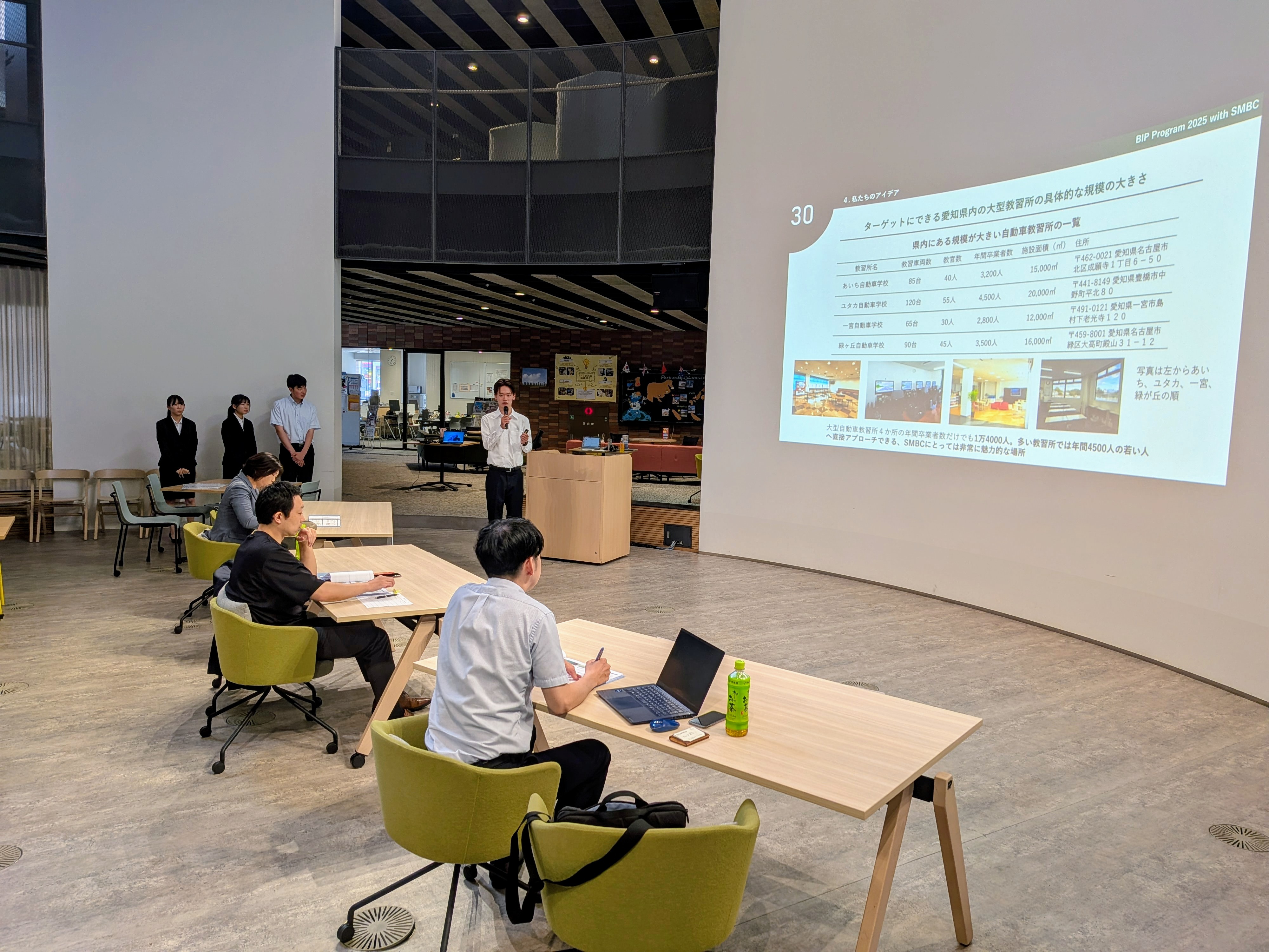 2025年7月12日(土)13時より、本学名古屋キャンパスたいほうにて、三井住友銀行様向けの最終成果報告会を実施しました。プロジェクトはこの4月にスタートし、提供頂いたリテール部門とホールセール部門の課題に対し、1年生と3年生の合計14チームが各課題に分かれ、この最終成果報告会に向けて準備をしてきました。