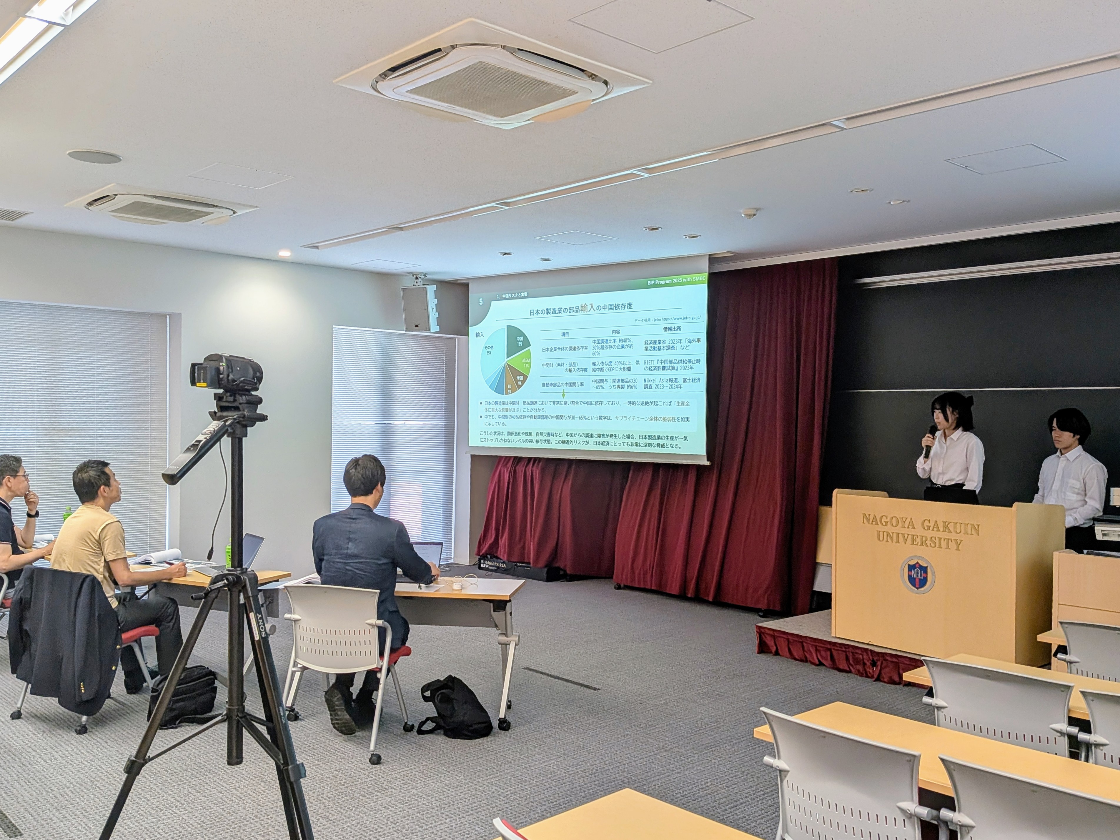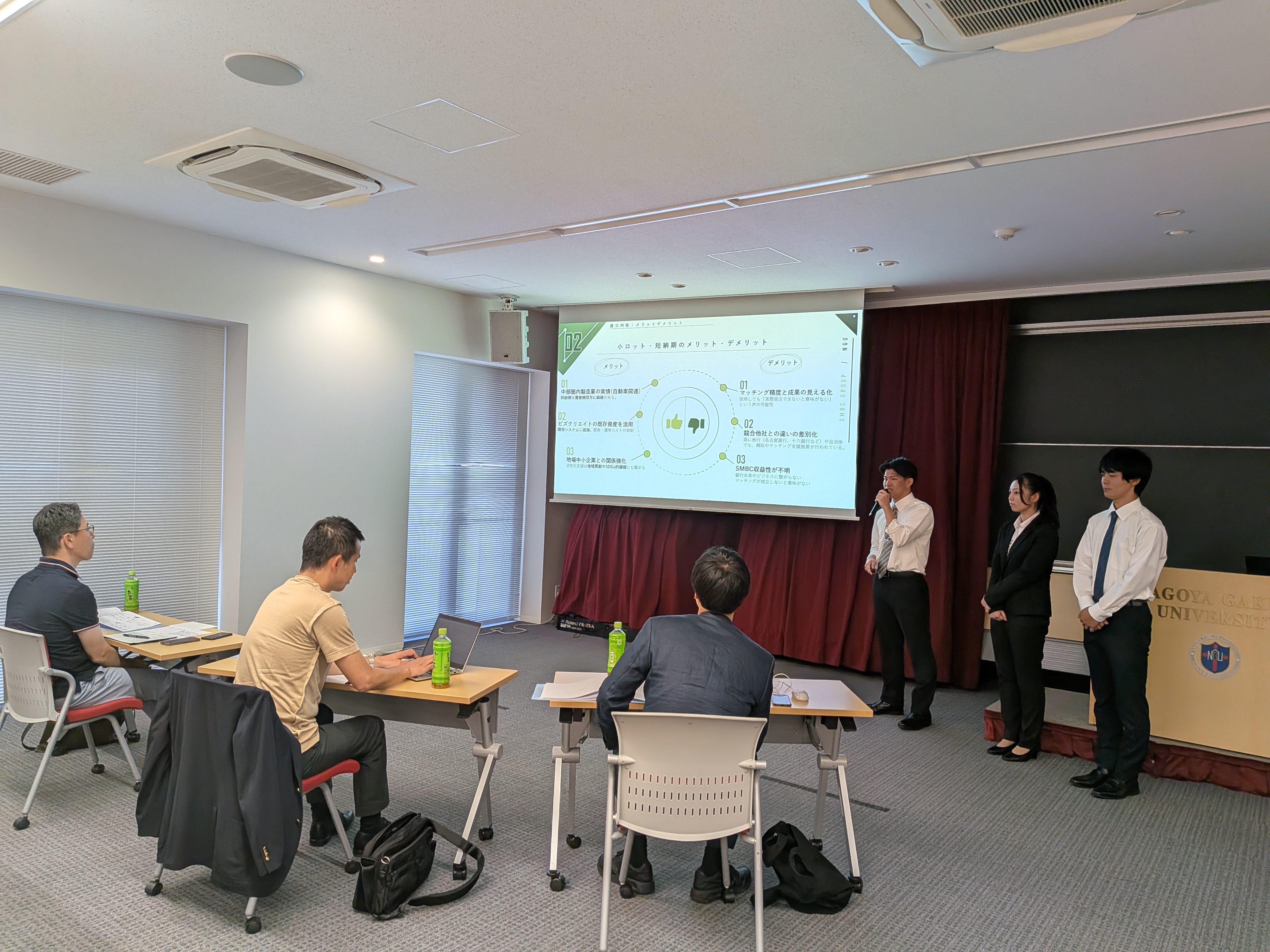 当日は、児島経済学部長の挨拶から始まり、その後、リテール部門(コミュニティ・リンク)とホールセール部門(メアリーホール)の2会場に分かれて成果報告会を行いました。上前津支店支店長の森田徹様、名古屋エリアウェルスマネジメントグループ長の杉田優斗様、名古屋エリアの板垣恵美様の3名の皆様がリテール部門の、そして名古屋法人ソリューションセンター長の松永和宏様、名古屋法人営業第三部副部長の鷹司隆昭様そして名古屋法人営業第三部の青木春樹様の3名の皆様がホールセール部門の発表に対してご講評を下さいました。
