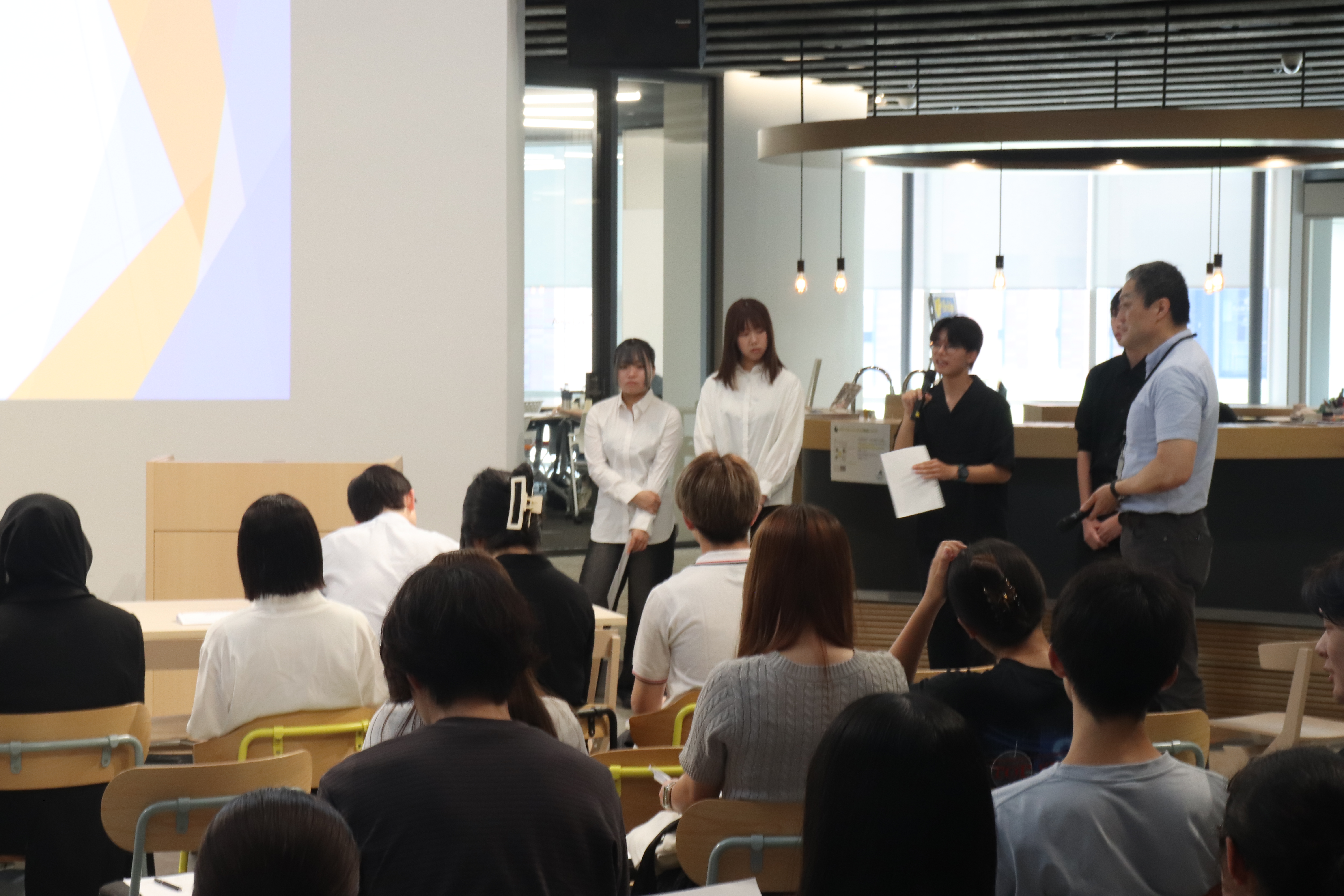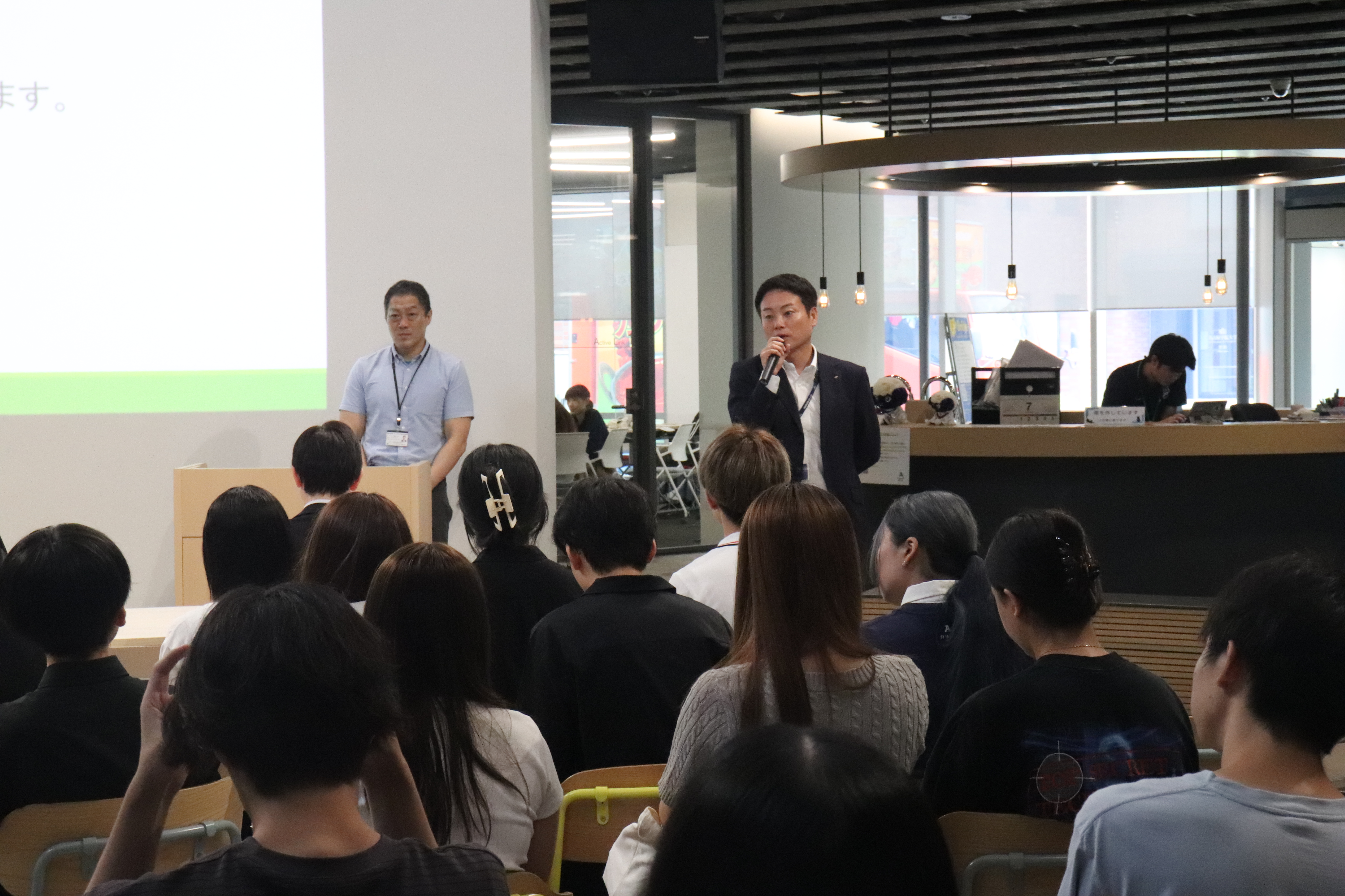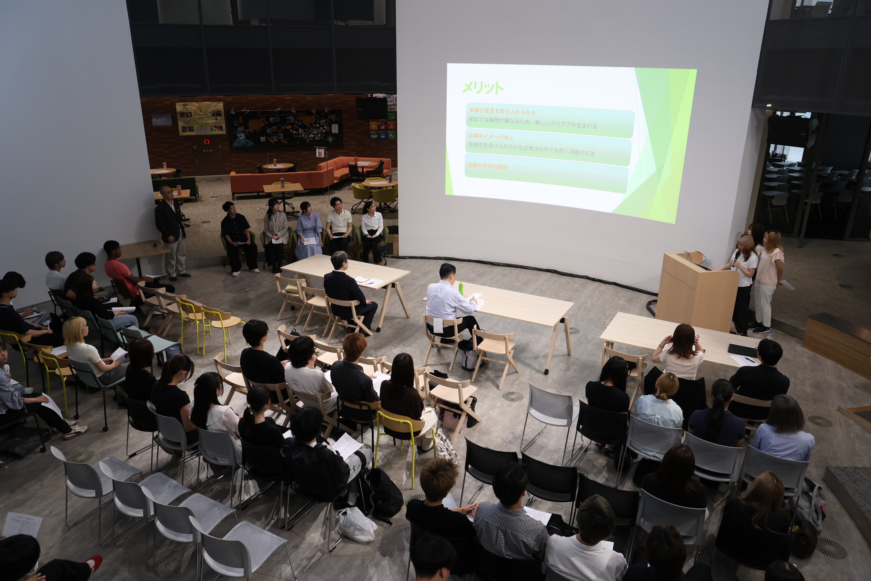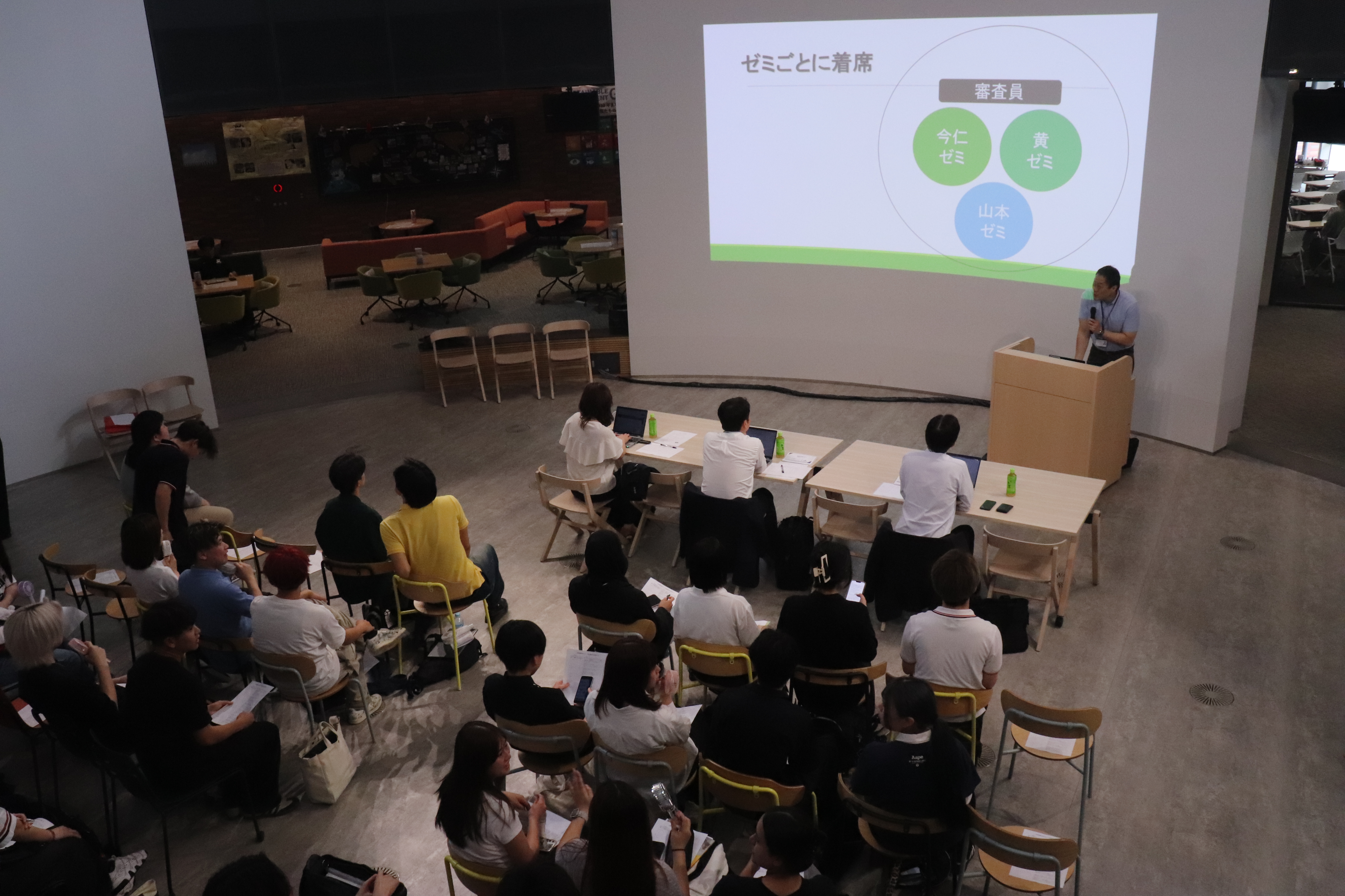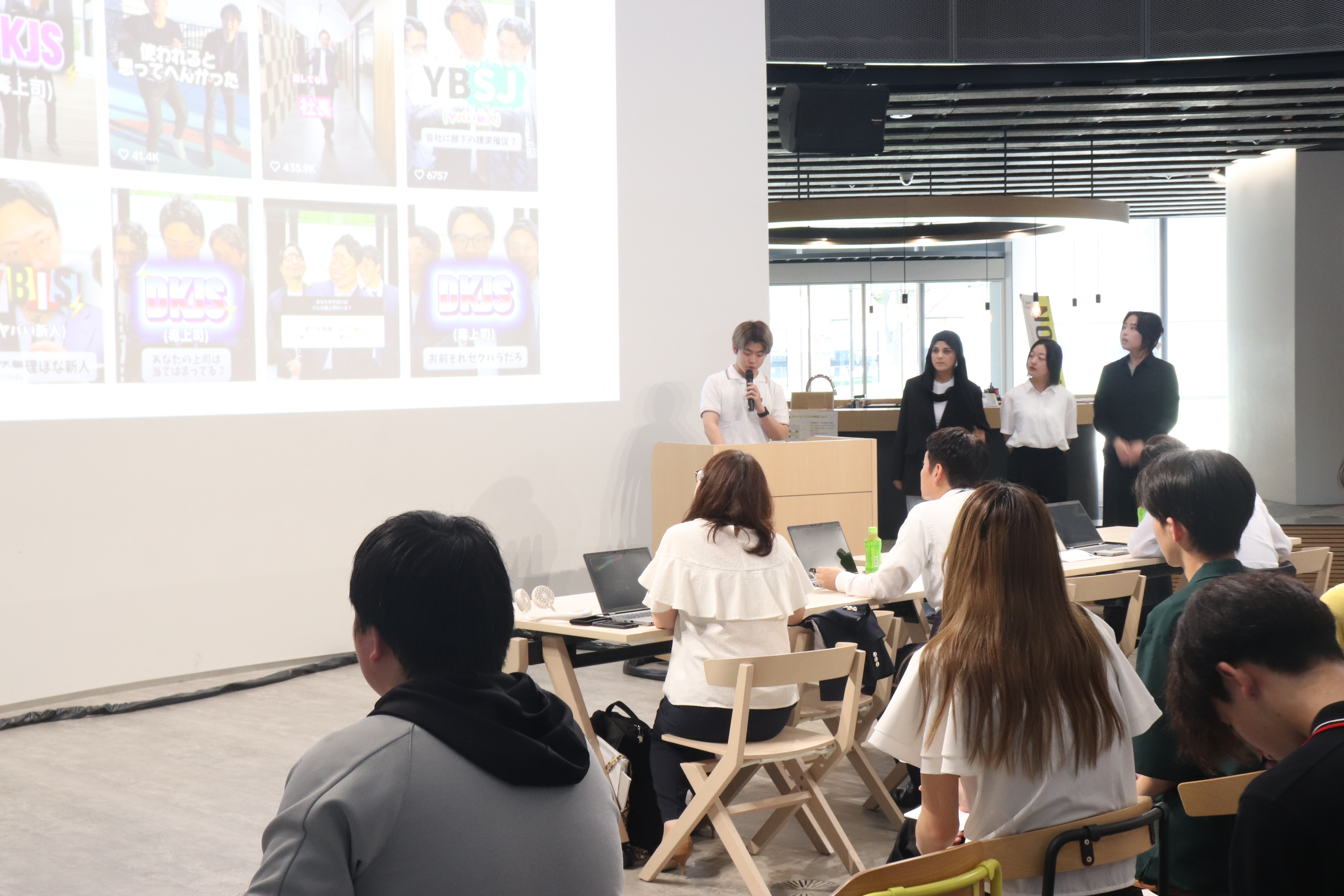 4月のキックオフからおよそ3ヶ月間、学生たちはクラスごとにチームを組み、調査、データ分析、複数回のクラス内発表を重ねて提案内容を磨き上げました。ゼミ内での中間プレゼンを経て代表6チーム(3クラスそれぞれ2グループ)が選抜され、7月15日の最終発表会へ進出。審査員として来学されたのは、執行役員・中根英昭氏、採用グループマネージャー・小暮広和氏、同グループの前口紗智子氏でした。