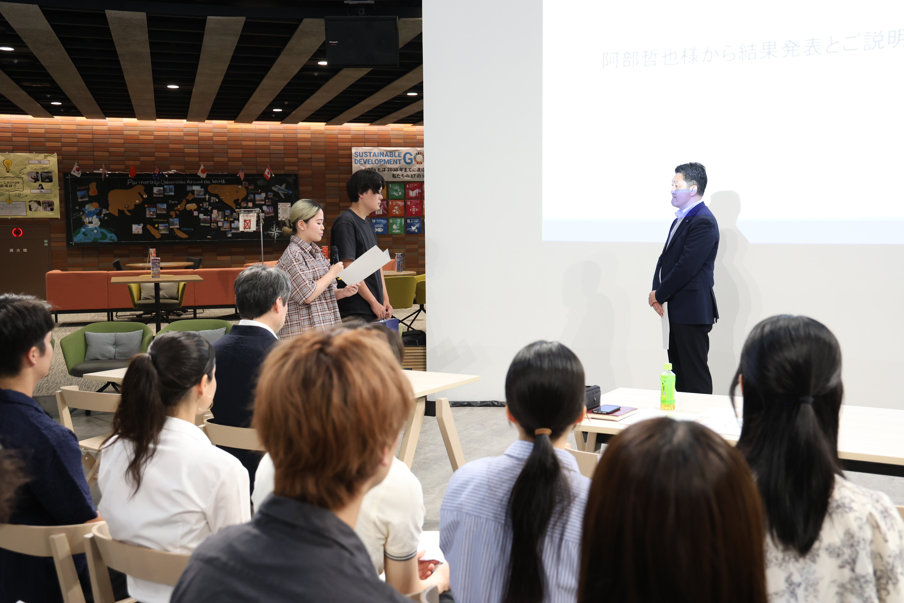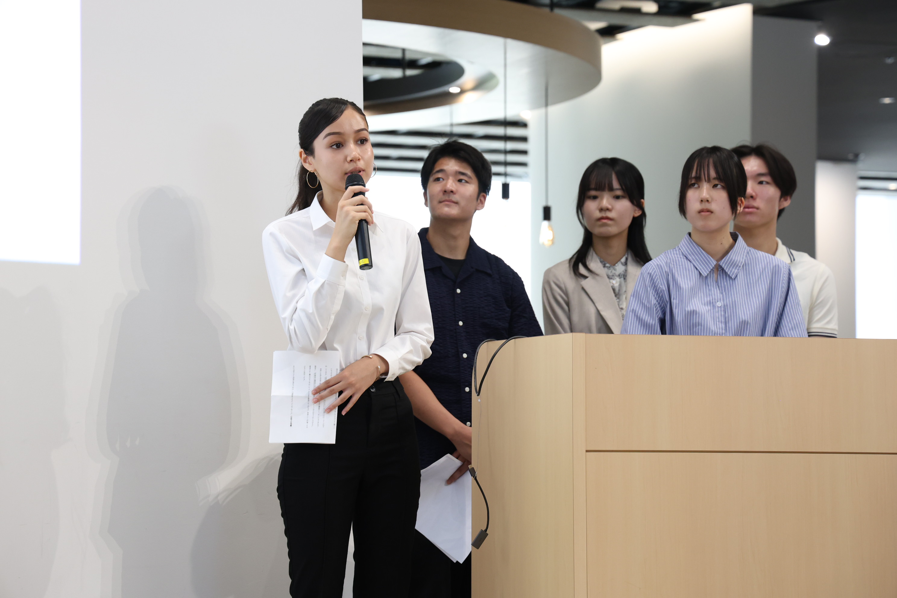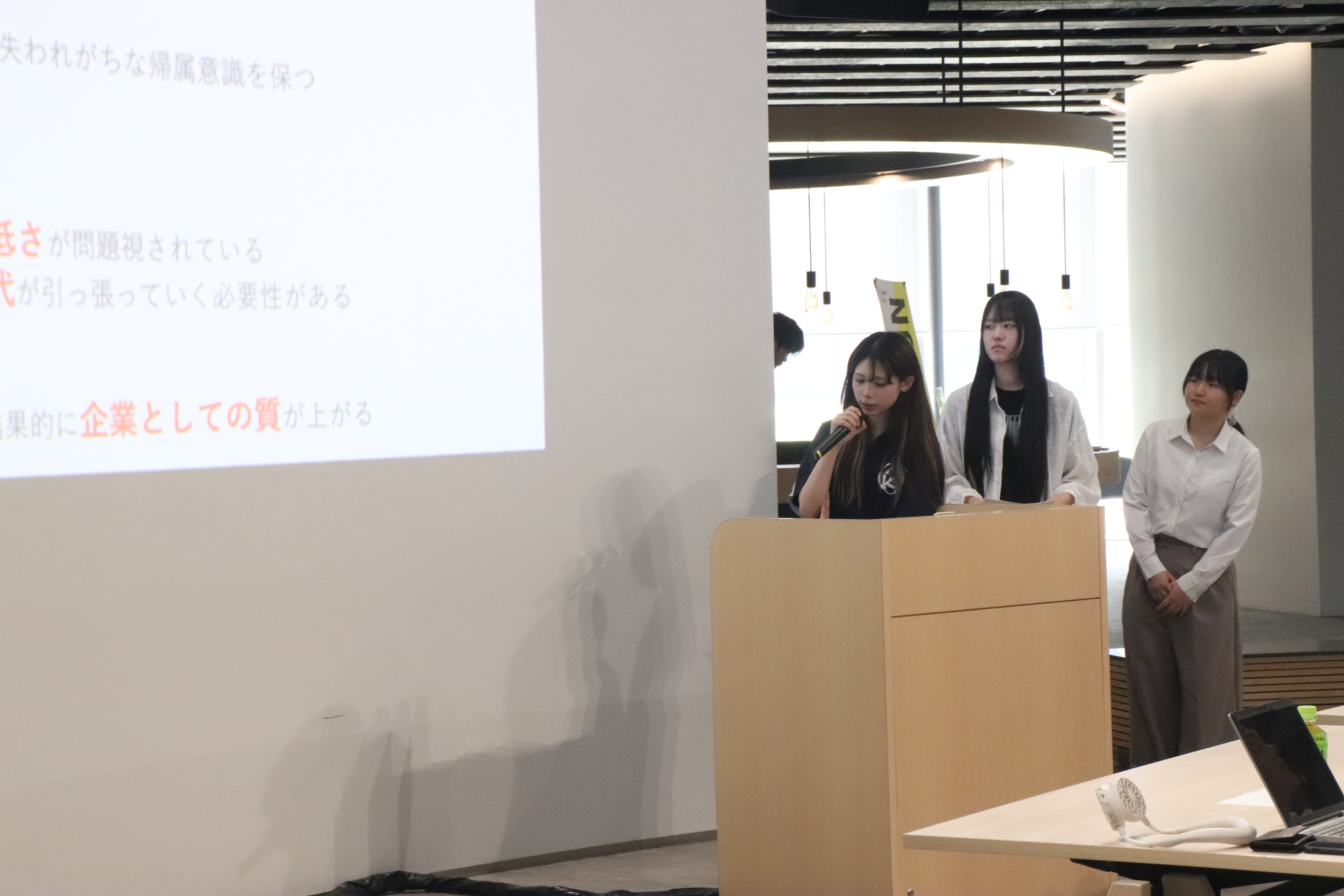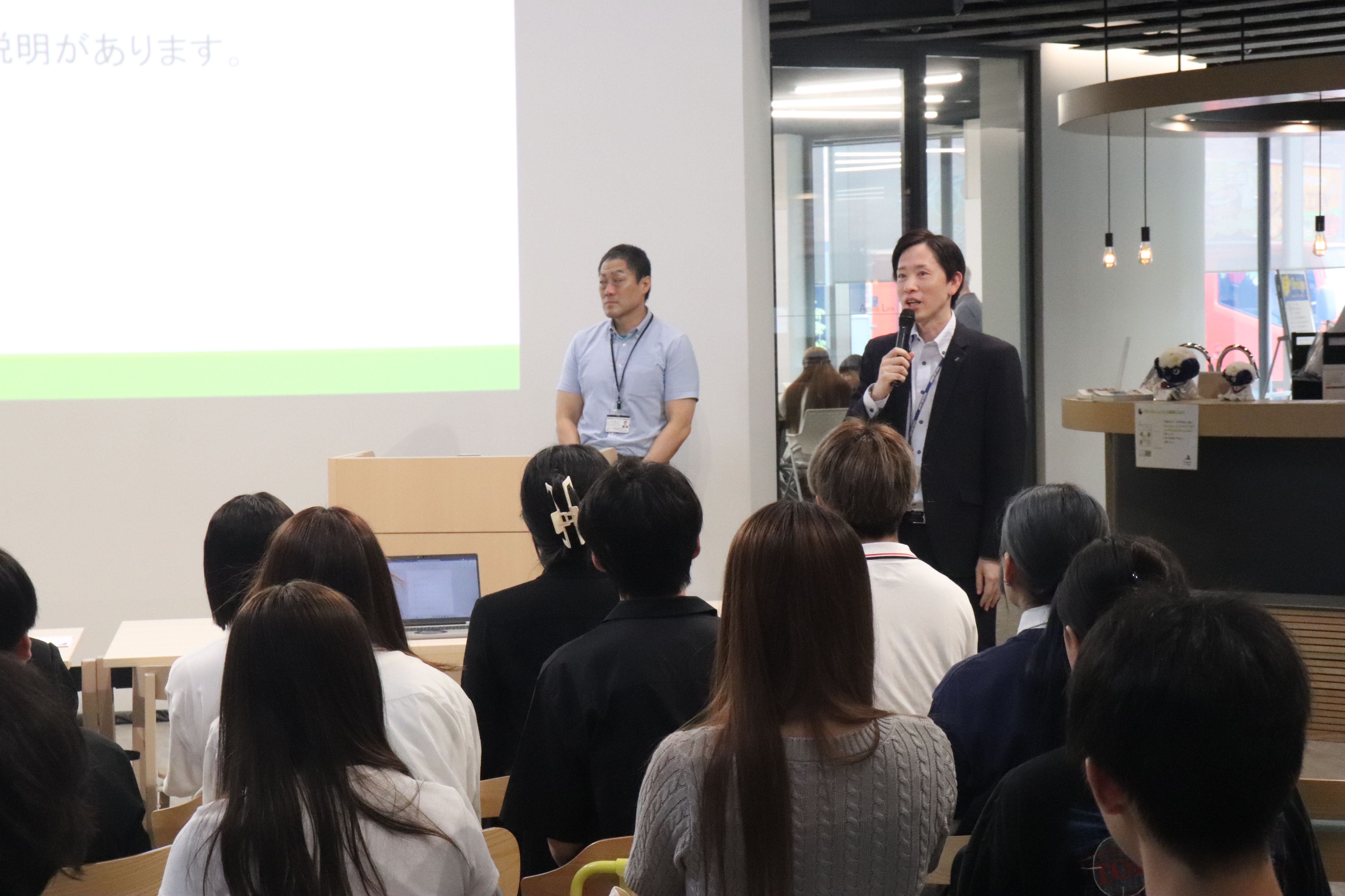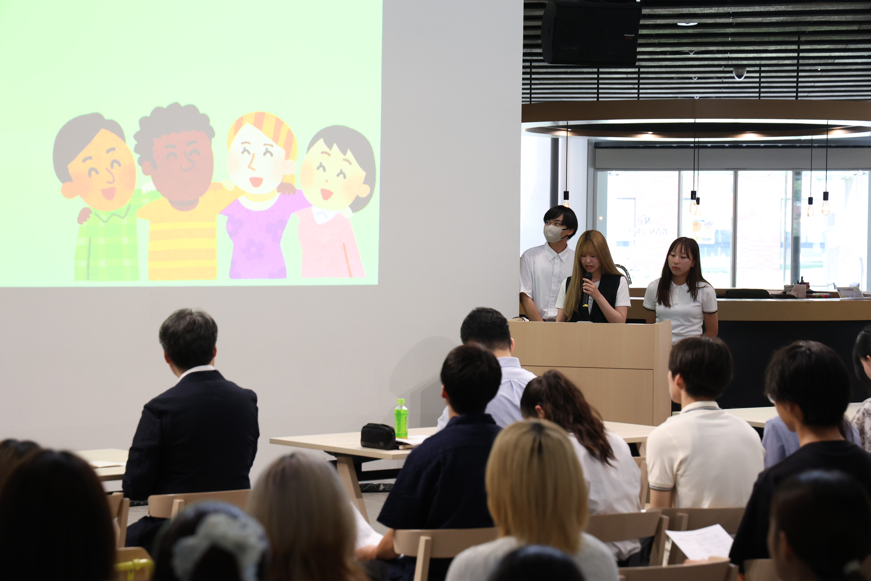 4月のキックオフからおよそ3ヶ月間、学生たちはクラスごとにチームを組み、調査、データ分析、複数回のクラス内発表を重ねて提案内容を磨き上げました。ゼミ内での中間プレゼンを経て代表6チーム(3クラスそれぞれ2グループ)が選抜され、7月15日の最終発表会へ進出。審査員として来学されたのは、執行役員・中根英昭氏、採用グループマネージャー・小暮広和氏、同グループの前口紗智子氏でした。