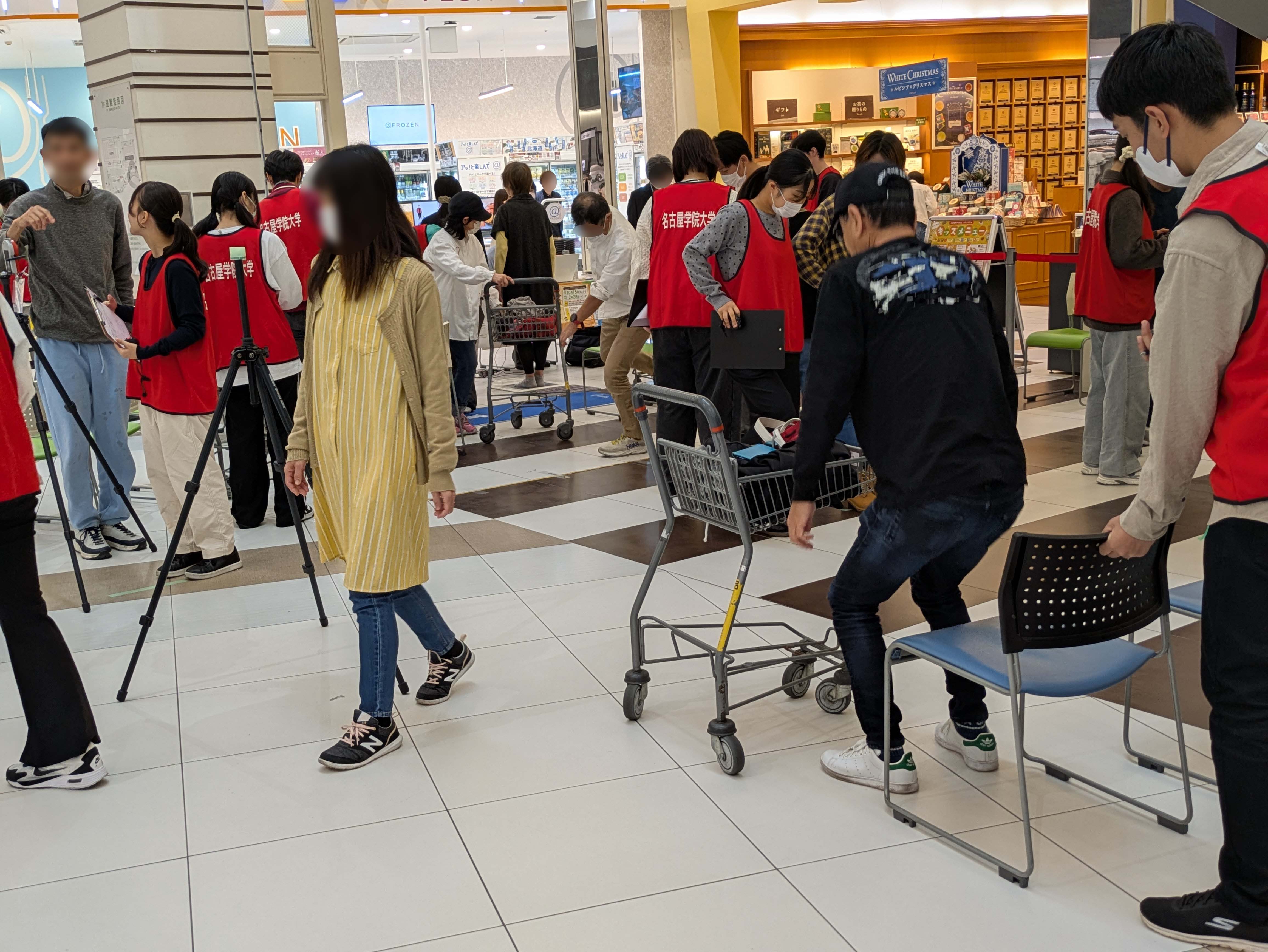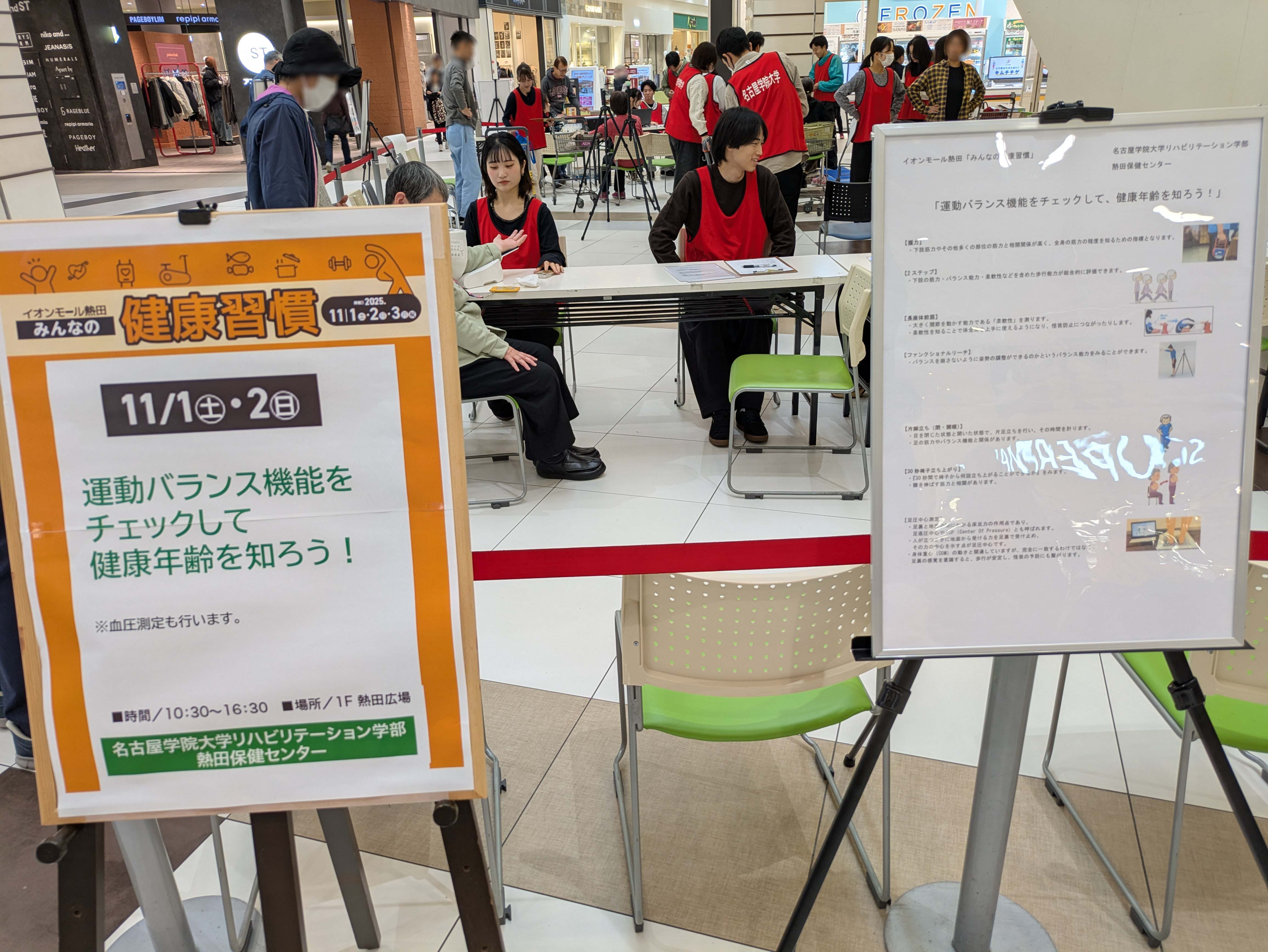 11月1日(土)、2日(日)にイオンモール熱田で開催された「みんなの健康習慣」に、リハビリテーション学部が熱田保健センターと共同で「運動バランス機能をチェックして、健康年齢を知ろう!」というブースを出展しました。リハビリテーション学部1年生から4年生まで延べ36名が3名の教員とともに、血圧、握力、2ステップテスト(ロコモ度検査)、長座体前屈、片脚立ち、椅子立ち上がり、足圧中心測定(重心動揺)などを測定し、筋力、バランス能力、柔軟性、移動能力を評価しました。両日で218人の方が当ブースを訪れ、学生は測定と結果説明を行いました。