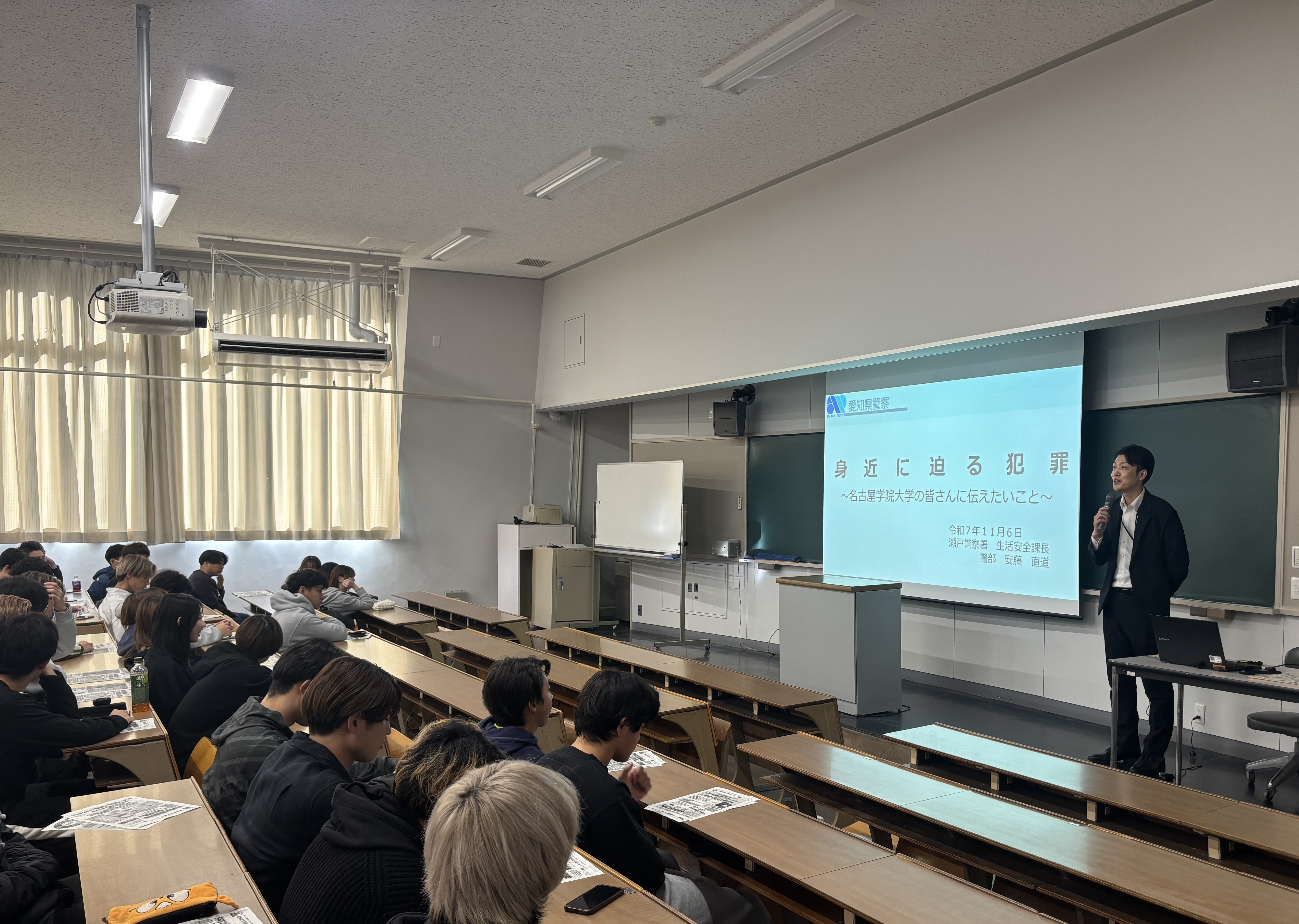 2025年11月6日(木)、「スポーツ健康基礎演習」(1年次秋学期のゼミ科目)において、瀬戸警察署 安藤直道様のご協力により、「身近に迫る犯罪〜名古屋学院大学の皆さんに伝えたいこと〜」というテーマで、薬物、いわゆる「闇バイト」、SNS等を通じた詐欺に関する啓発講演を実施いたしました。