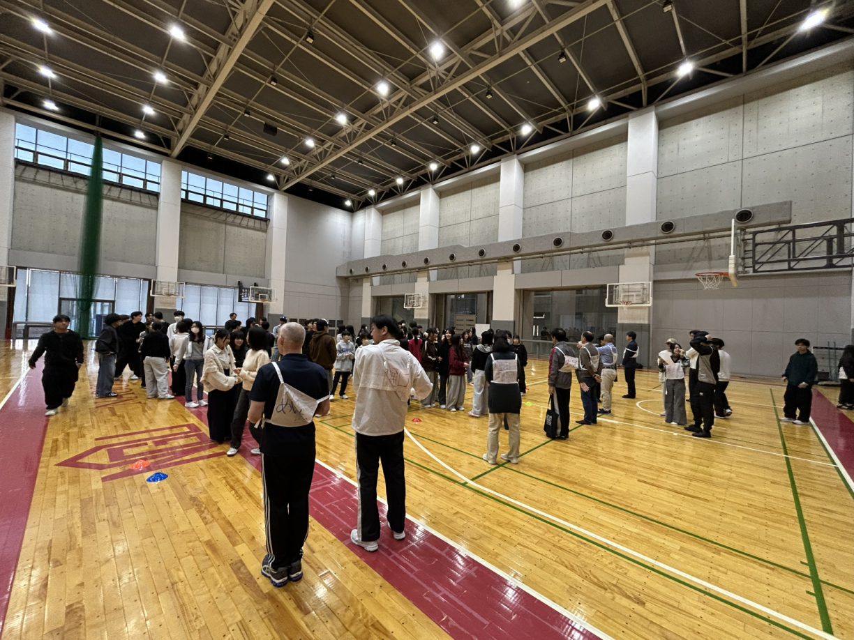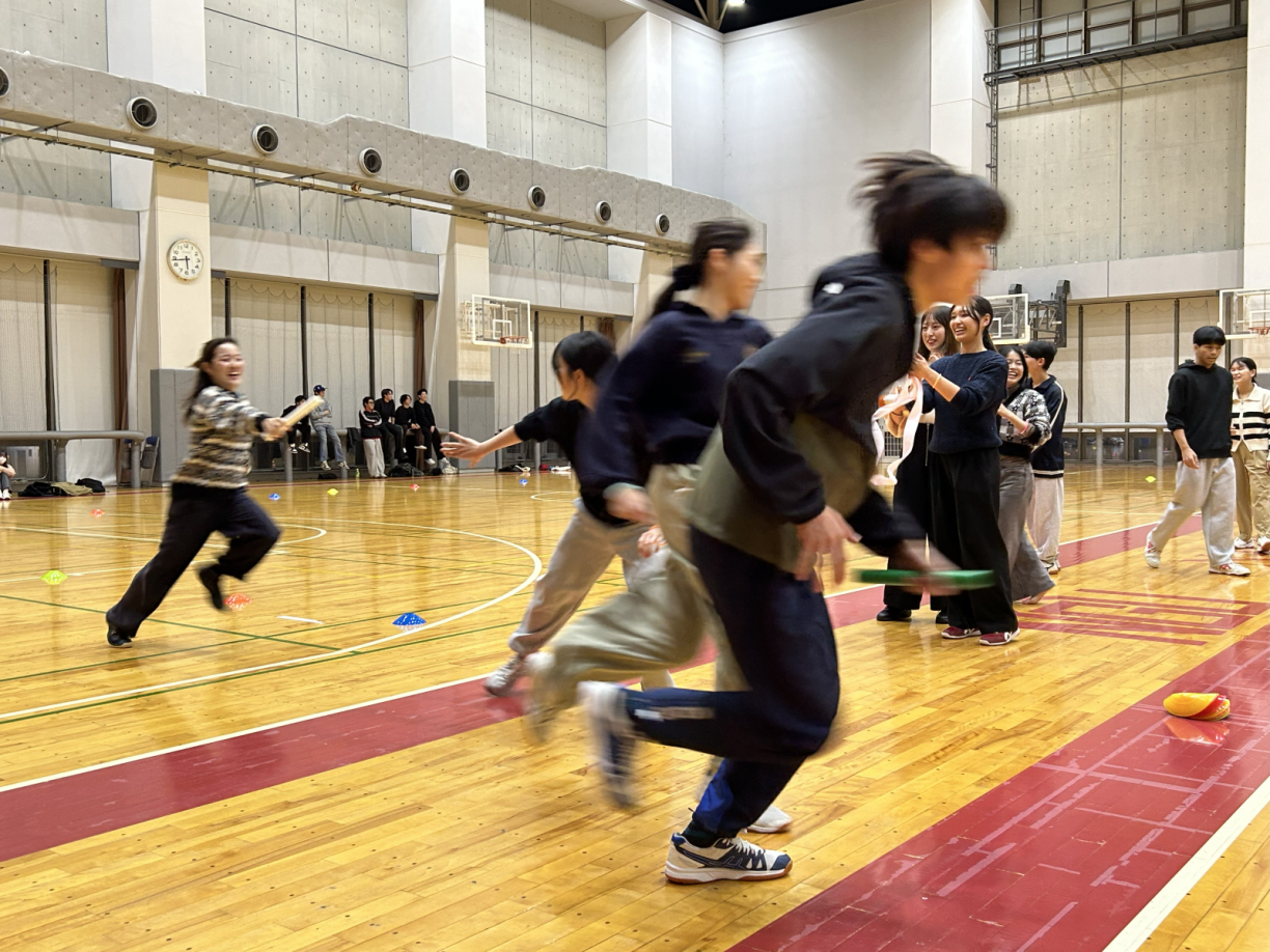 2025年11月11日(火)に本学名古屋キャンパスアリーナにて、国際文化学部3年ゼミ対抗運動会を開催しました。3年生有志学生の発案で企画・運営したこの催しは、11月11日にちなんで「ポッキースポーツフェスティバル」と命名されました。ゼミメンバーと協力して競技することで、ゼミの仲間意識と団結力を強めよう!との合言葉で、10ゼミ・百数十名が参加し、