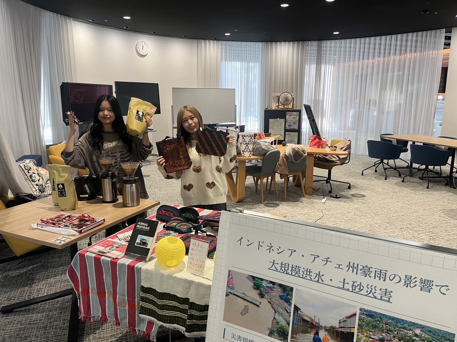 名古屋キャンパスたいほうのi-Lounge で開催された「国際フェア」にて、国際文化学部・佐伯ゼミは12月2、5日、インドネシア・アチェ州の民芸品やコーヒー、ヘナタトゥーの販売をおこないました。今回の出展は、アチェ州の文化を紹介するとともに、現地で発生している災害支援につなげることを目的としたものです。