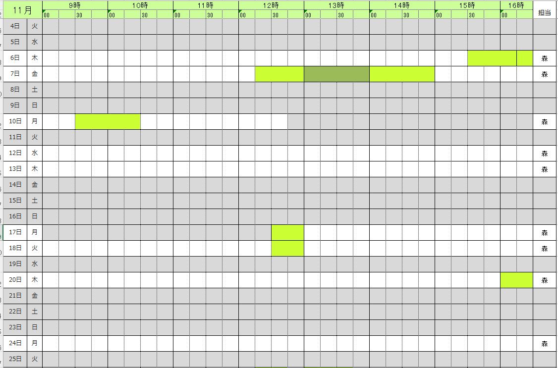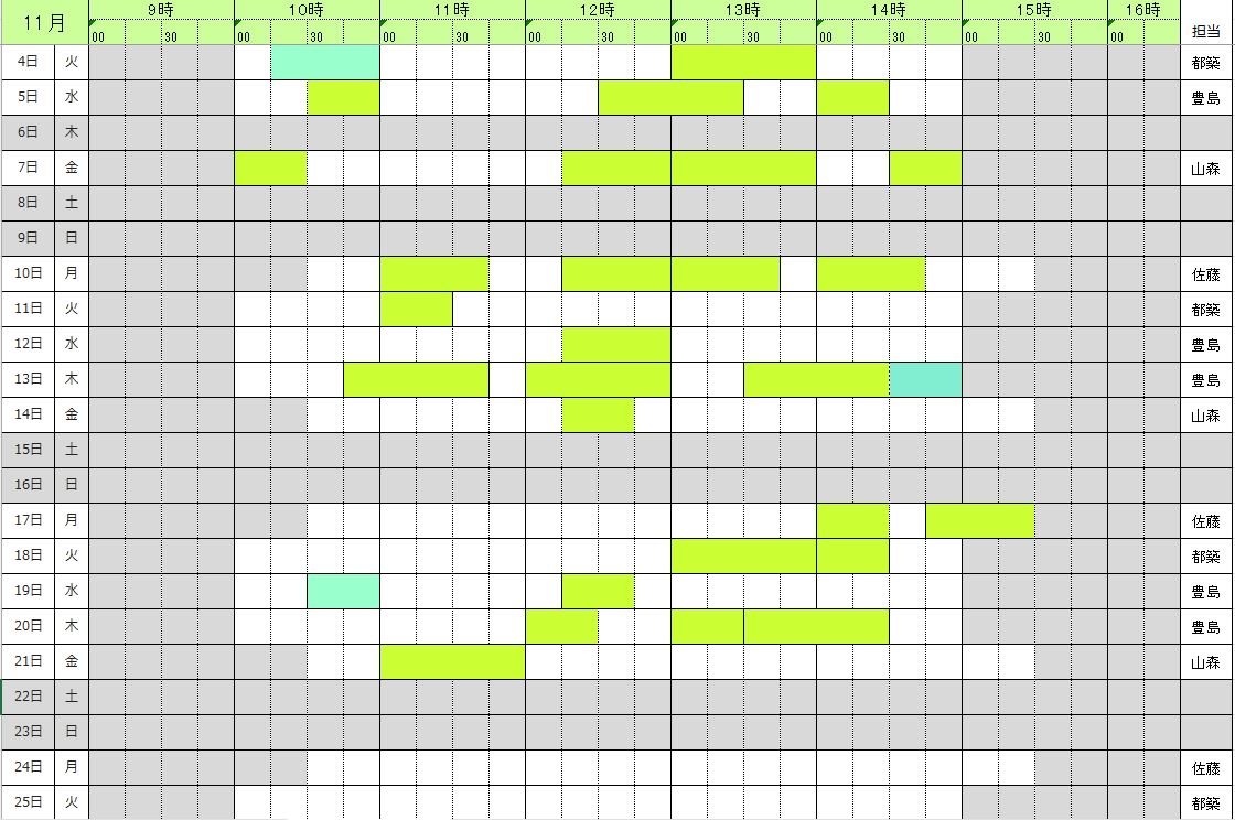 | (灰) | 閉室 | (紺) | 予約不可 | (橙) | イベント |