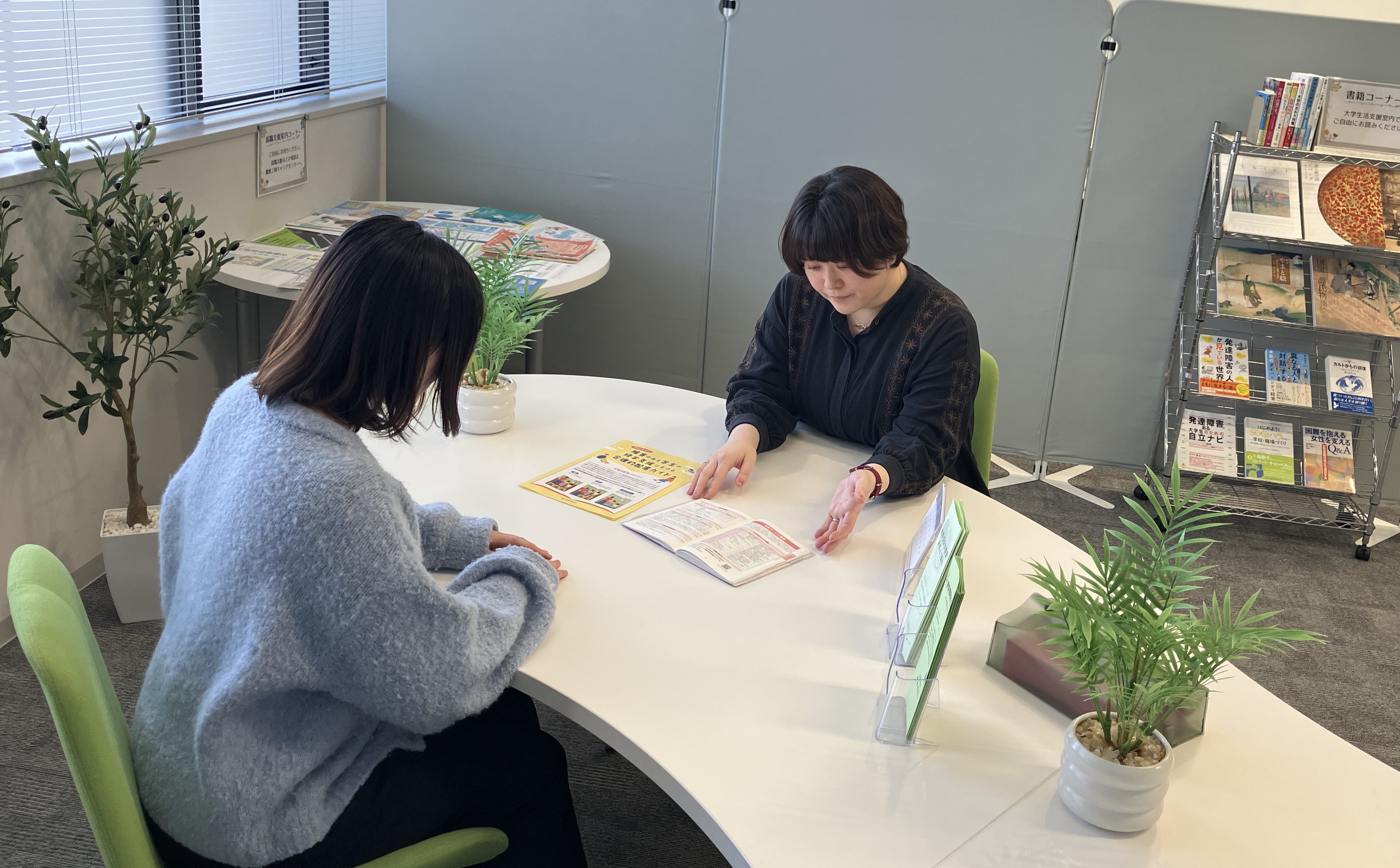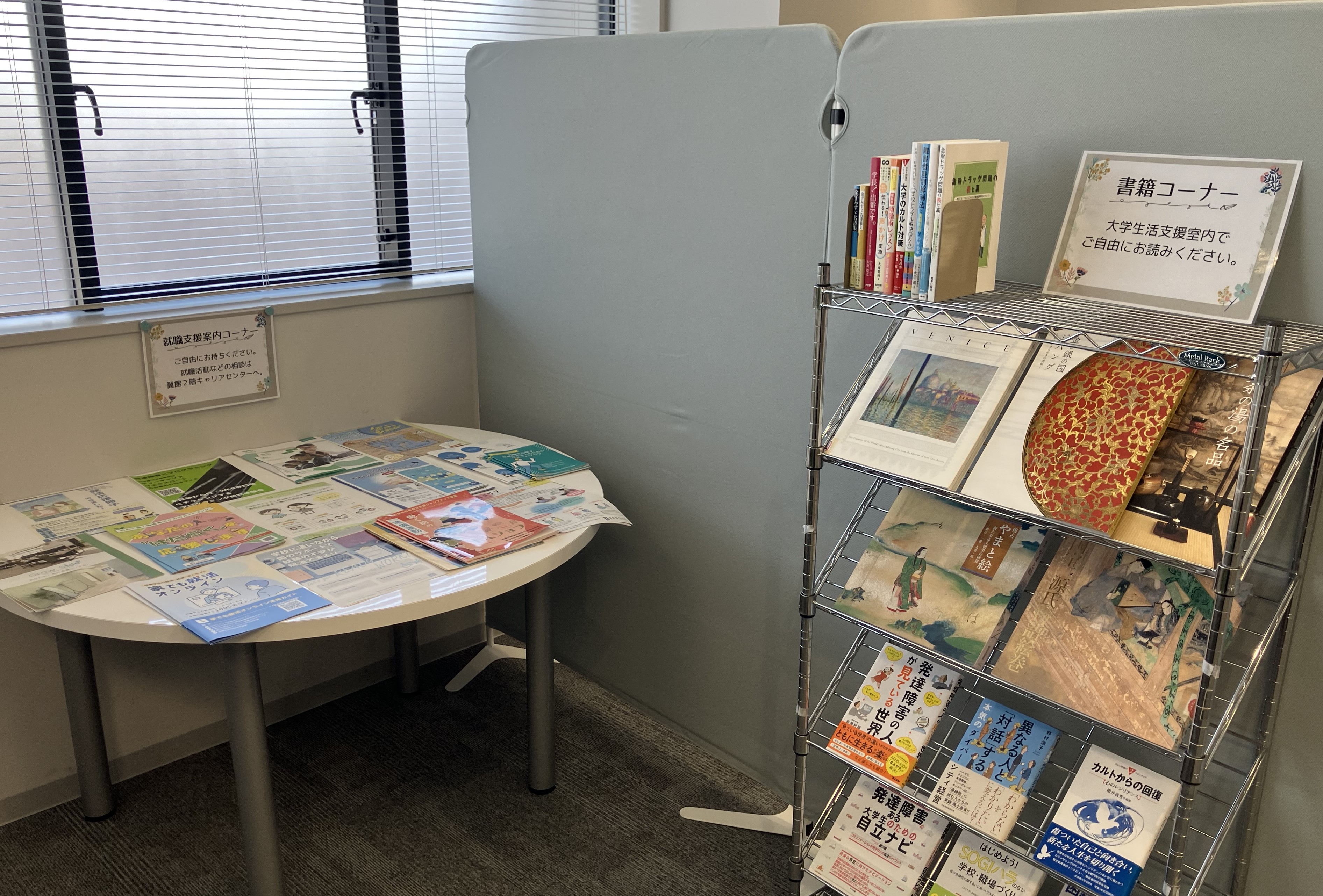キャリア支援に関するチラシコーナーや図書閲覧コーナーを設置しています。ご興味のある方はお気軽にお越しください。また、図書閲覧コーナーでは、学術情報センター(図書館)と連携し、年間を通してさまざまなイベントを開催しています。各イベントに合わせて関連図書の展示も行っています。