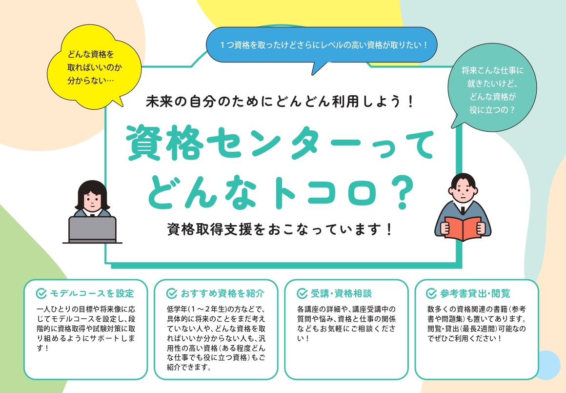 資格センターは、未来を真剣に見つめ、資格取得に励む学生さんを全力でサポートします。