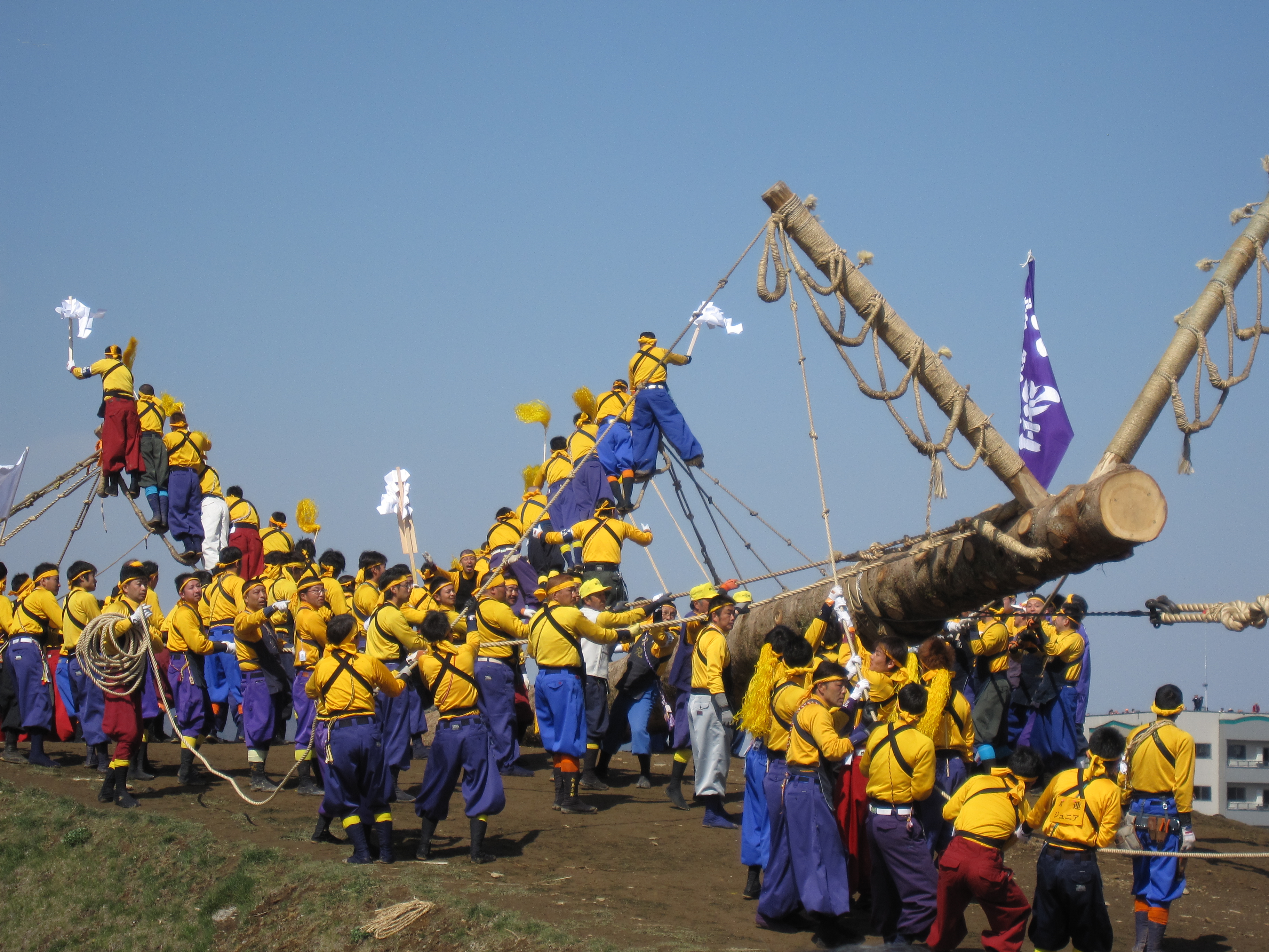 長野県諏訪大社での御柱曳き。中世の柞原八幡宮では御柱の「川曳き」がメインだった。