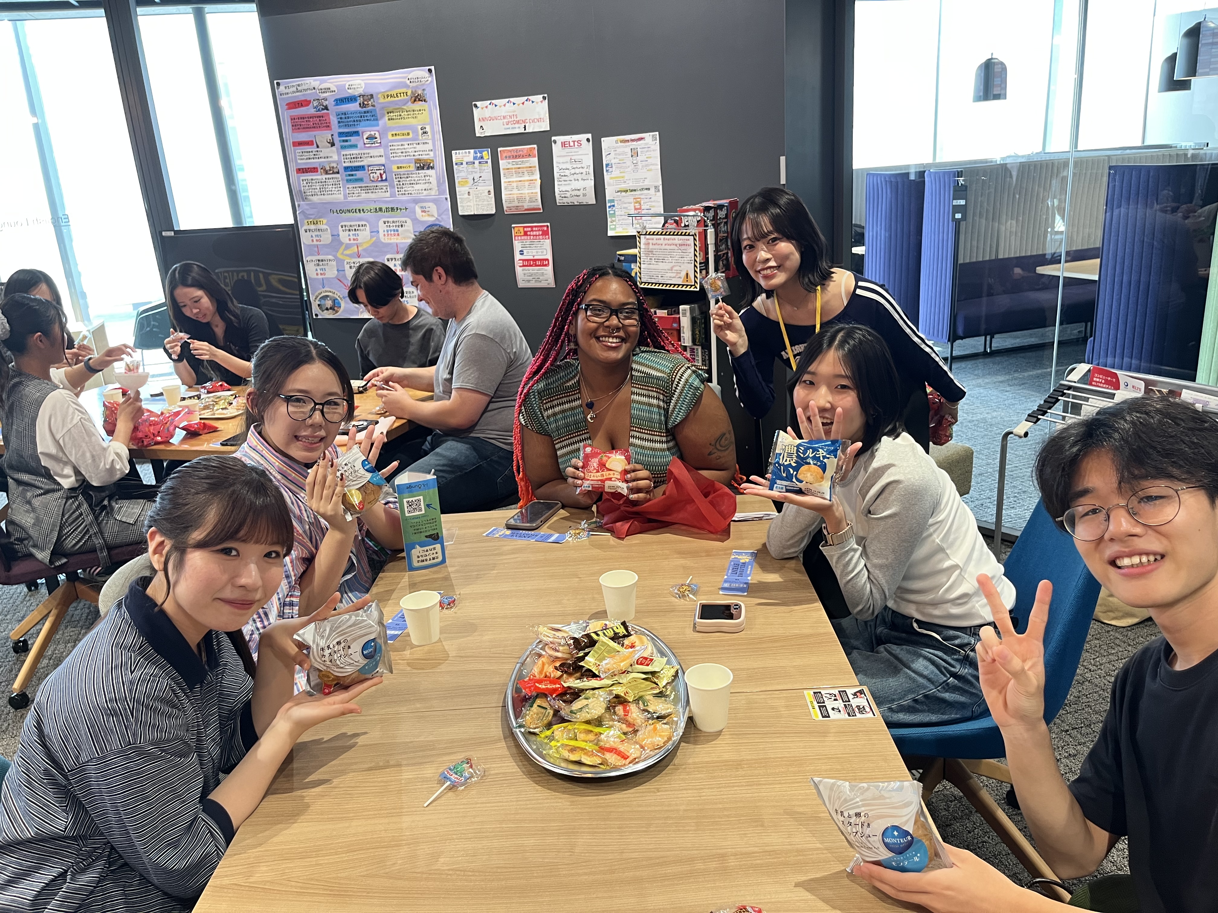 i-Loungeは名古屋学院大学の留学生が集う場所となっています。お昼の時間など、時間があるときに、i-Loungeにふらっと来てくれるだけで留学生と交流することができます。留学生も、日本にとても興味があるので、是非積極的に声をかけてみてください。まずは、i-Loungeのいろいろなイベントに参加してみる。これが留学生と友達になる第一歩です♪