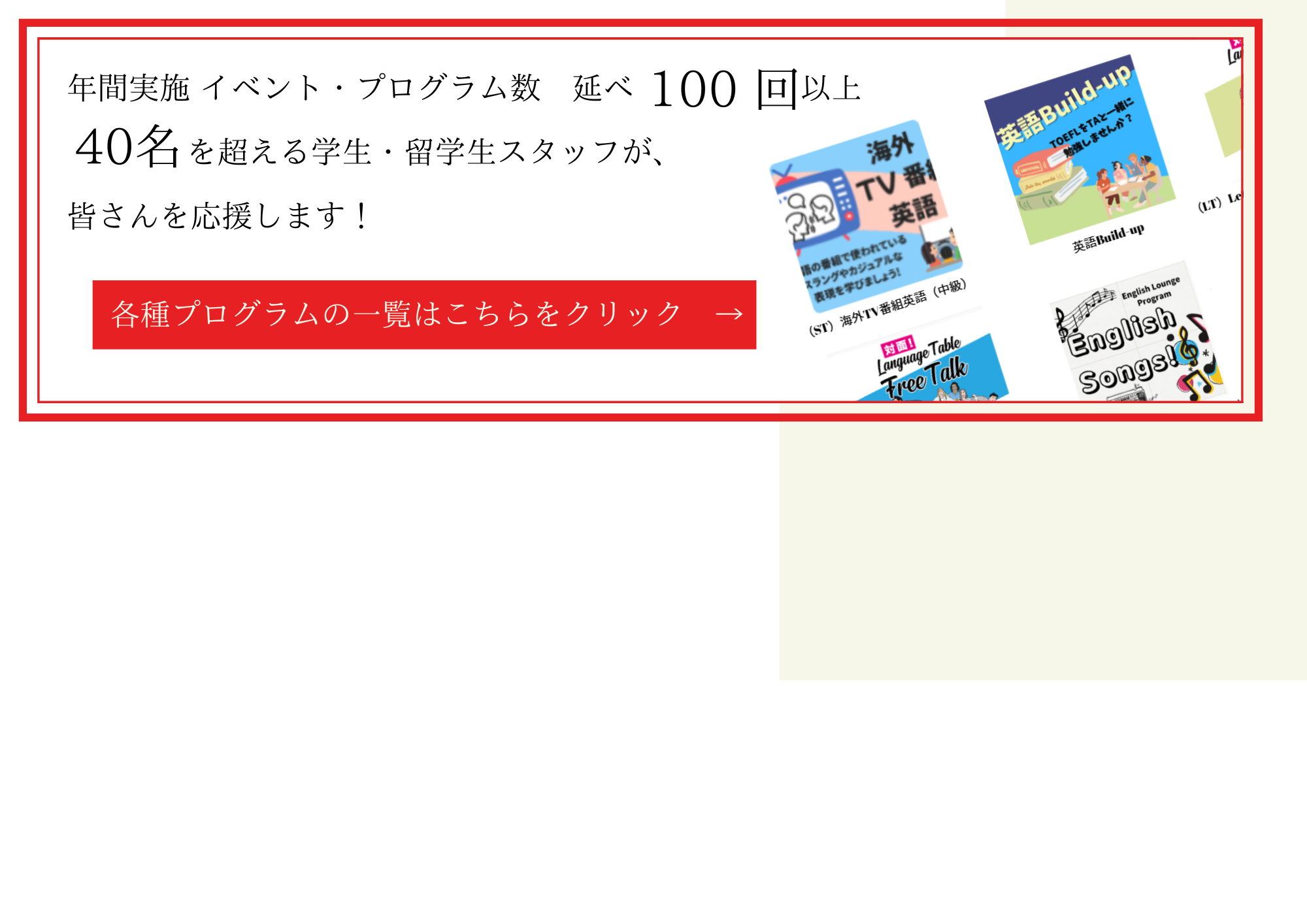 英語ラウンジでは、「ELプログラム(初級~上級英会話)」が受け放題。20分の短時間で気軽に参加できるものから、ビジネス英語、留学希望者向けの試験対策まで多彩なプログラムがすべて無料♪