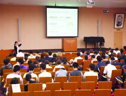当日は、学生自治会・学生課から申請書類の手続き、規約についての説明の他、保健師からの外傷した場合の対処法、講師によるクラブ活動の上で必要な自己の啓発やコミュニケーションの大切などを学ぶことができました。