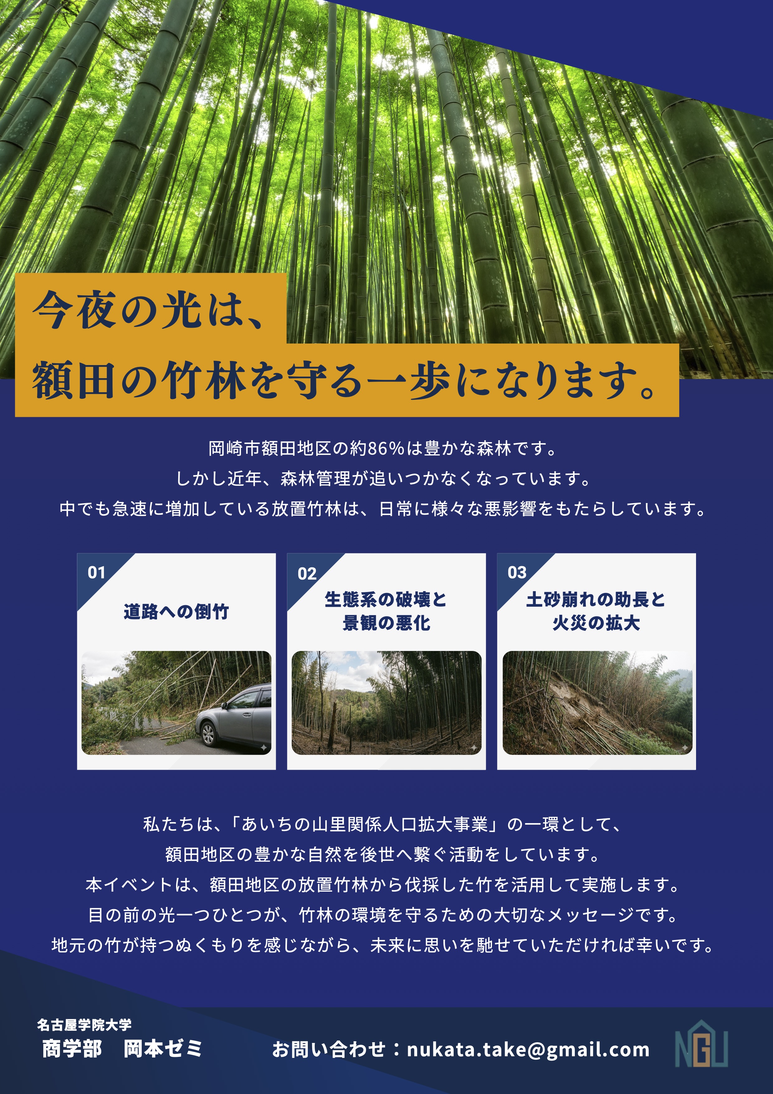 この課題に真正面から向き合い、竹に新たな価値を与えようと活動しているのが、経営学部教員の岡本純ゼミに所属する「竹チーム」の学生たちです。彼らは、2025年11月にオープンしたばかりの「三井アウトレットパーク 岡崎」を舞台に、来場参加型のライトアップイベント『祈り竹ライトアップ ―額田の竹で照らす未来―』を開催します。