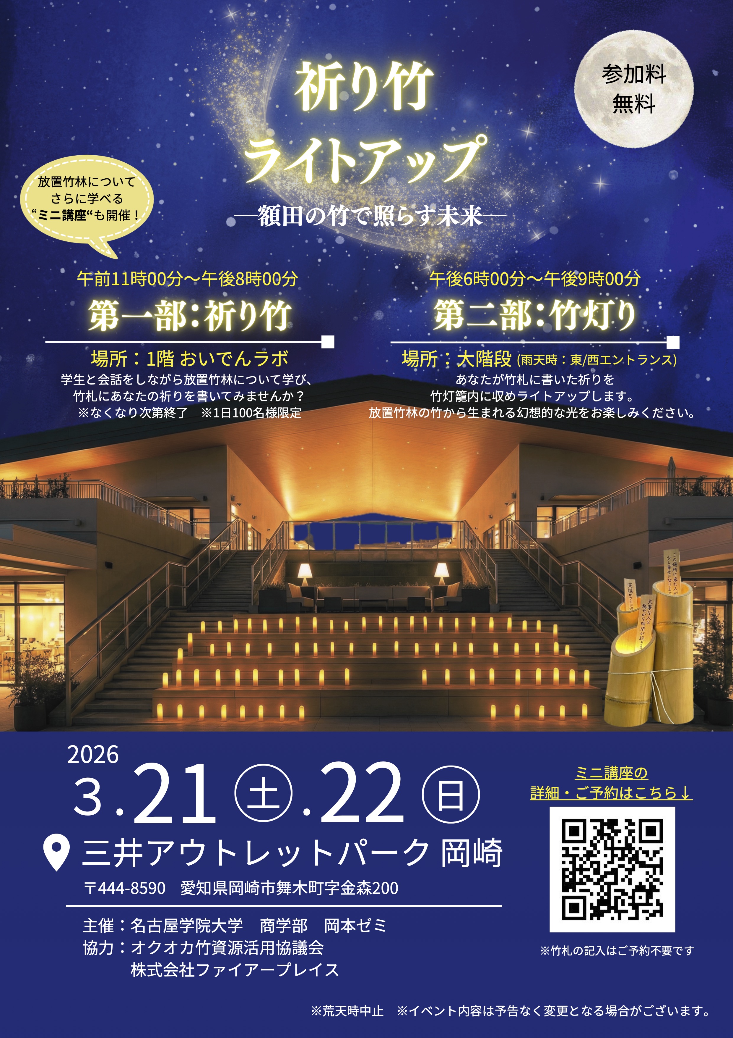 3.  >  【3/21・22開催】岡本ゼミの学生が三井アウトレットパーク岡崎にてイベント「祈り竹ライトアップ」を開催