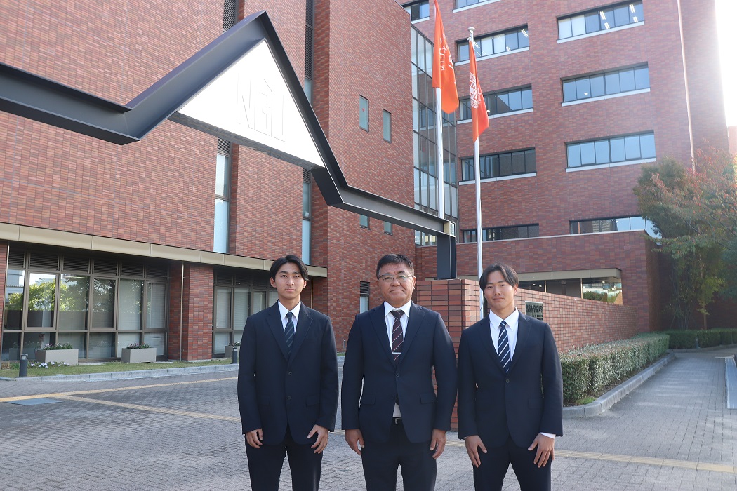 2025年11月11日(火)、硬式野球部が2025年度秋季リーグ戦の結果を西中利也理事長、赤楚治之学長に報告しました。硬式野球部から、馬場茂監督、主将の片岡将選手、坂野光輝選手が参加しました。
