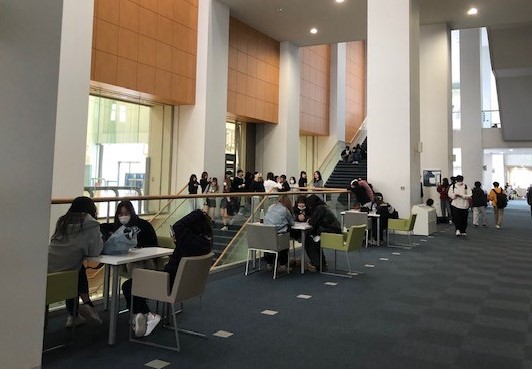 今回は、大規模地震とそれに伴う津波を想定した訓練を実施しました。学生・教職員が参加し、緊急地震速報を受信した想定からシェイクアウト訓練を行った後、学生や在館者の避難誘導、自衛消防組織による情報収集、被害状況調査を行いました。