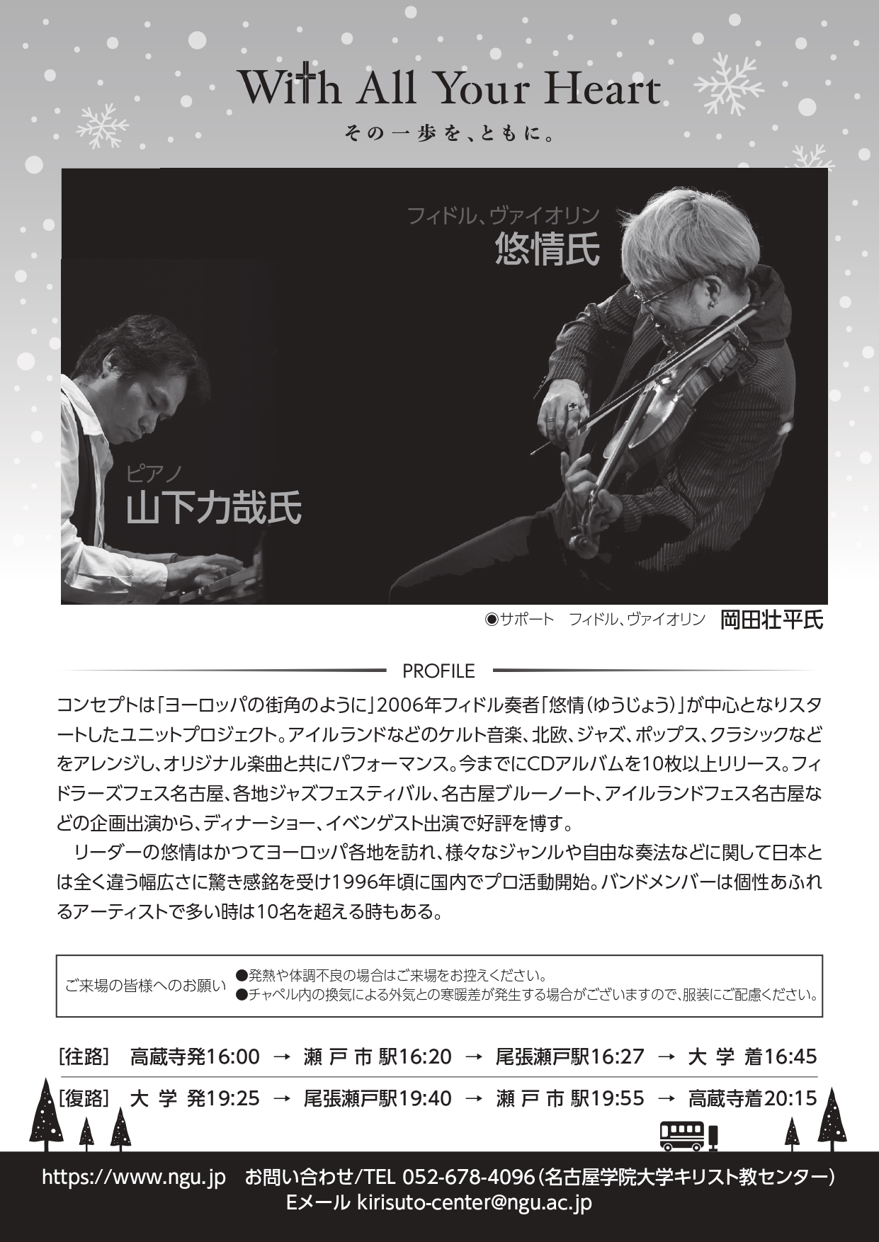 チャペルコンサートは、悠情氏(フィドル、ヴァイオリン)、山下力哉氏(ピアノ)、サポートに岡田壮平氏(フィドル、ヴァイオリン)をお迎えし、北欧、アイリッシュ音楽を演奏していただきます。美しくそして楽しい音楽をぜひお楽しみください。クリスマスの聖なる夜をご一緒に過ごしませんか。事前の申し込みは不要です。