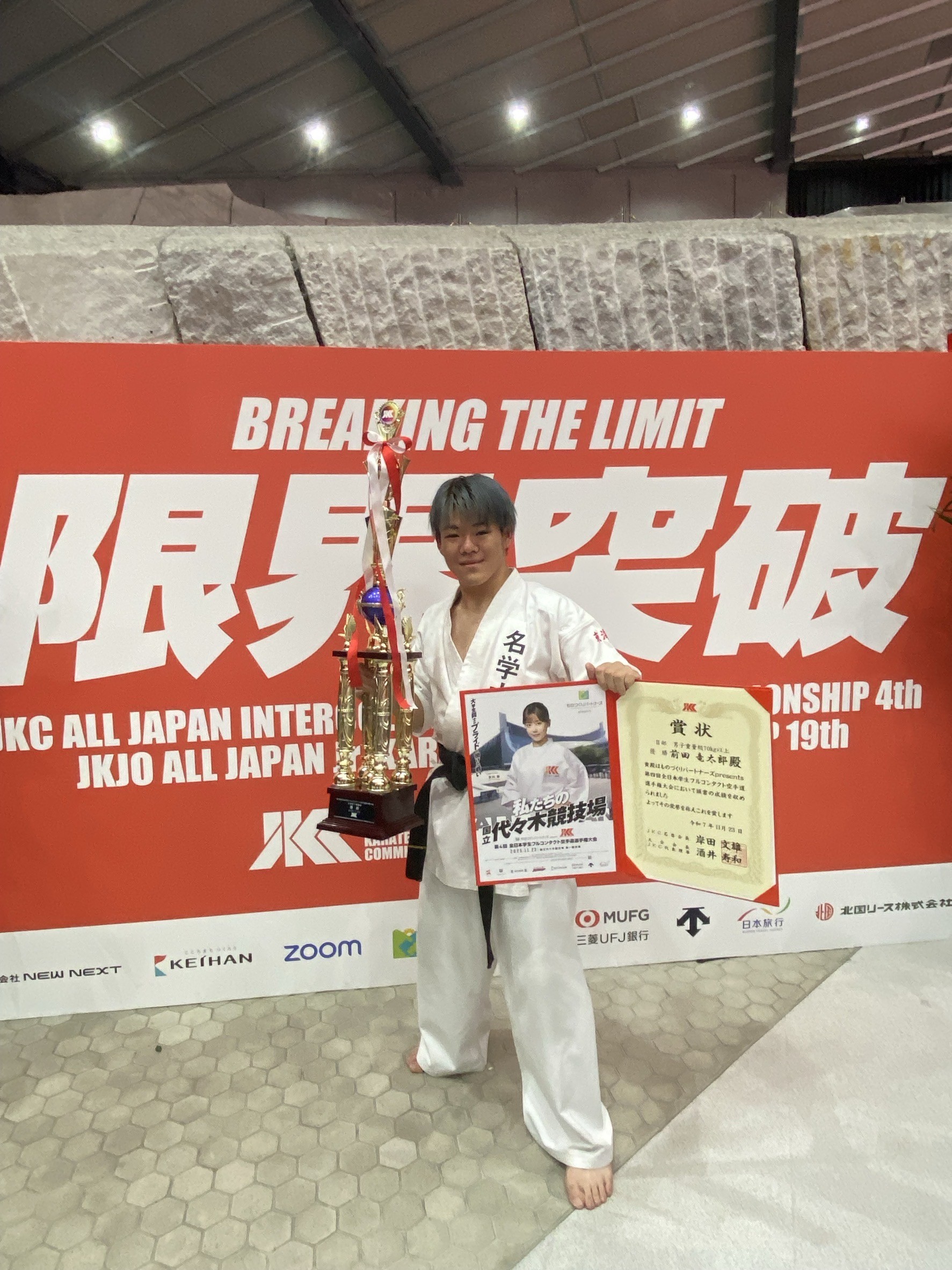 本学学生が「第4回全日本学生フルコンタクト空手道選手権大会」の2部インカレ男子重量級で優勝 2025年11月23日(日・祝)に「第4回全日本学生フルコンタクト空手道選手権大会」が国立代々木競技場第一体育館で開催され、2部インカレ男子重量級で本学現代社会学部2年の前田 竜太郎さん(所属:日本実戦空手道 七州会)が優勝しました。 今後も皆様の応援よろしくお願いします。