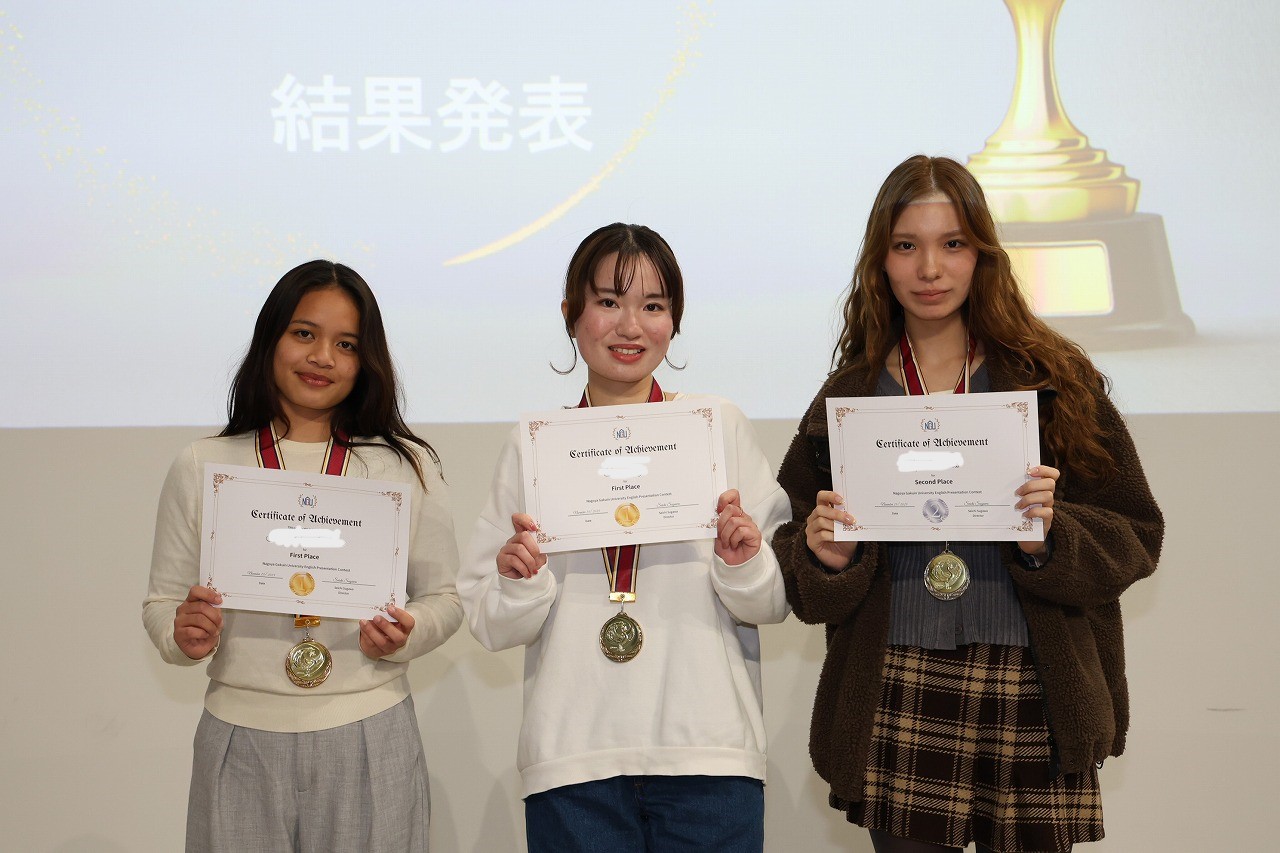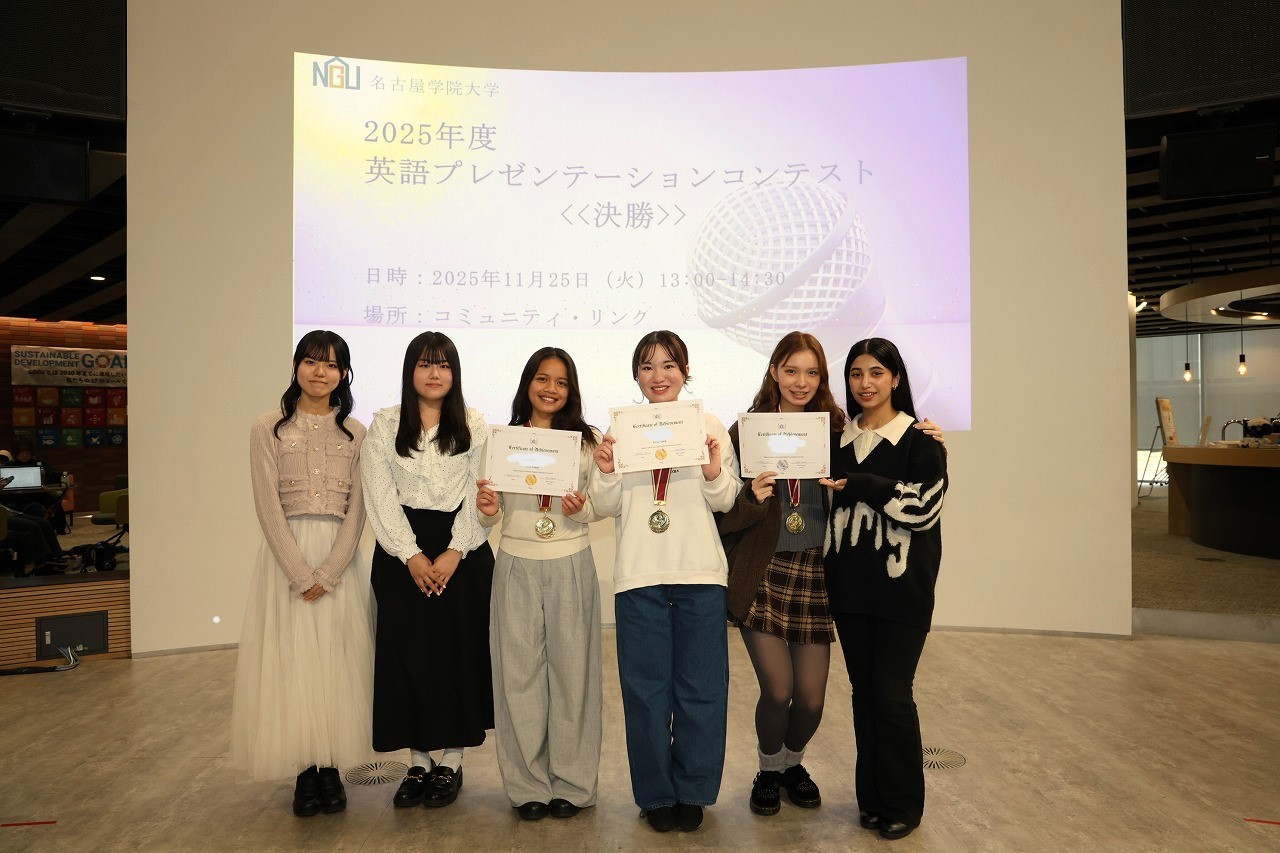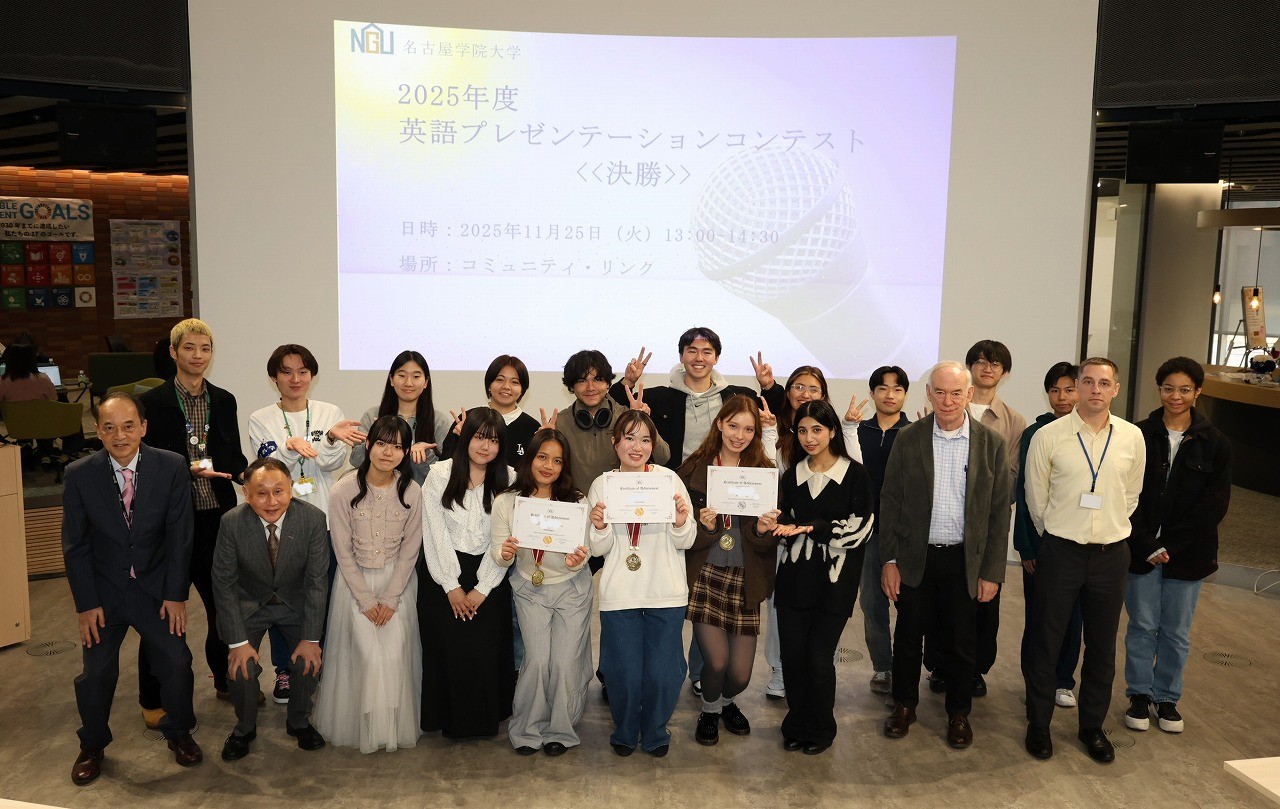 英語プレゼンテーションコンテストを実施しました 11月25日(水)に全学部生対象「2025年度 英語プレゼンテーションコンテスト<決勝>」を名古屋キャンパスたいほうにて開催いたしました 1年生の参加もあり、準備段階から熱心に練習を重ねてきたことが伝わる素晴らしい発表ばかりでした。 どの学生も堂々としており、語学への意欲と成長の姿が感じられるものでした。 結果 1位 How to "think" during the age of AI (外国語学部3年 E.T&K.N) 2位 The effect of SNS on our society (外国語学部2年 L.R)