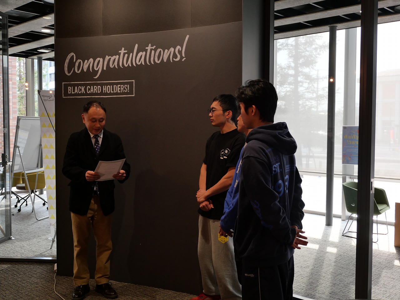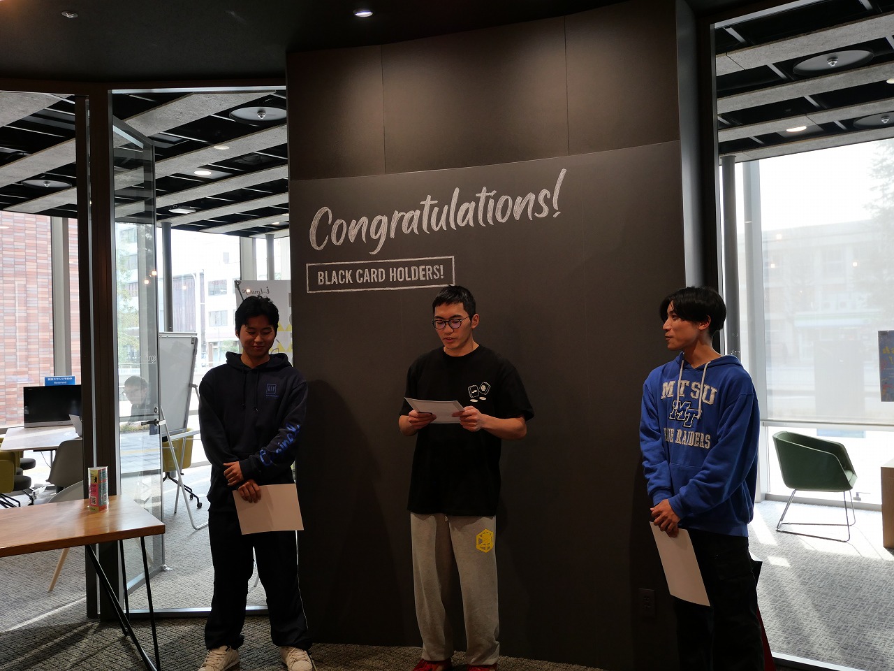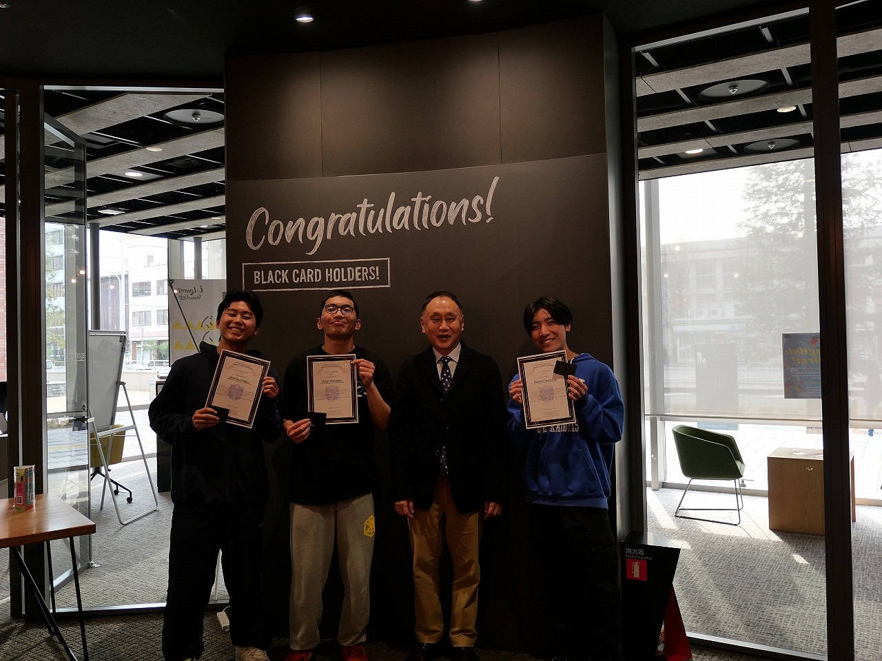 毎年2回ブラックカードチャレンジを開催し、毎回数名がチャレンジしていましたが、このたび3年ぶりに、3名の学生が「ブラック」レベルに到達でき、その証として「ブラックカード」を取得しました。