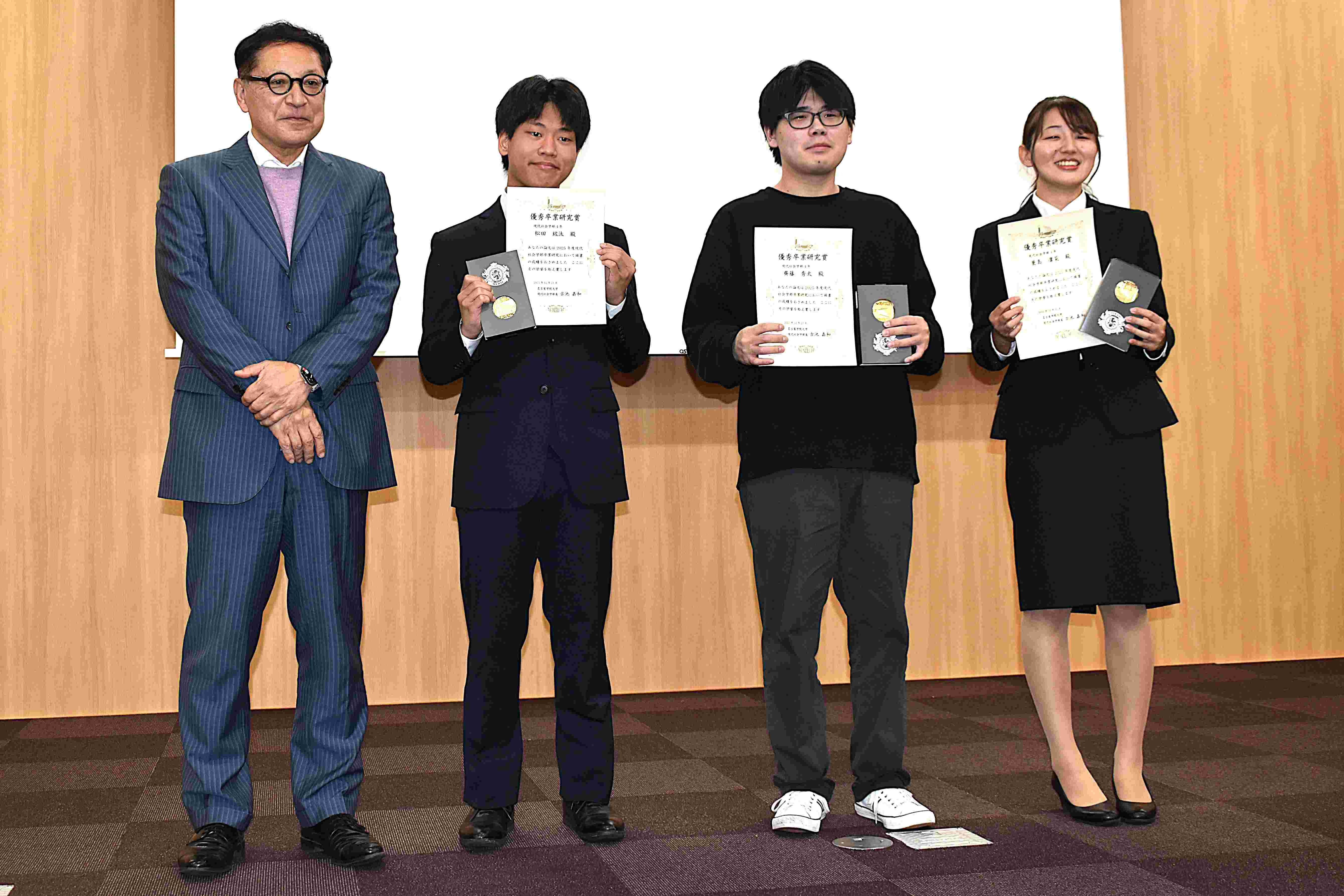 学部長から賞状やメダル等を授与されました。「oasiSコンペ成果報告会」では、2チームが