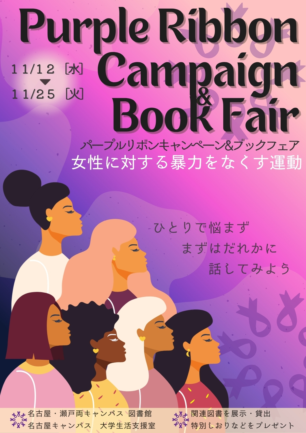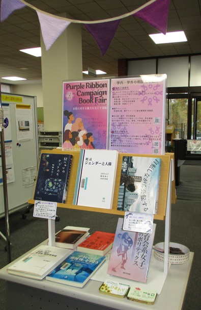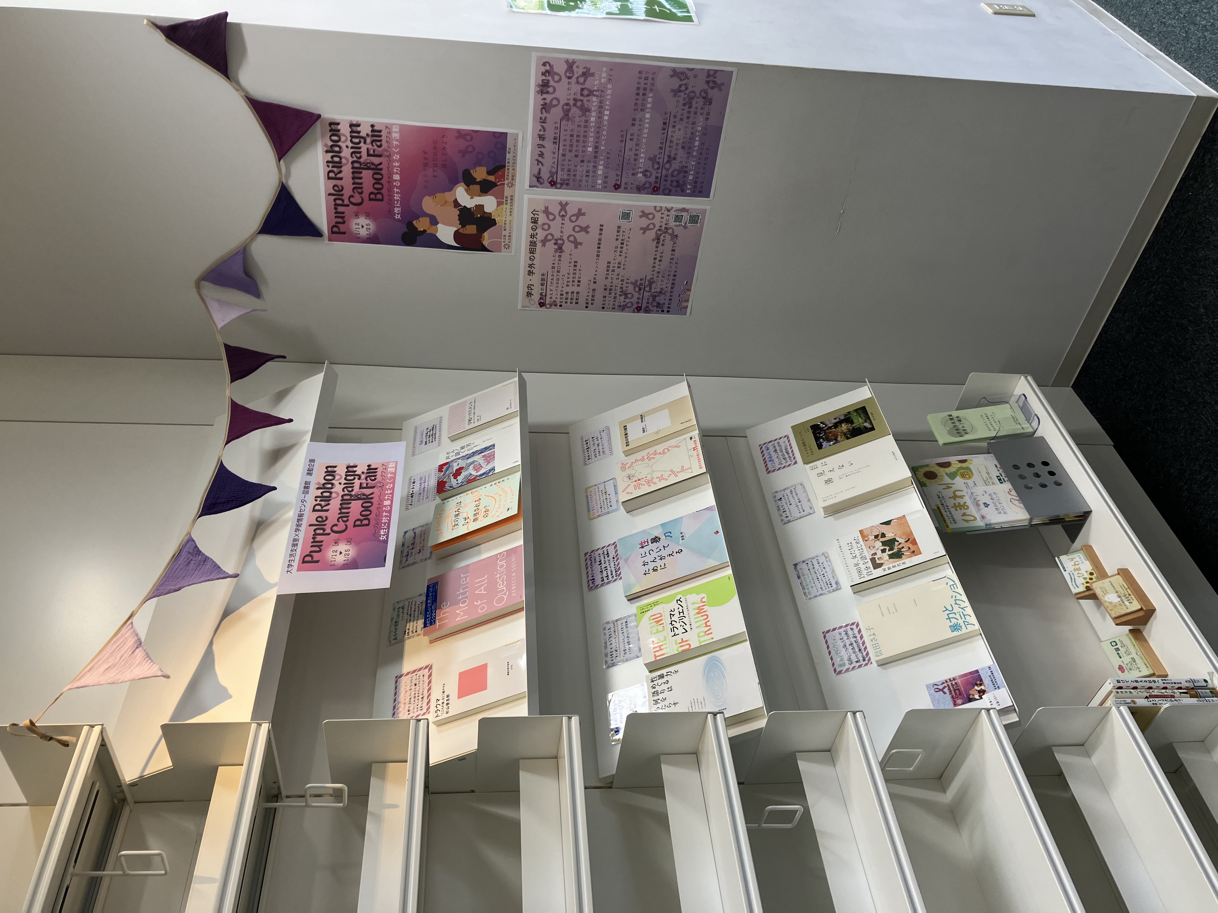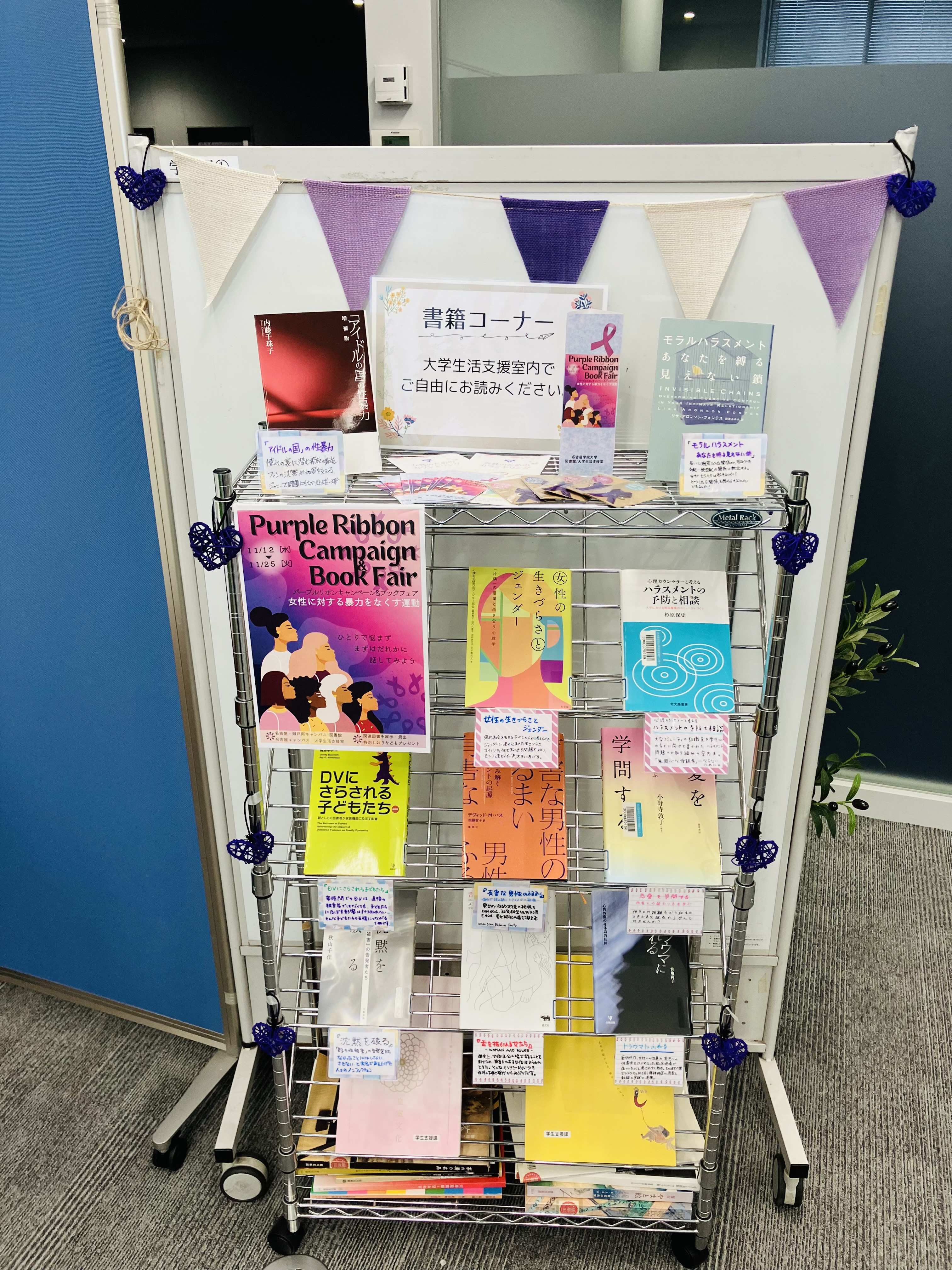 学内外の相談先の紹介 特別展示図書の閲覧 特別しおりのプレゼント パープルリボンピンのプレゼント ※なくなり次第終了 |