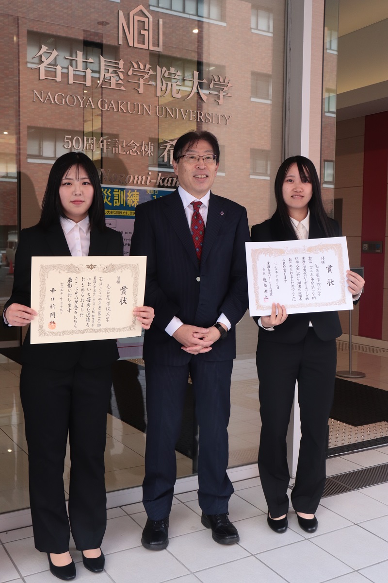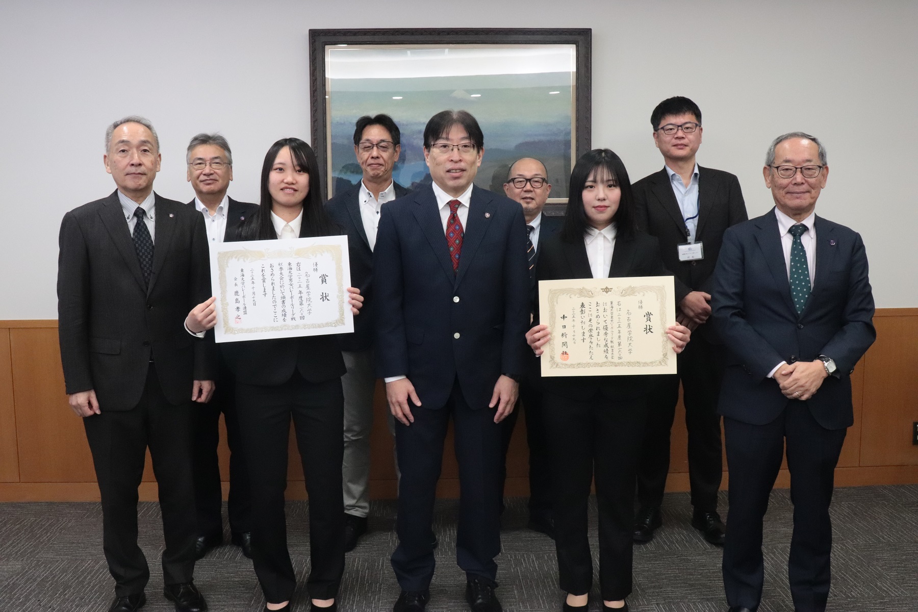 箕輪憲吾監督(スポーツ健康学部教授)は大会を振り返り、「非常に厳しい戦いが予想されていましたが、選手が粘り強くあきらめず戦ってくれました。春のリーグ戦では最終戦を迎える前に中京大学の優勝が決まっていたこともあり、秋のリーグ戦ではセットを落とせないプレッシャーの中で臨んだ大会でした。春のリーグ戦の状態であればセットを落としてもおかしくない状況も何度かありましたが、粘り強く戦い、逆転することができました。初めての優勝なので緊張感の中での試合でしたが、選手はしっかりと力を発揮してくれました。」と語り、西中理事長から「みなさんの活躍により、大学全体が盛り上がり元気がでるので、今後も頑張っていただきたい。」とエールが送られました。また、赤楚学長からもお祝いの言葉がありました。